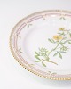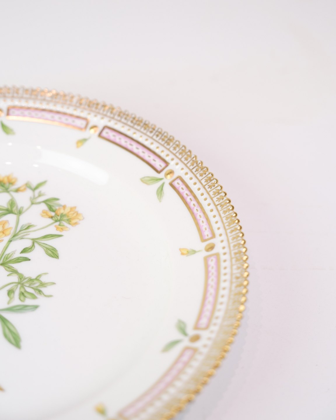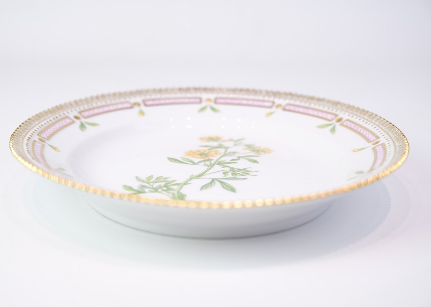 Beskrivelse: En frokosttallerken fra Royal Copenhagens serie "Flora Danica", dekoreret med håndmalet blomst og guldkant. Denne tallerken bærer dek. nr. 20/3550 og er fremstillet i 1960’erne.