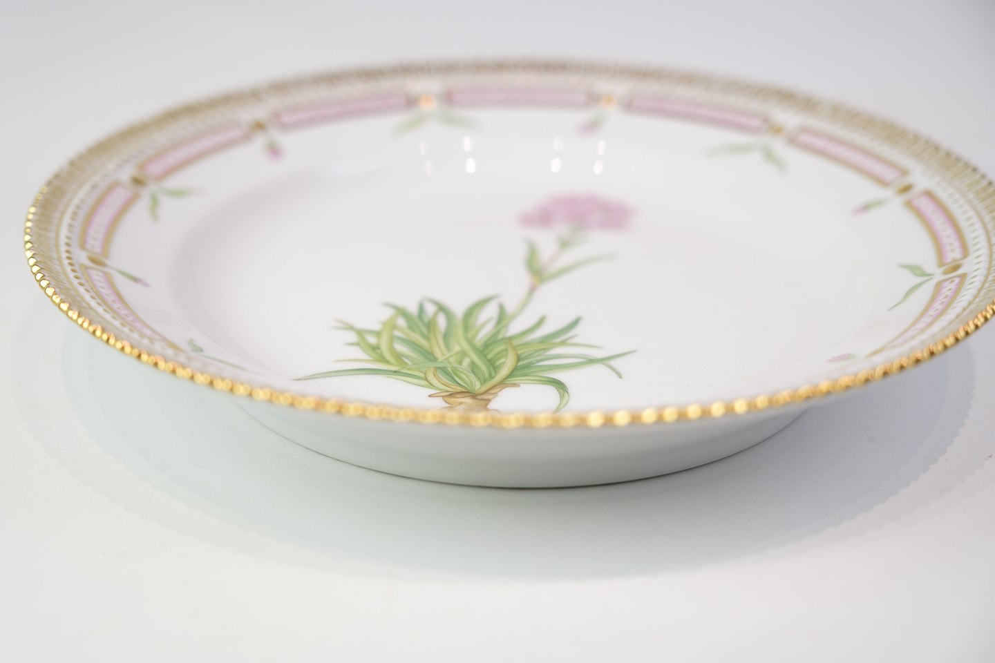 Beskrivelse: Flora Danica frokosttallerken fra Royal Copenhagen, dek. nr. 20/3550. Håndmalet og med guldkant. Fra 1960’erne.