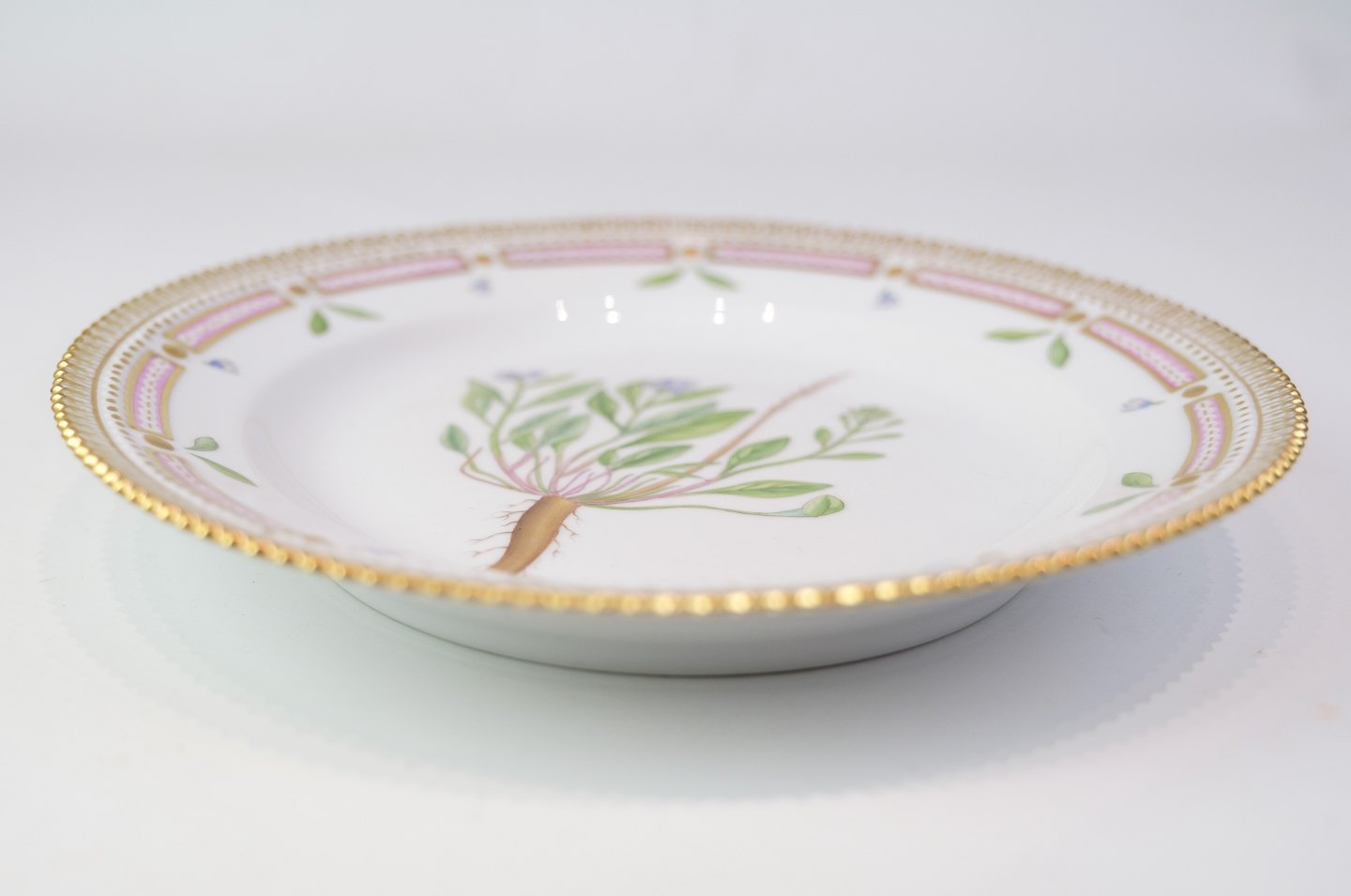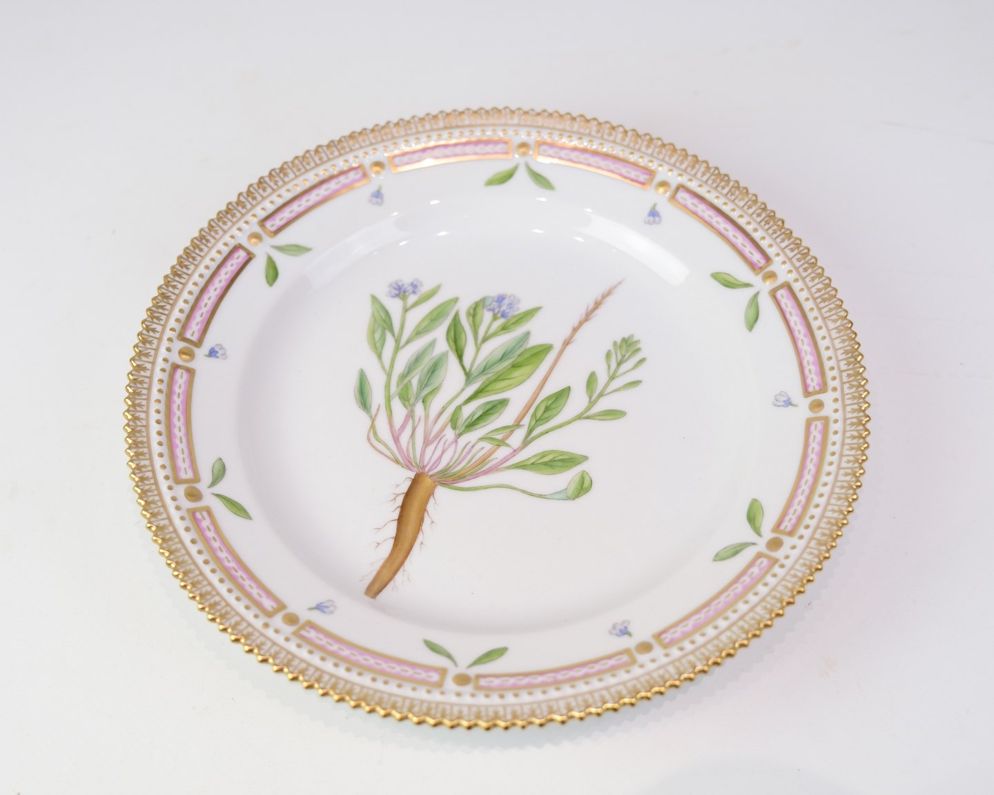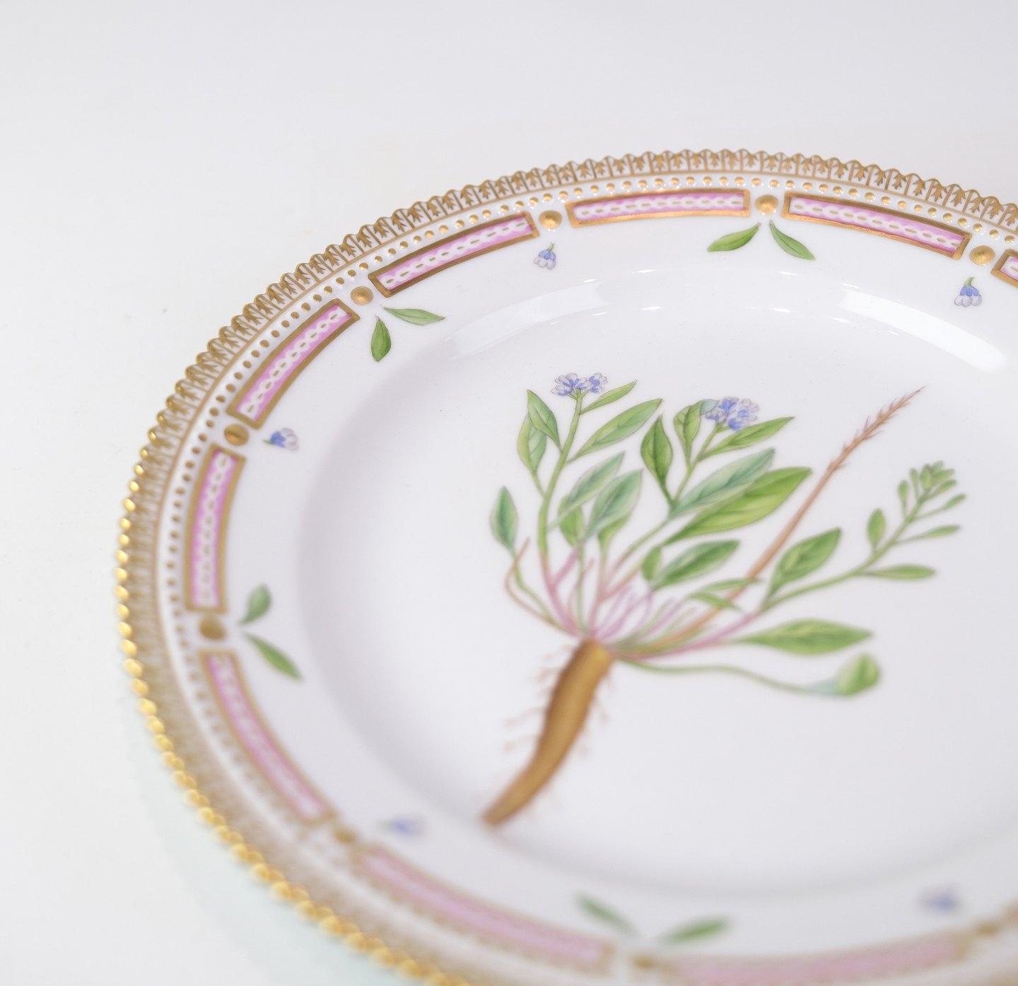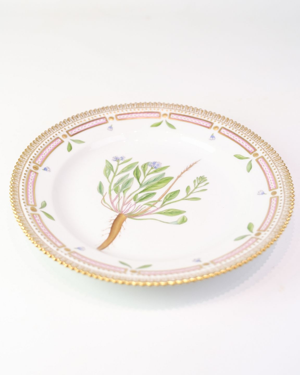 Beskrivelse: Frokosttallerken fra Flora Danica, dek. nr. 20/3550. Håndmalet og med guldkant. Royal Copenhagen, ca. 1960’erne.