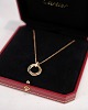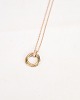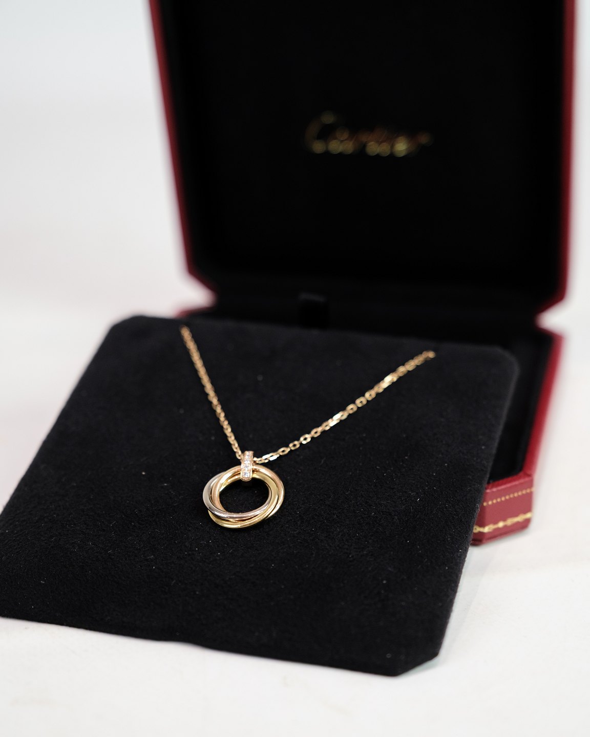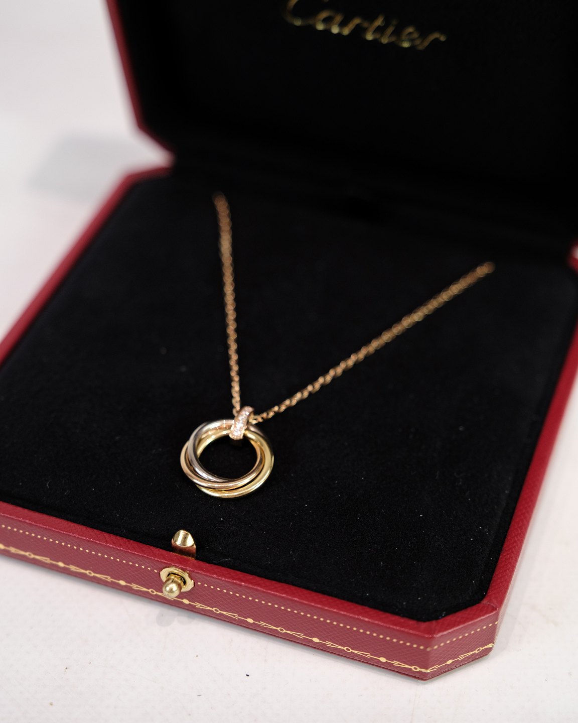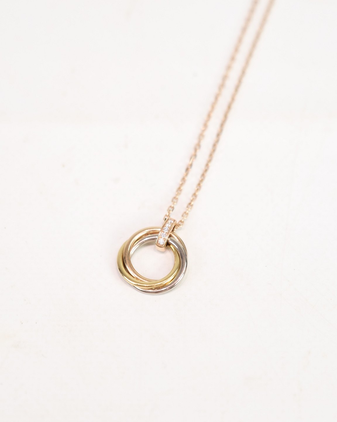 Description: Necklace from Cartier, from the Trinity collection. The chain is made of 750 rose gold with a safety clasp and adorned with a pendant consisting of three intertwined rings in white gold, rose gold and yellow gold - a classic Cartier signature.