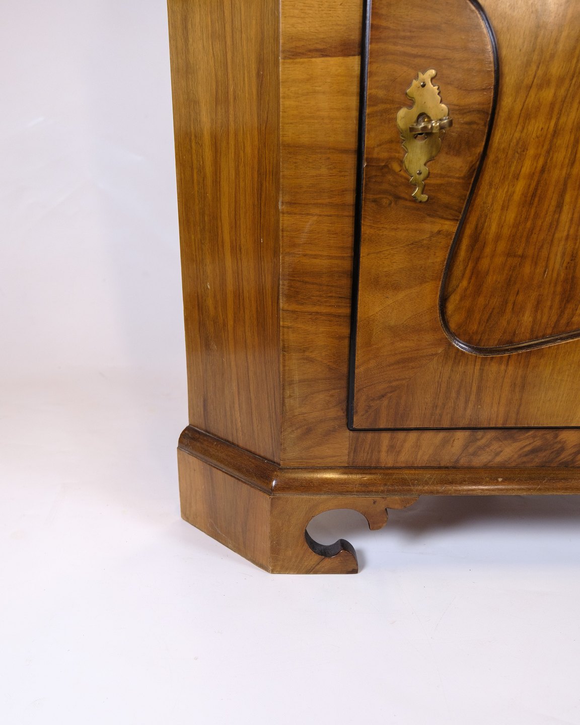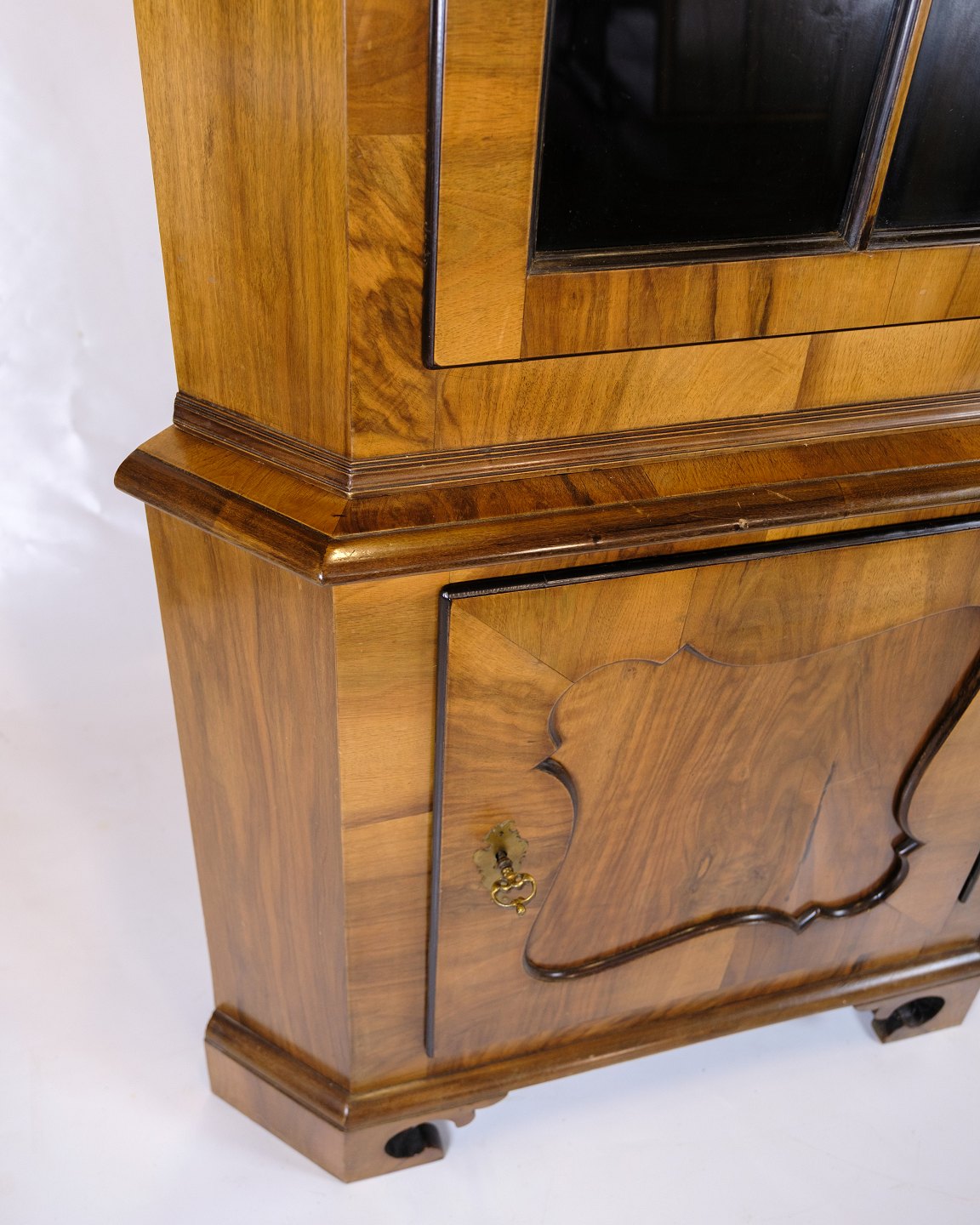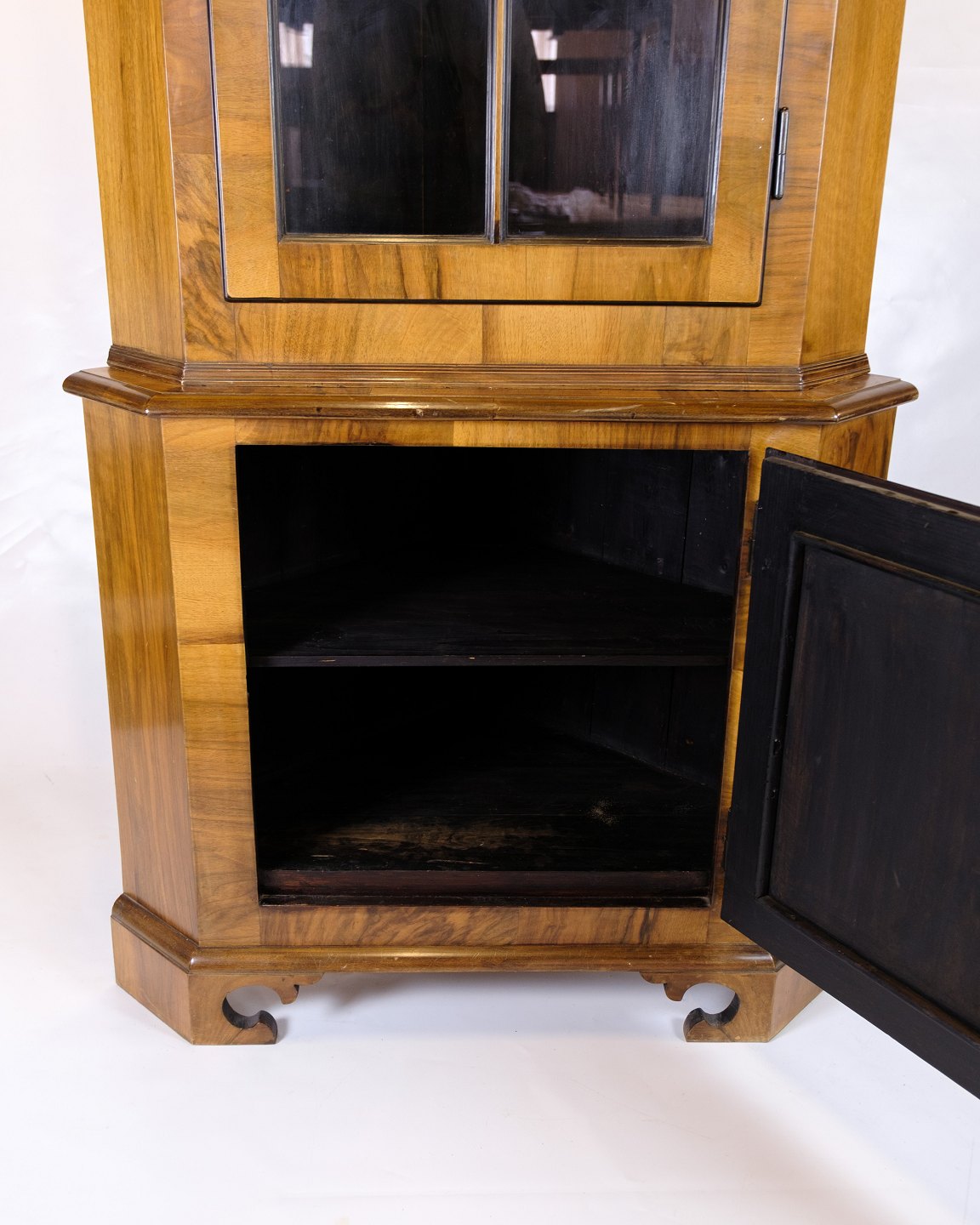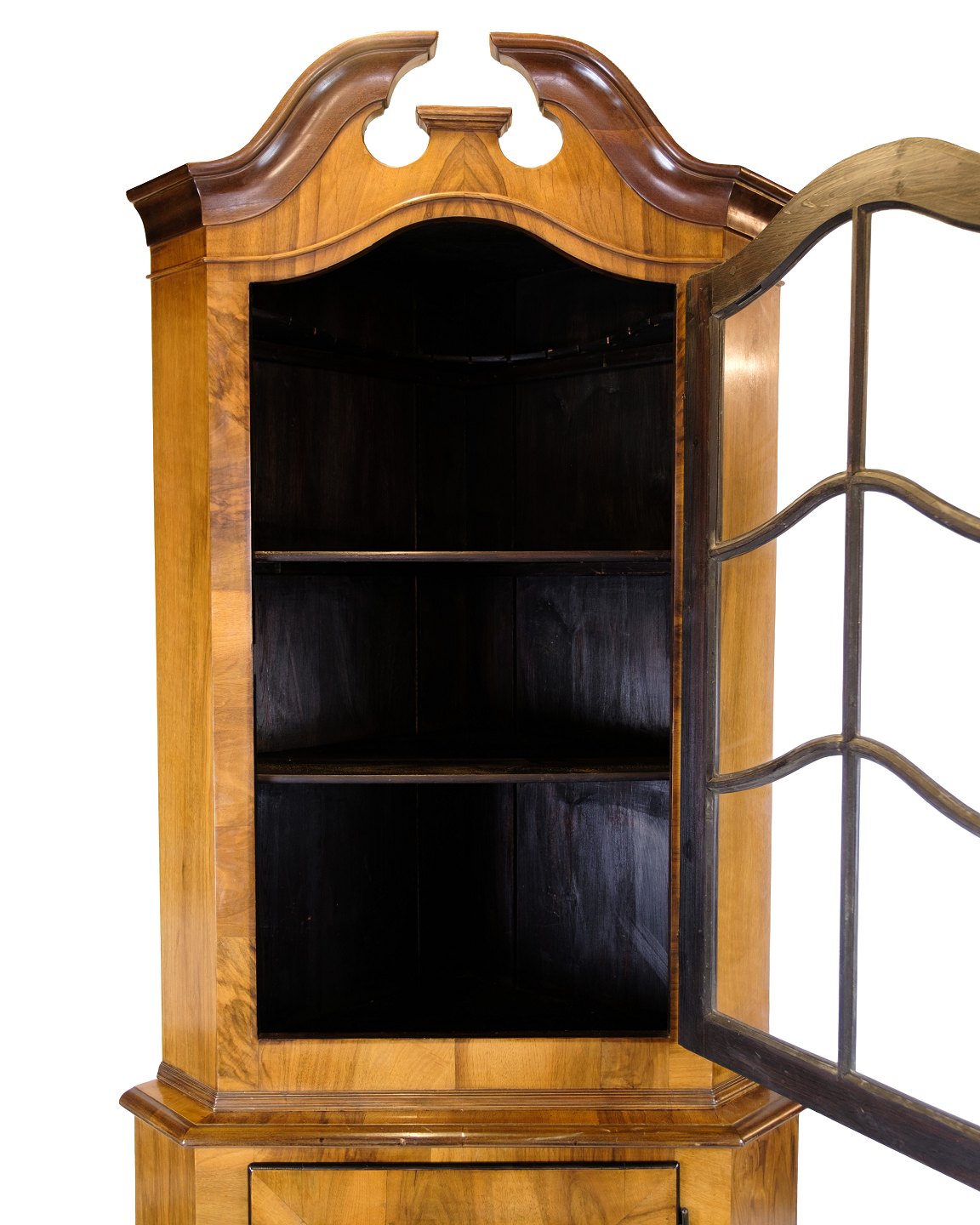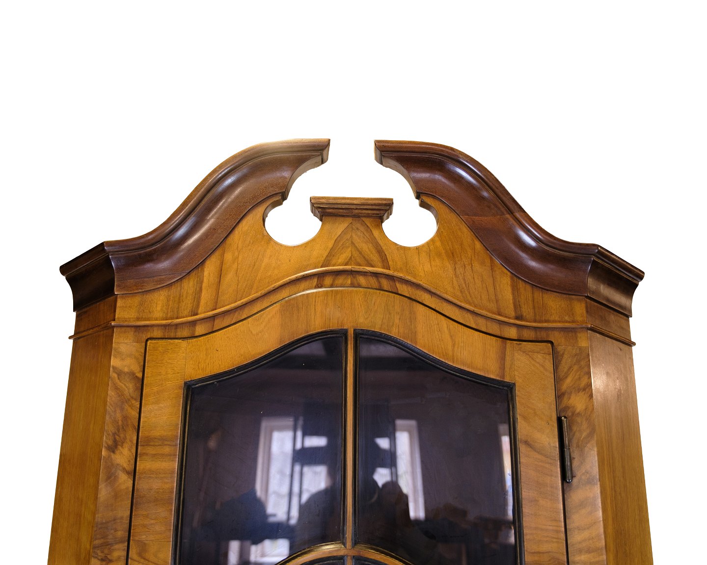 Description: Antique display cabinet in baroque style from around 1900. Made of walnut with glass door and bars. Elegant corner cabinet with a classic look.