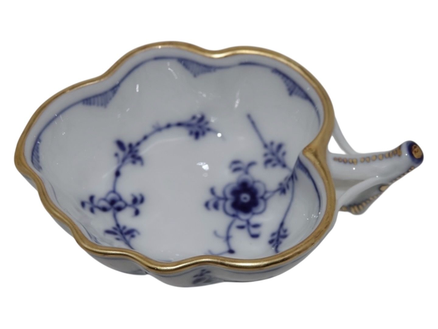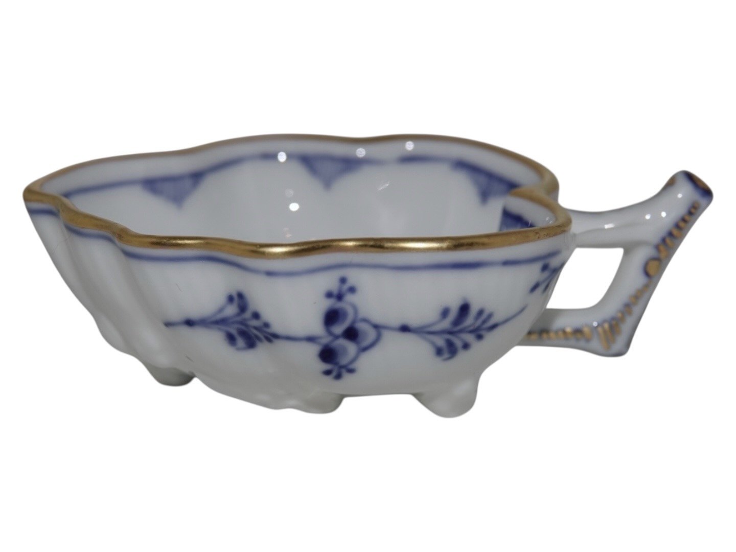 Beskrivelse: Royal Copenhagen Musselmalet Riflet med guldkant, sjælden lille skål med hank.