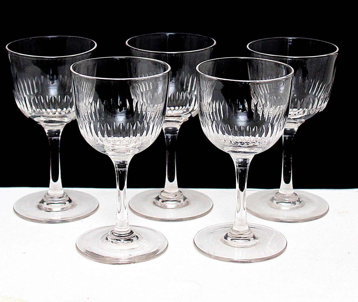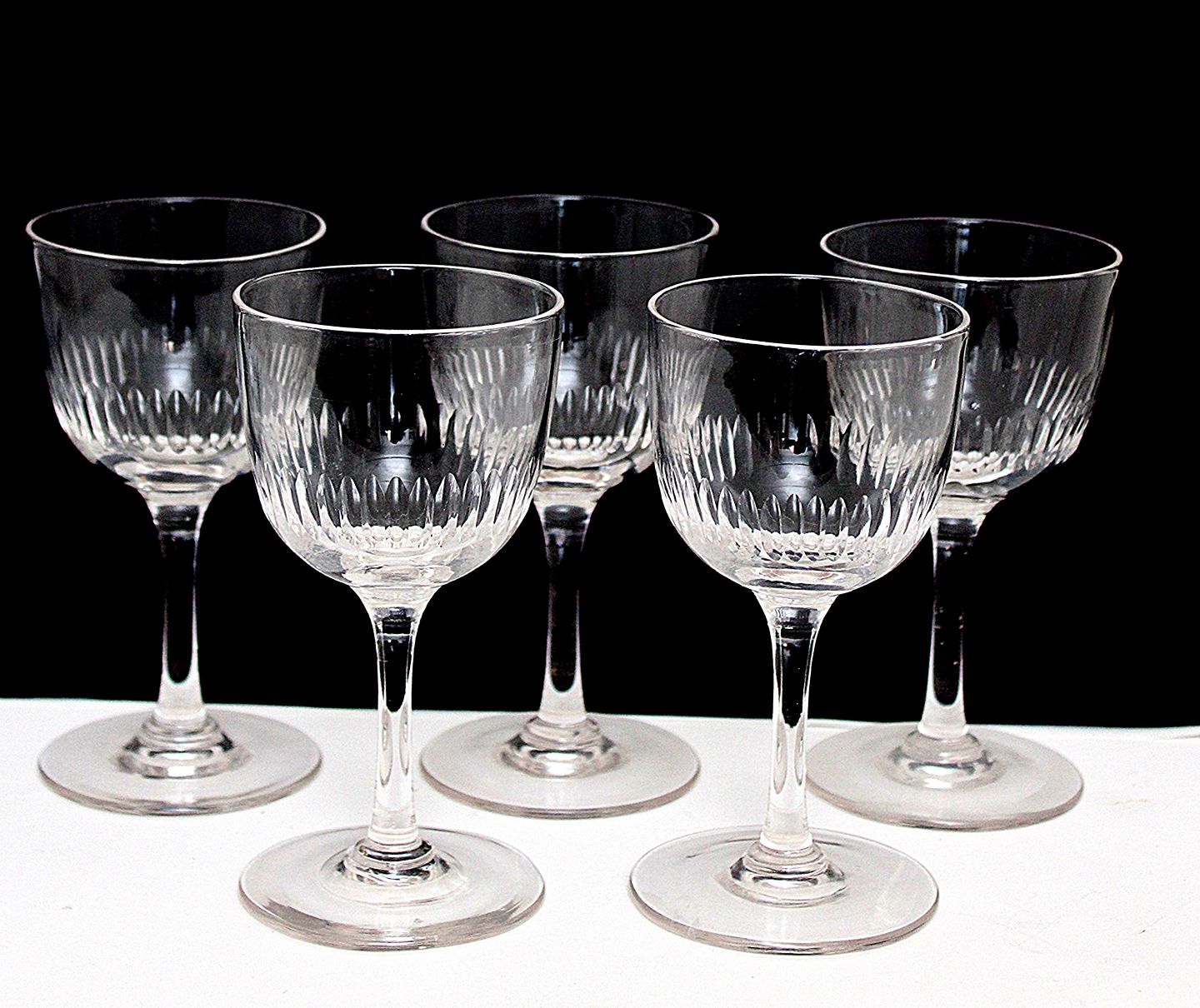 Beskrivelse: 5 krystalvinglas med slibning nederst på kumme og glat stilk. Højde 12,5 cm. Diameter 6,5 cm. Lille hvidvin eller stor hedvin. Samt 1 stort snaps eller portvin. Højde 12,5 cm. Diameter 5 cm. Alle 6 glas pris: 475 kr.