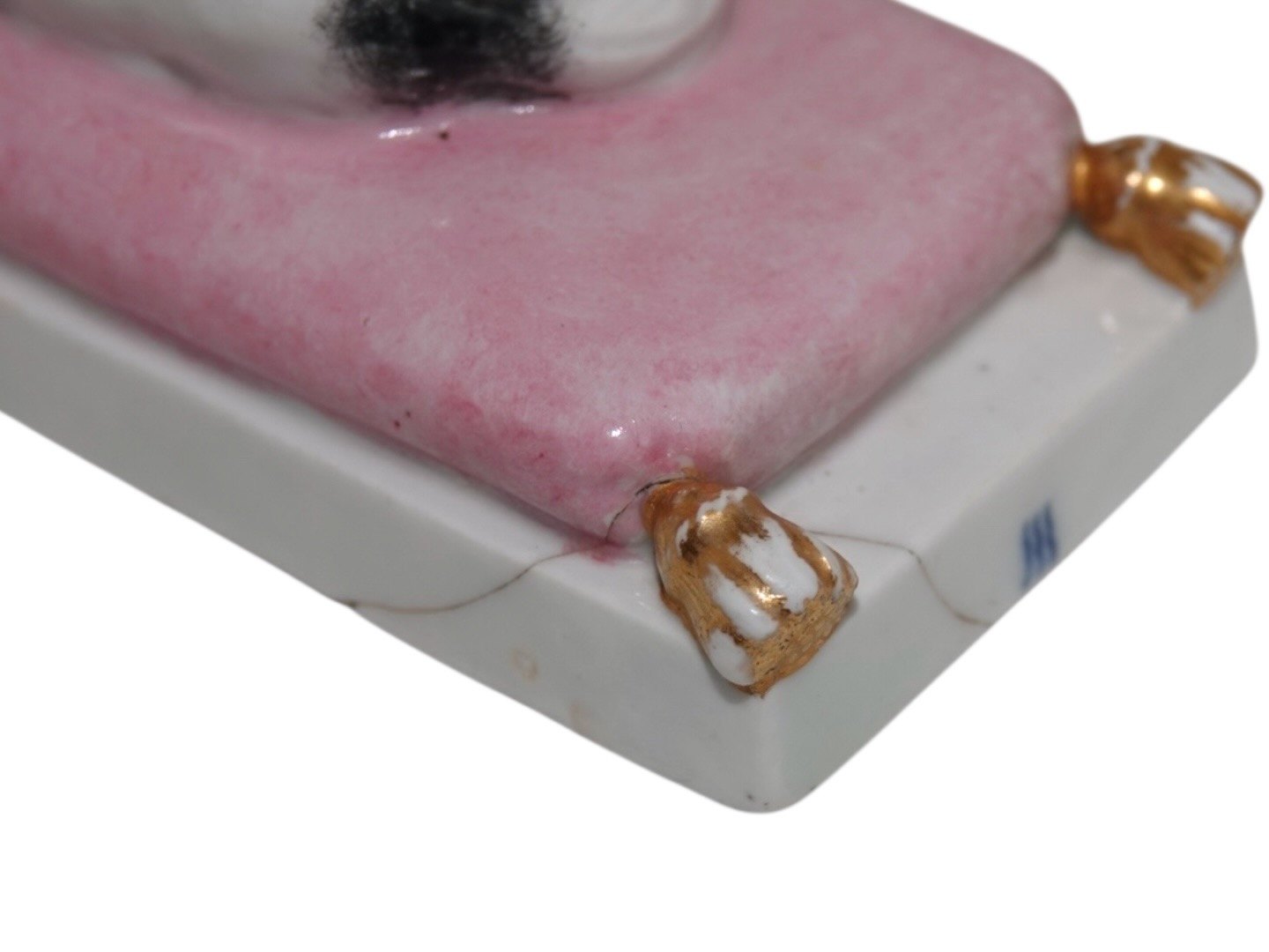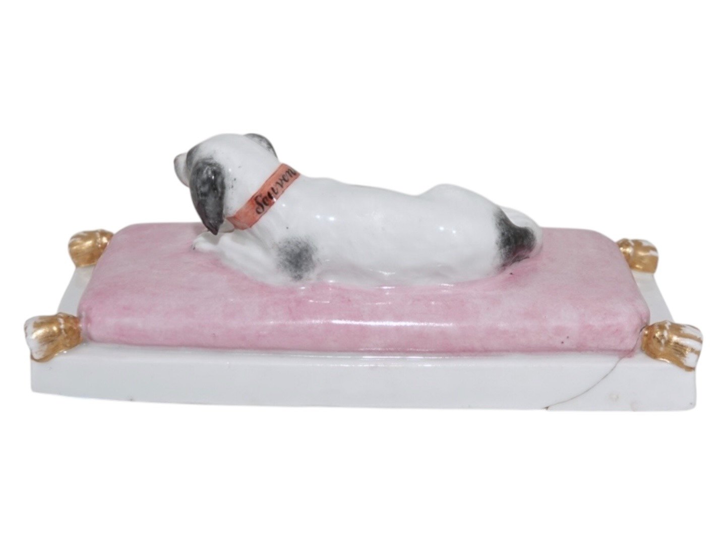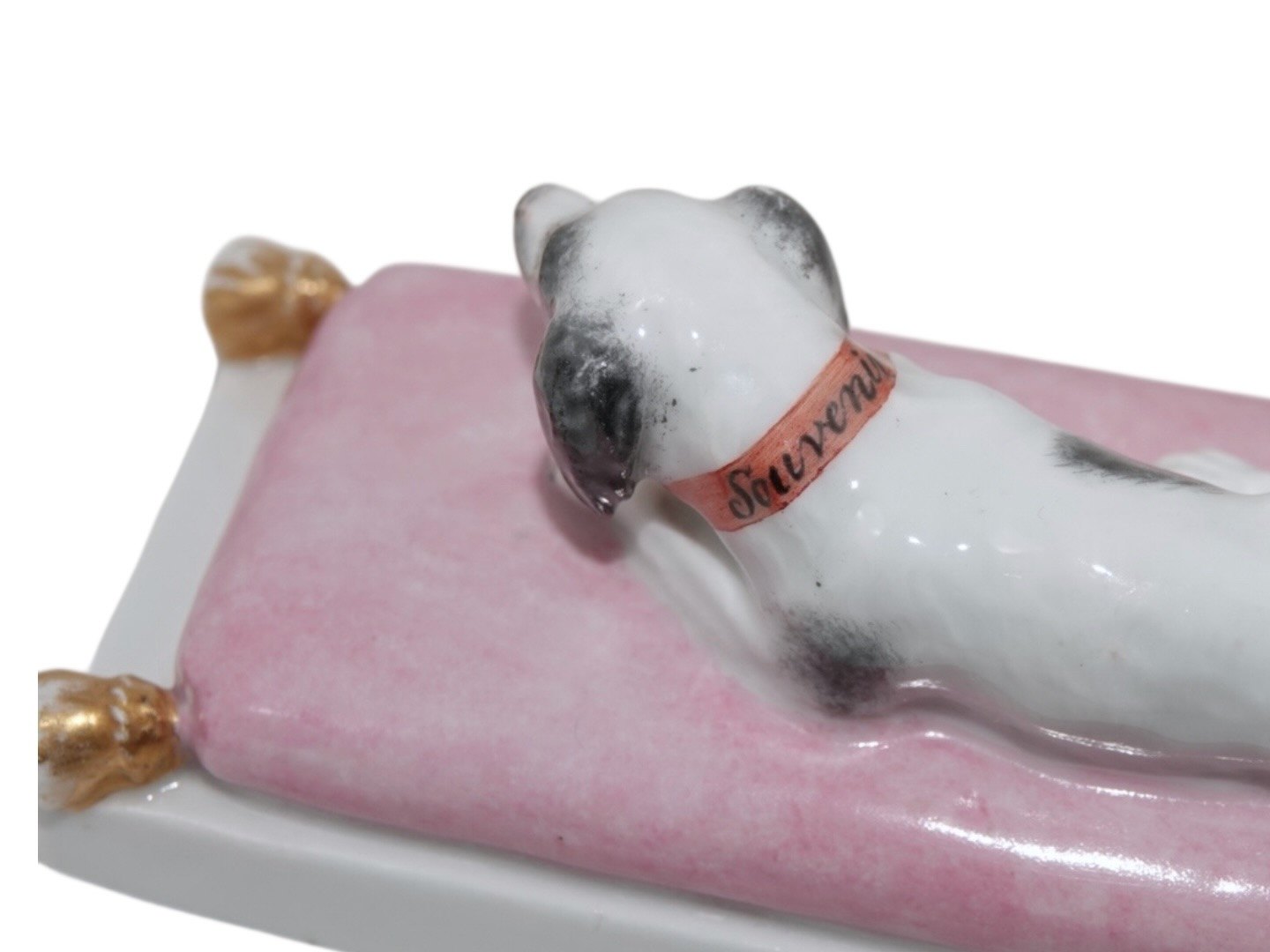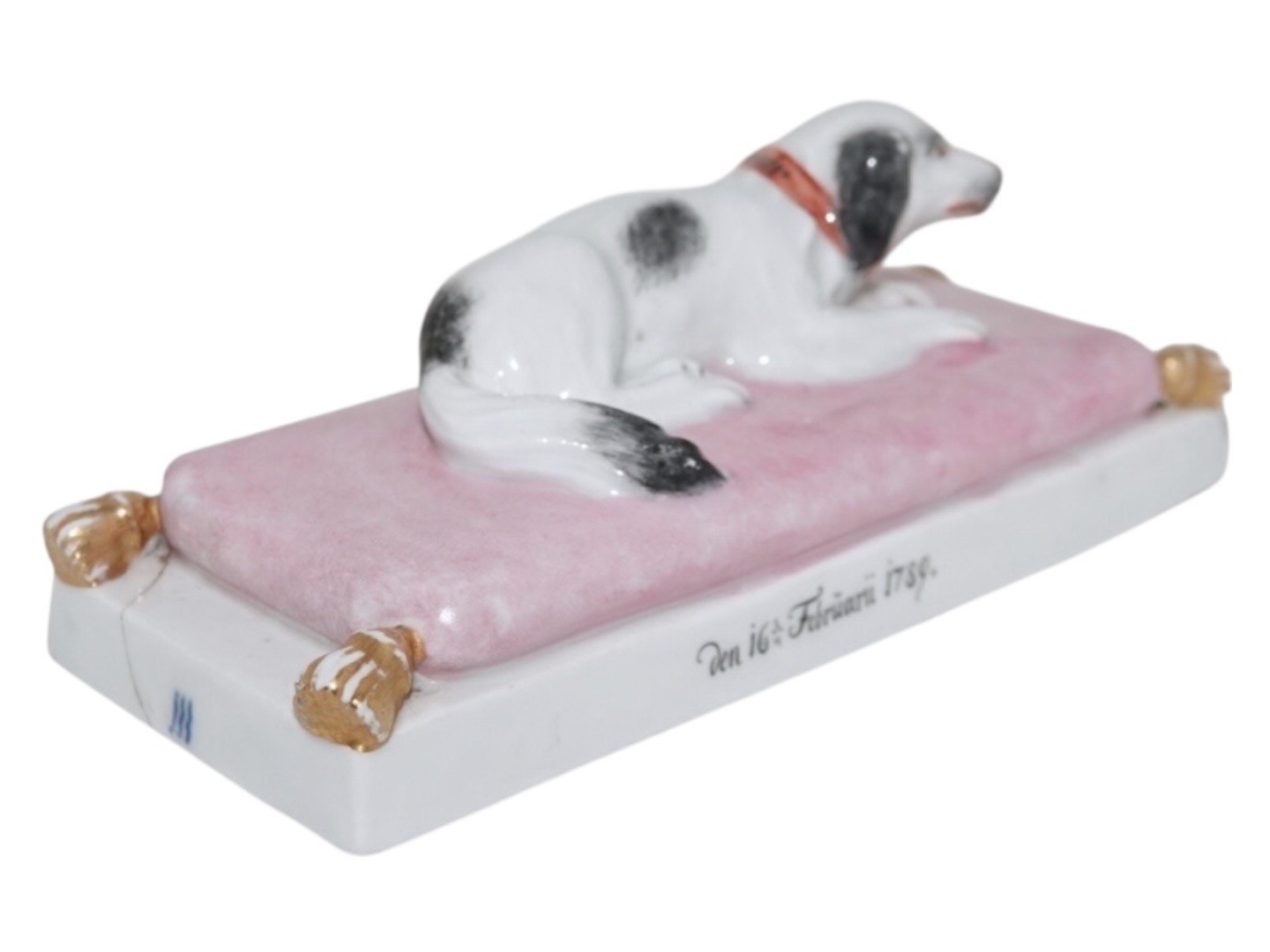 Beskrivelse: Royal Copenhagen porcelæn, brevpresse med hund liggede på en lyserød pude og med teksten "Den 16. Februarii 1789". På hundens halsbånd står der "Souvenir".