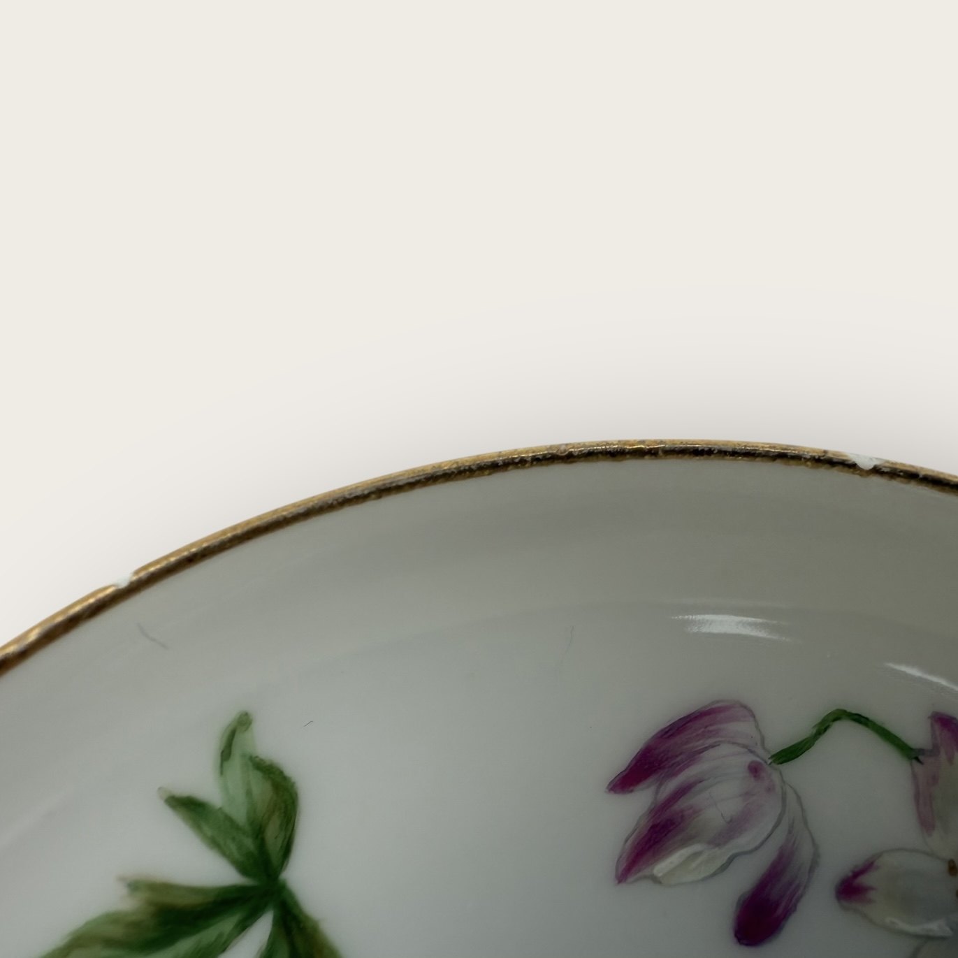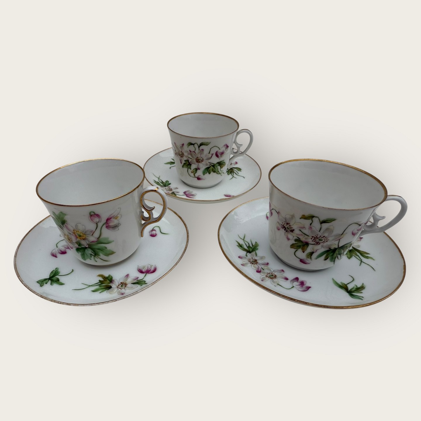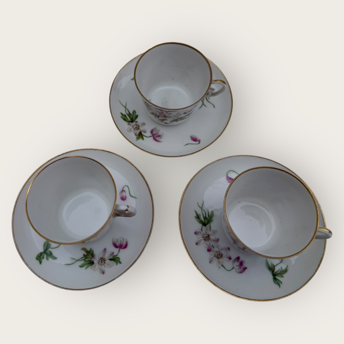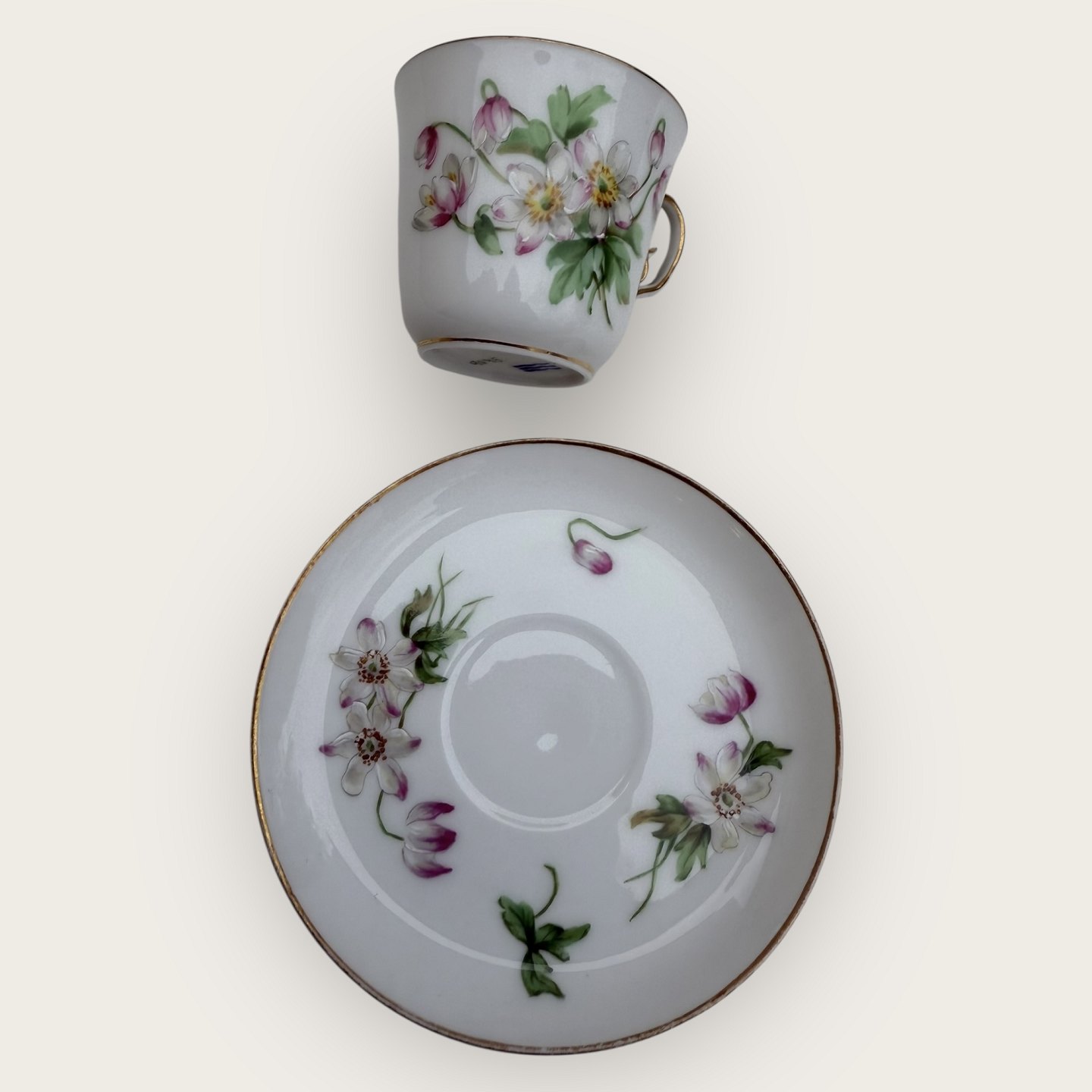 Description: Royal Copenhagen, small coffee cup in thin porcelain decorated with Anemones, #9075, Cup height 5.5cm, diameter 6.3cm, saucer diameter 8.5, Nice condition (The third cup has 2 small chips on the saucer (see photo) and costs 125kr)