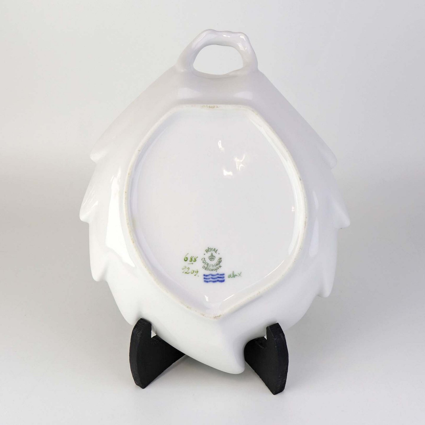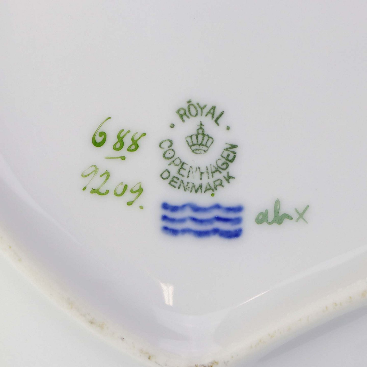 Beskrivelse: Bladformet kagefad i porcelæn fra stellet Brun rose. Nr. 688/9209
