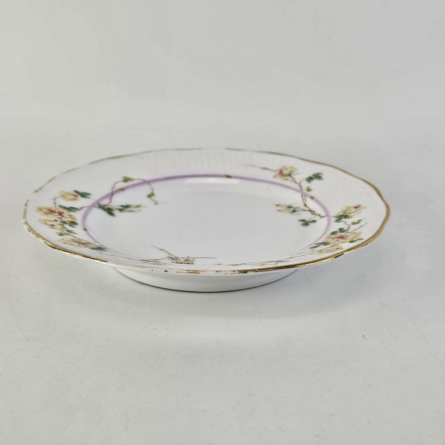 Service i hvidt porcelæn med hamret kantmønster dekoreret med gule blomsterranker og lyslilla streg. Stellet er med guldkant og det er mærket med bølger anvendt frem til 1890.