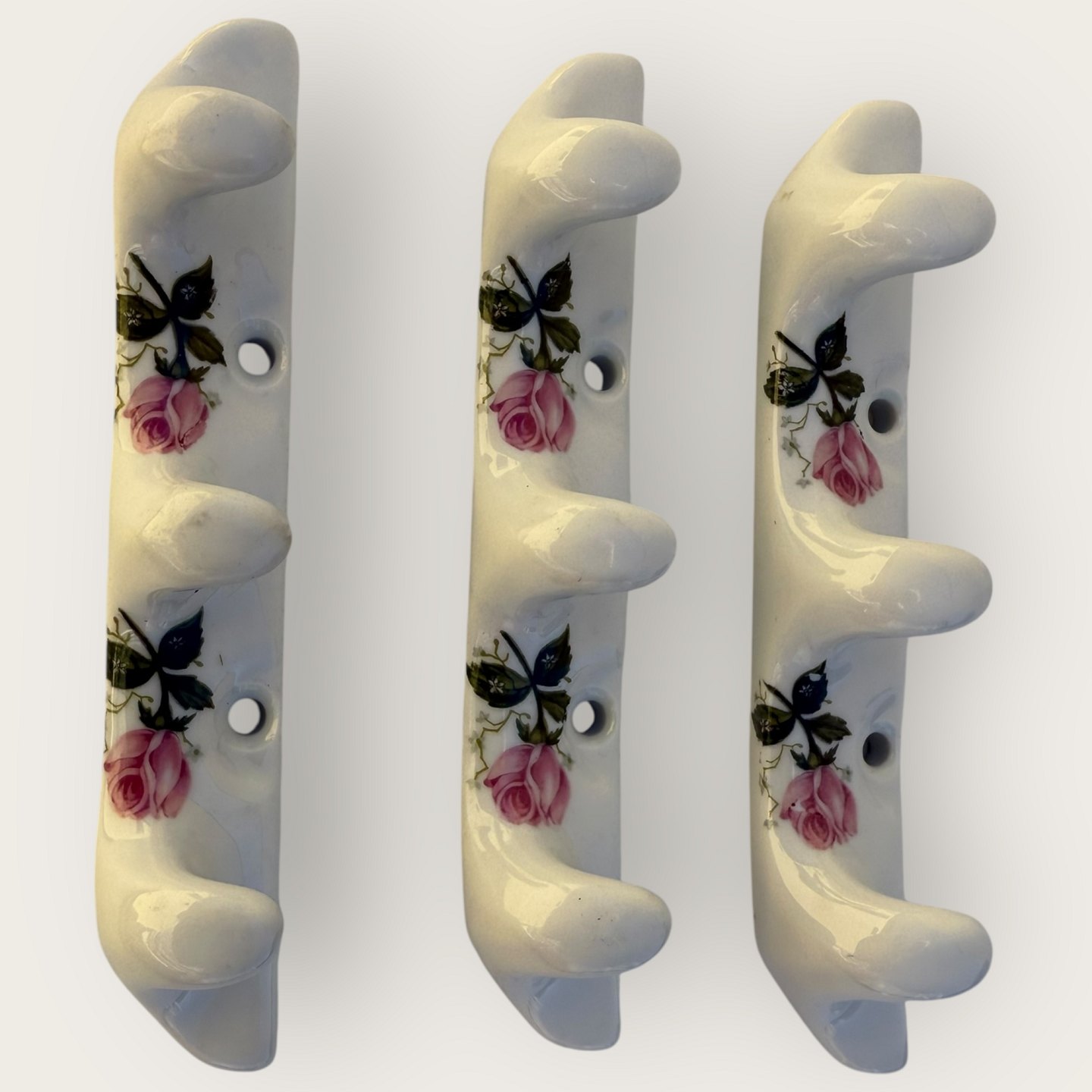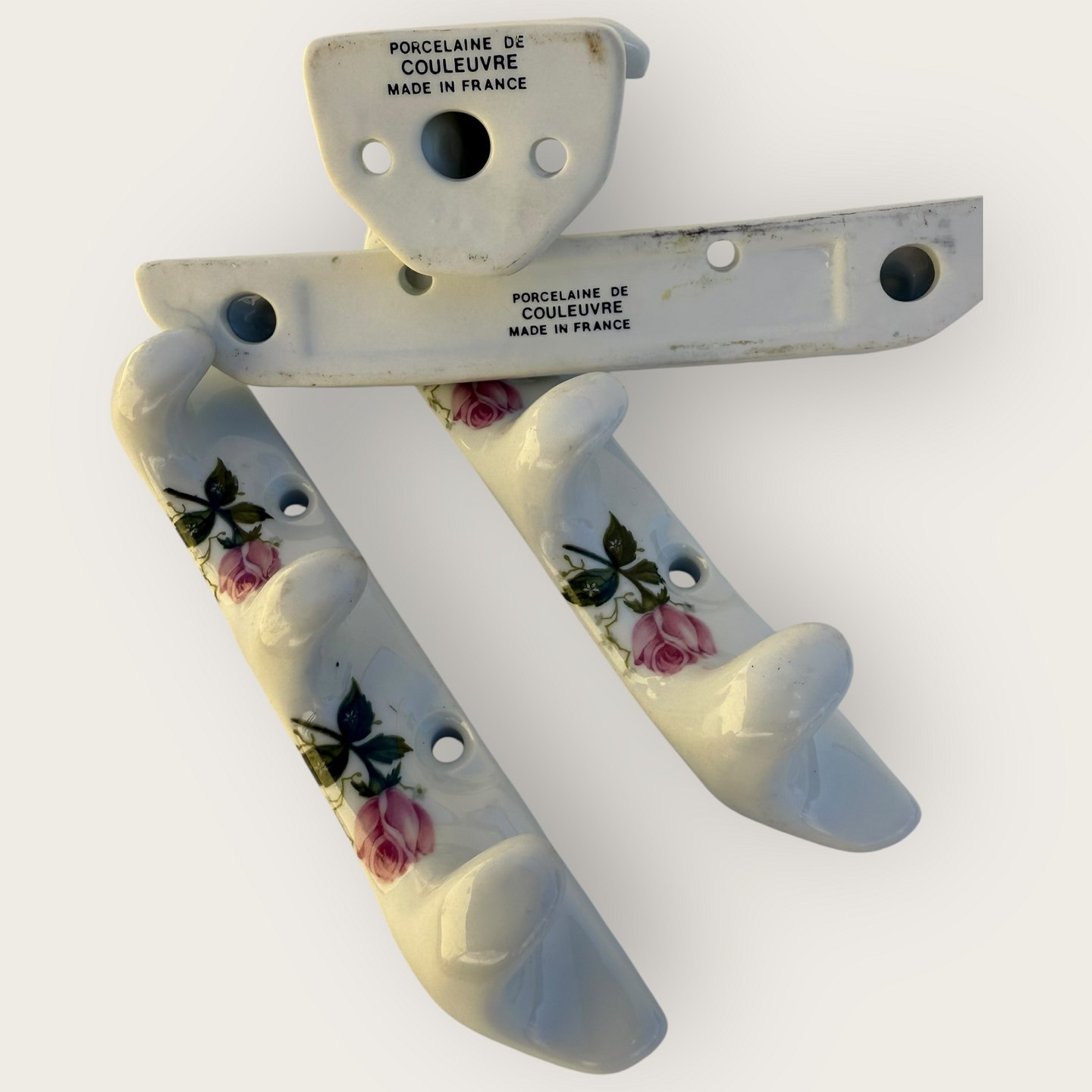 Description: Porcelaine de Couleuvre, Made in France, Coat hooks with roses, The three are 16cm long, fine condition