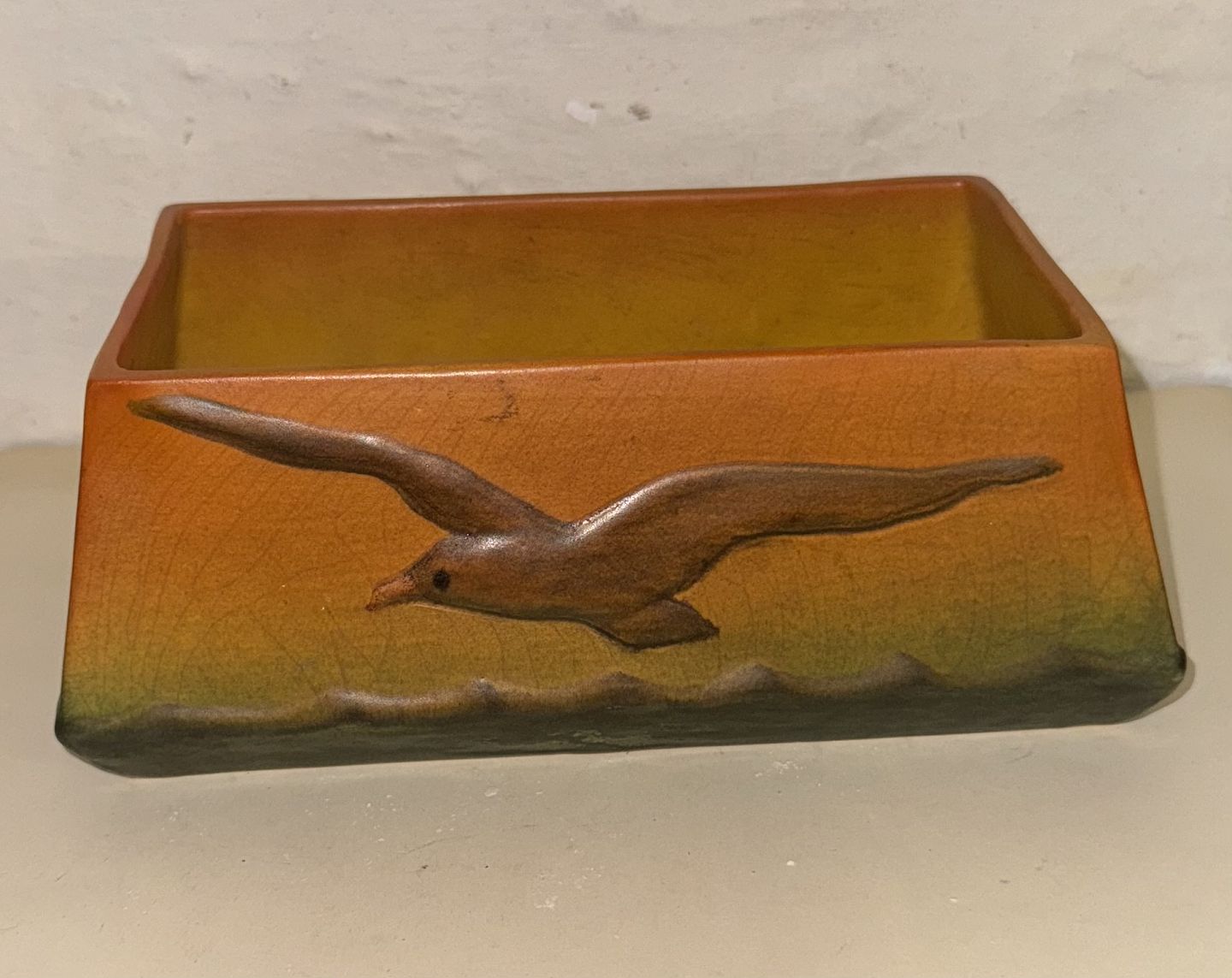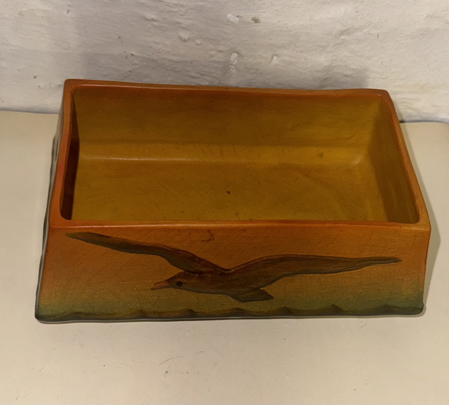 Beskrivelse: Skål i keramik fra Peter Ipsens Enke. Dekoreret med måger i relief. Fremstår i god stand. Fabriksmærkwt på bunden. Mål: H. 7,3 cm samt 11 x 18,5 cm.