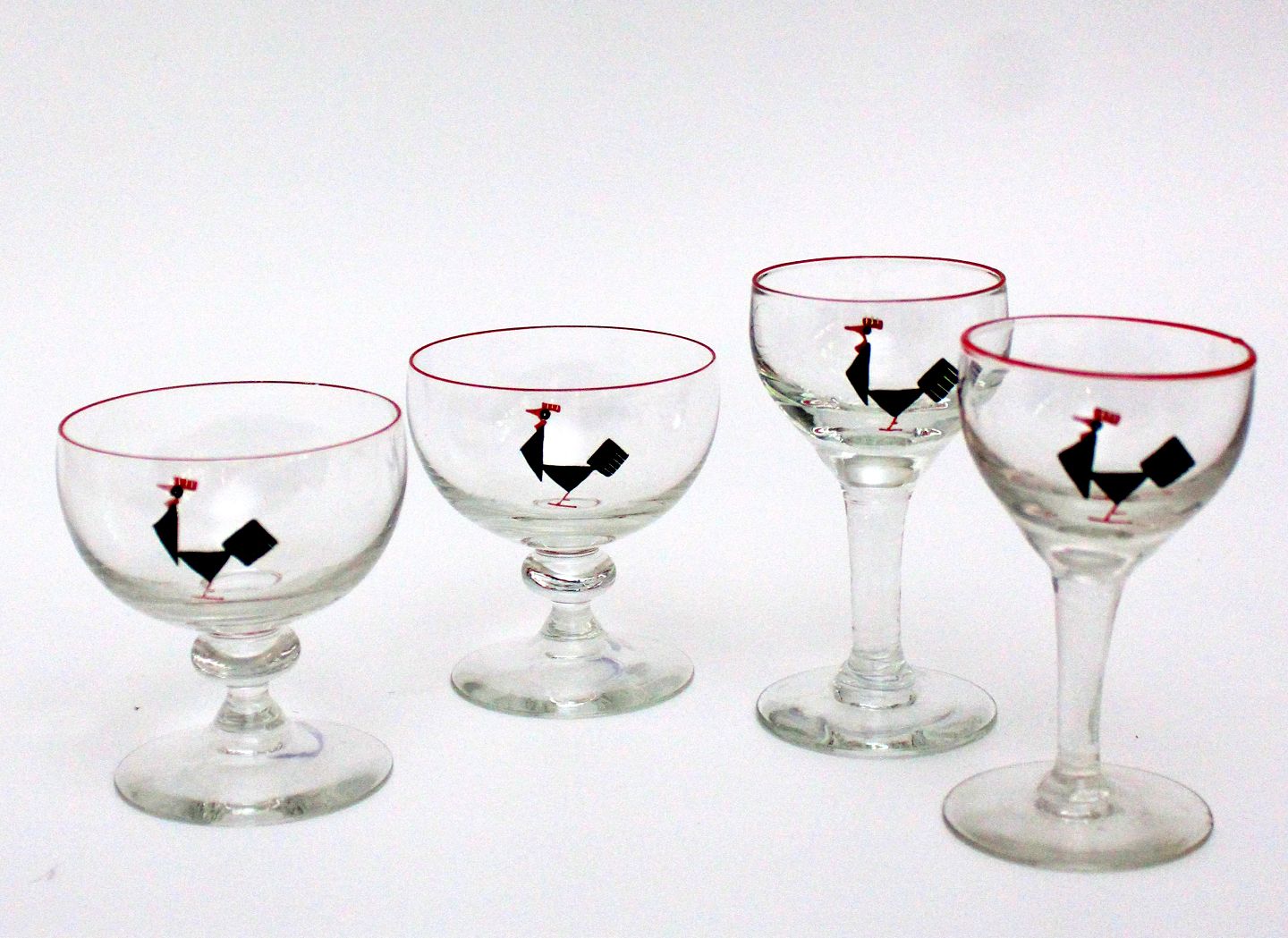 Beskrivelse: Holmegaard Glasværk, Likør og snapseglas med emaljebemalet sort hane og rød kant. Designet af Jacob E. Bang og fremstillet på Malerstuen i Nyhavn 12 i perioden 1937-1957.