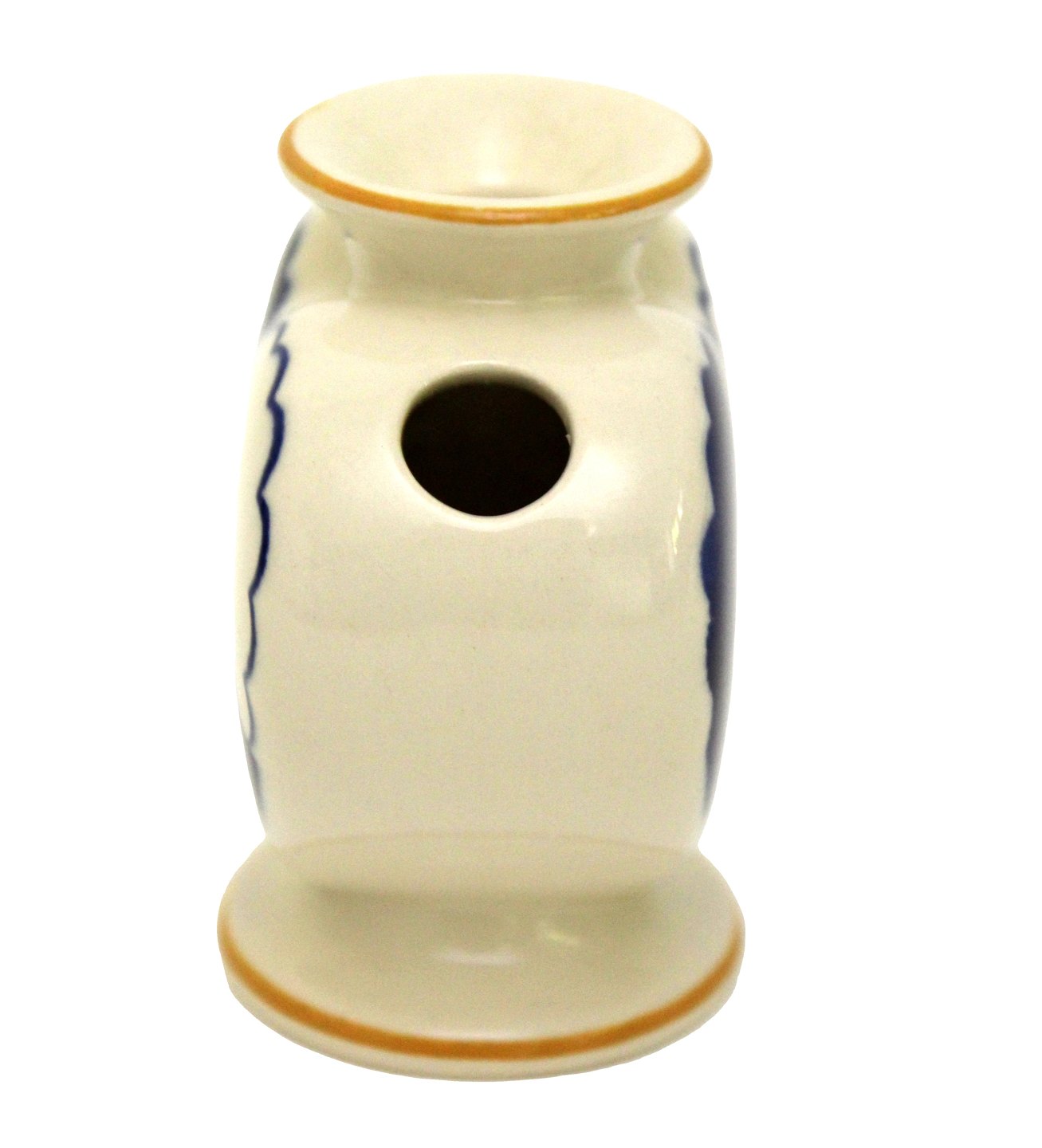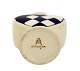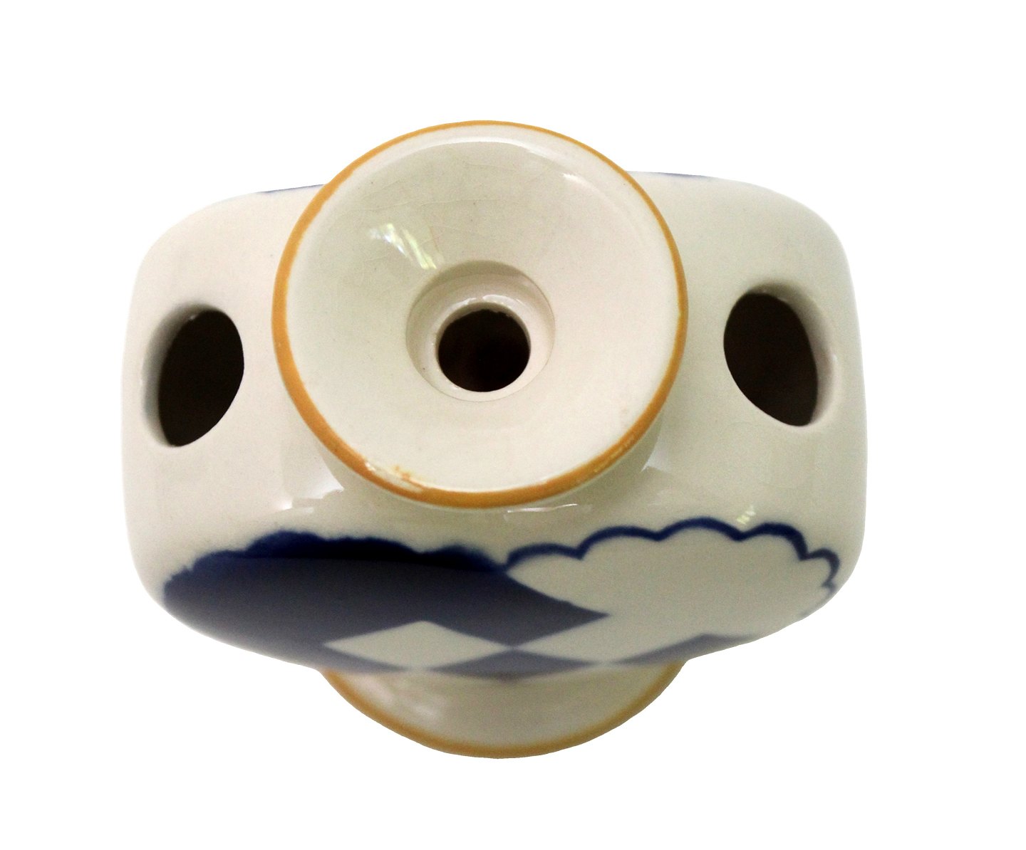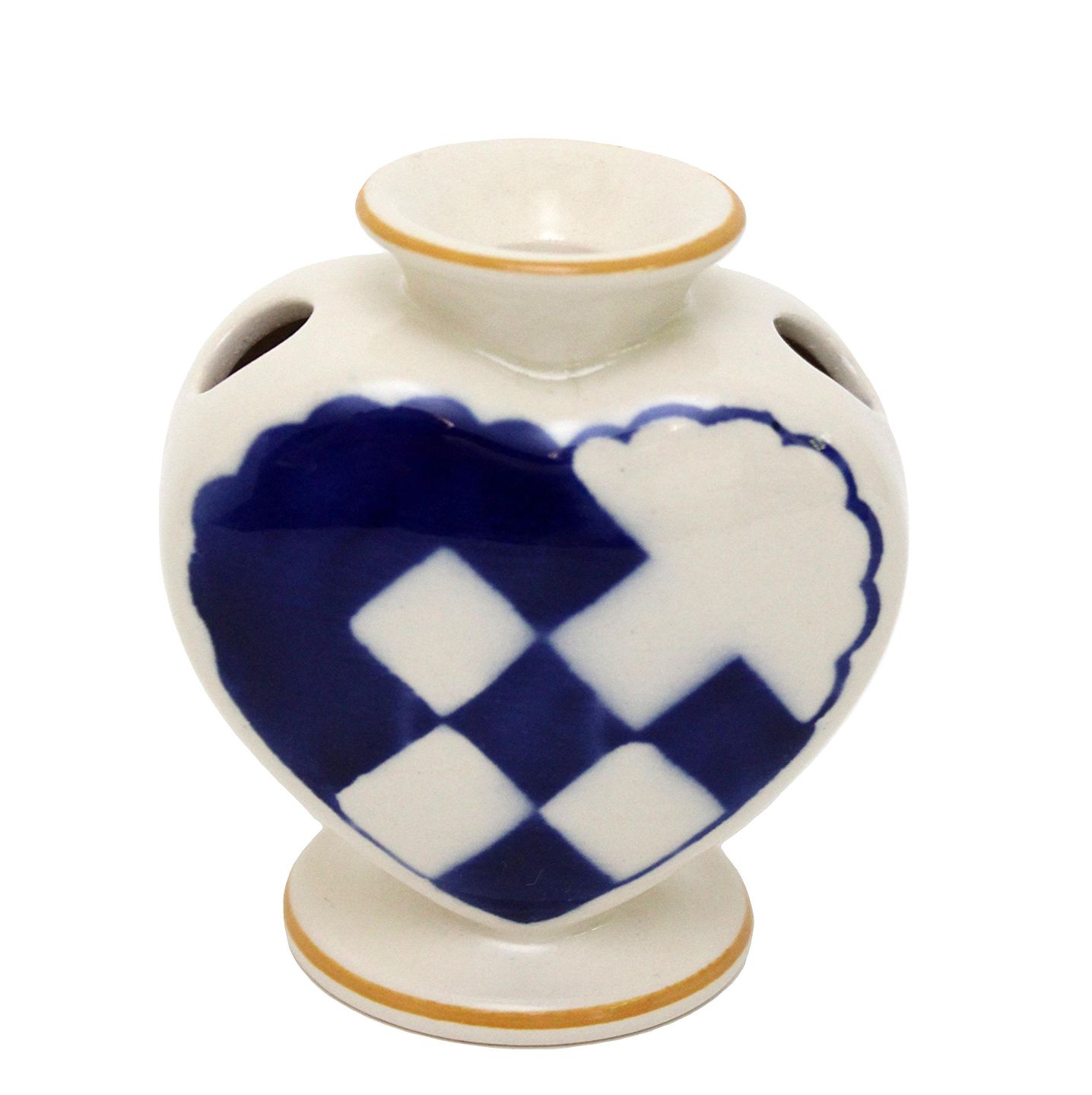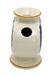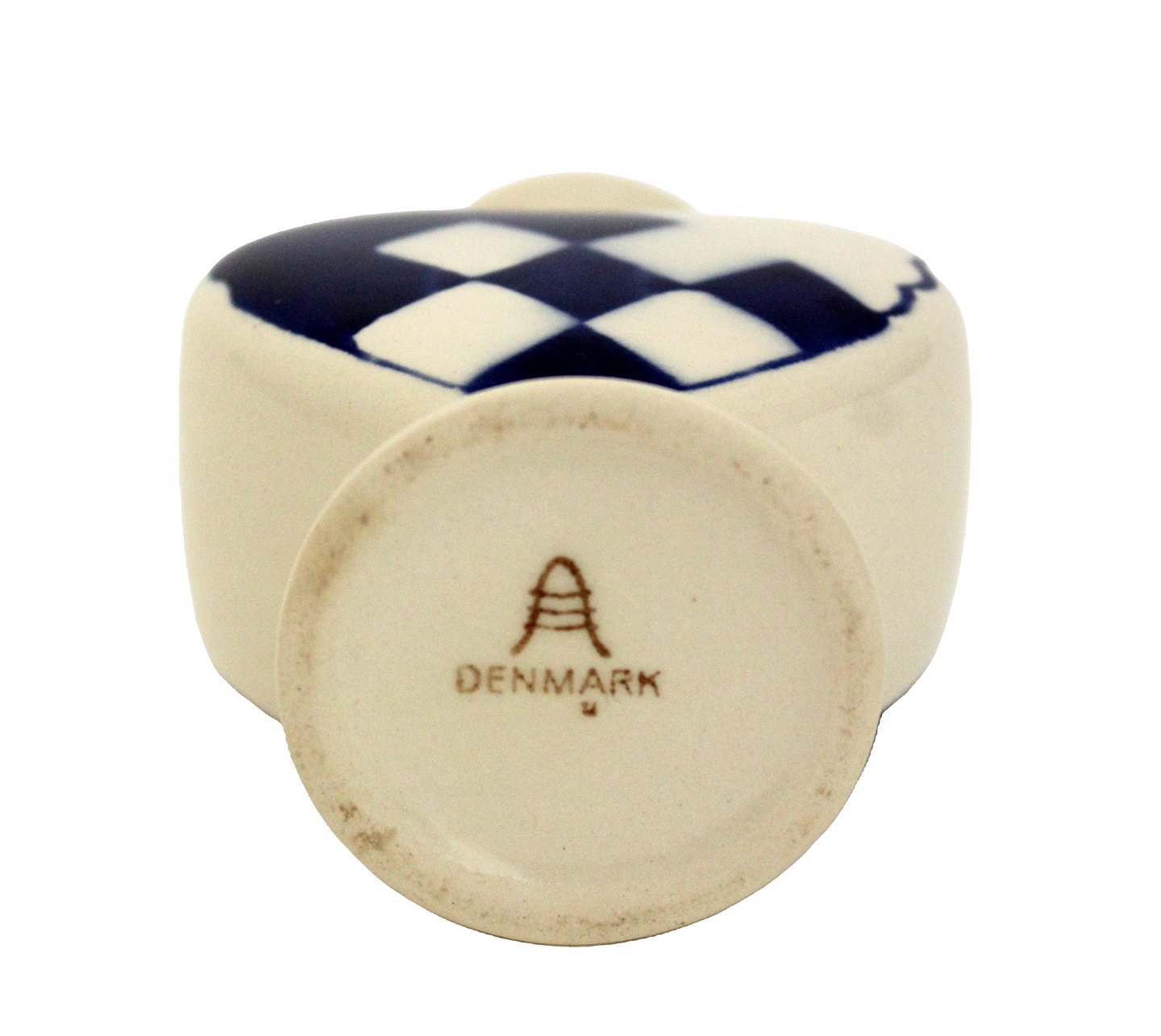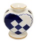 Beskrivelse: Aluminia, Blåt Julehjerte med gule kanter. Flot stand med få overfladekrakeleringer under kraven og manglende gul farve på kanten. Designet af Hans Henrik Hansen i 1944. Højde 7,7 cm. Bredde 7,6 cm. Pris: 1300 kr.