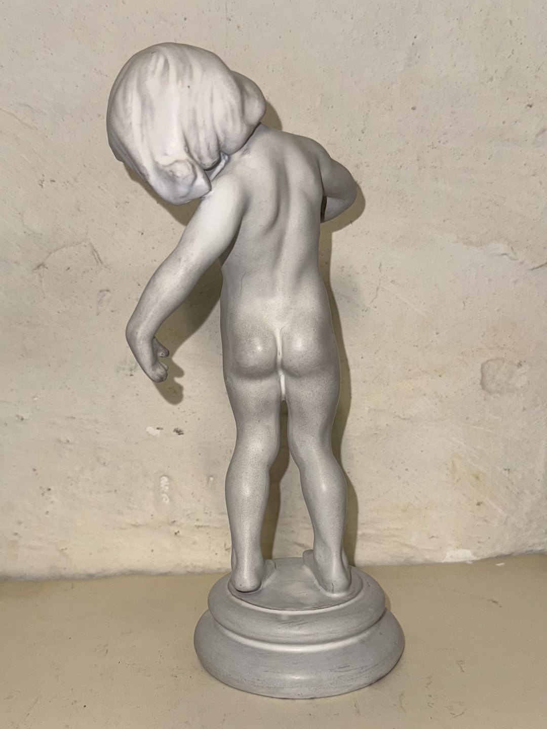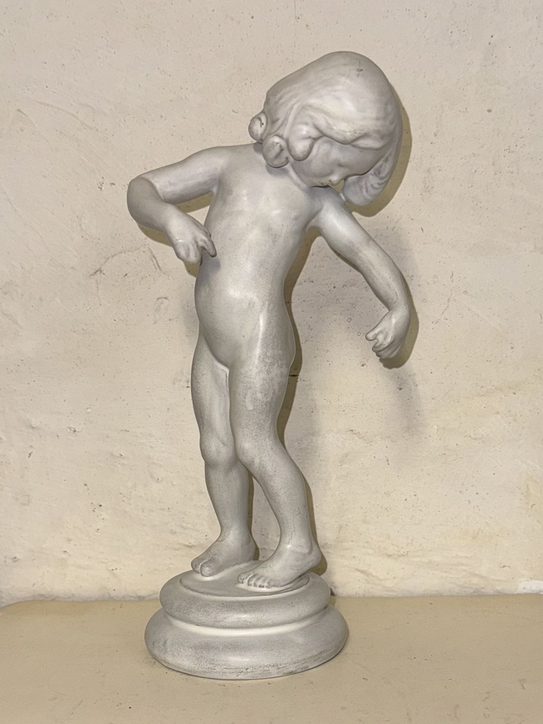 Beskrivelse: Venus Kalypogos: Figur i hvid glaseret keramik af stående pige på rund base. Udført af den danske billedhugger Kai Nielsen for Kähler fabrikken. Fremstår i perfekt stand. H. 22,5 cm. Fabriksmærket på bunden.