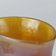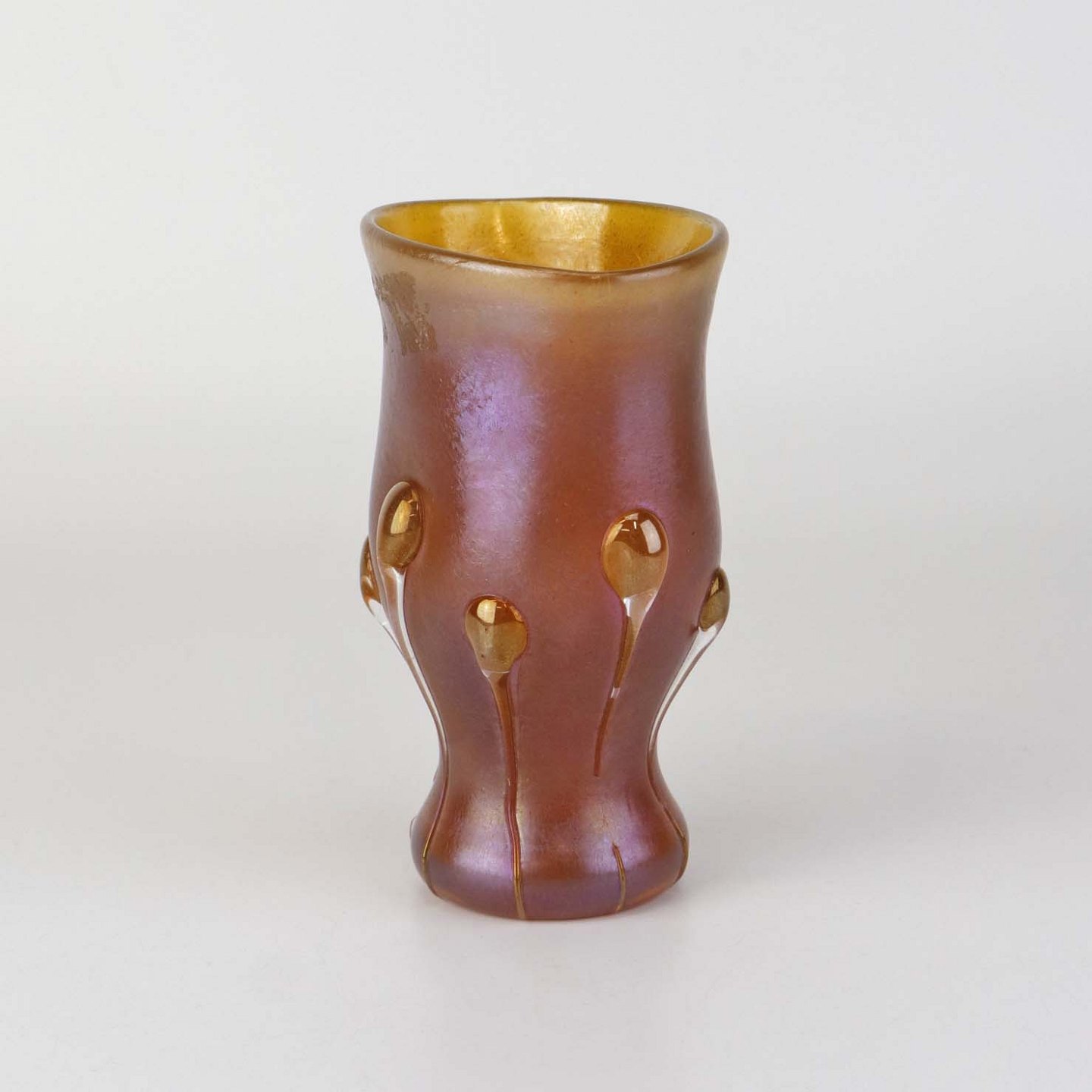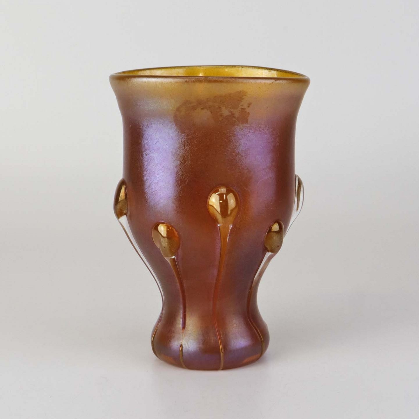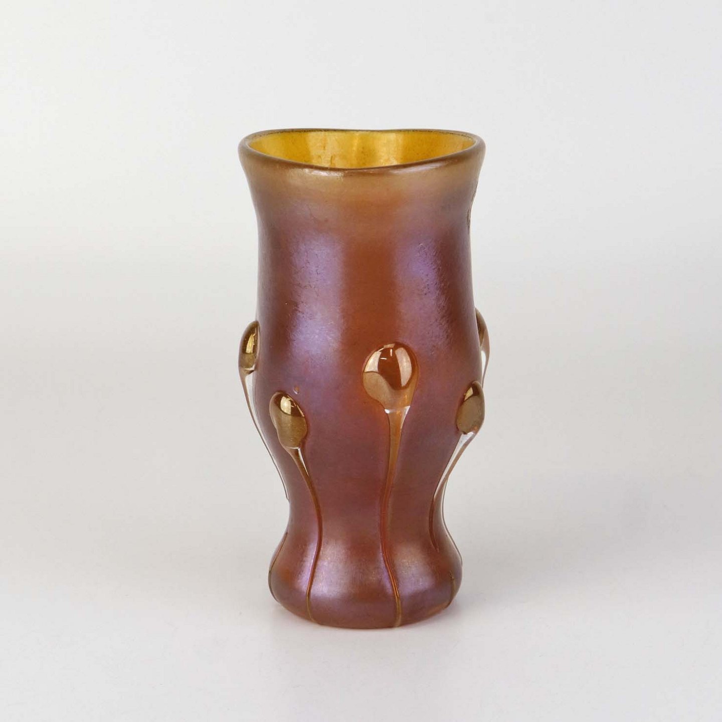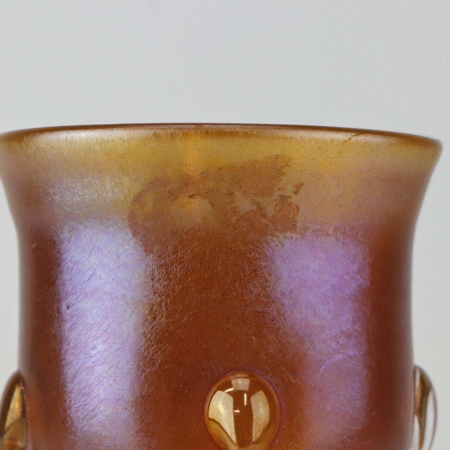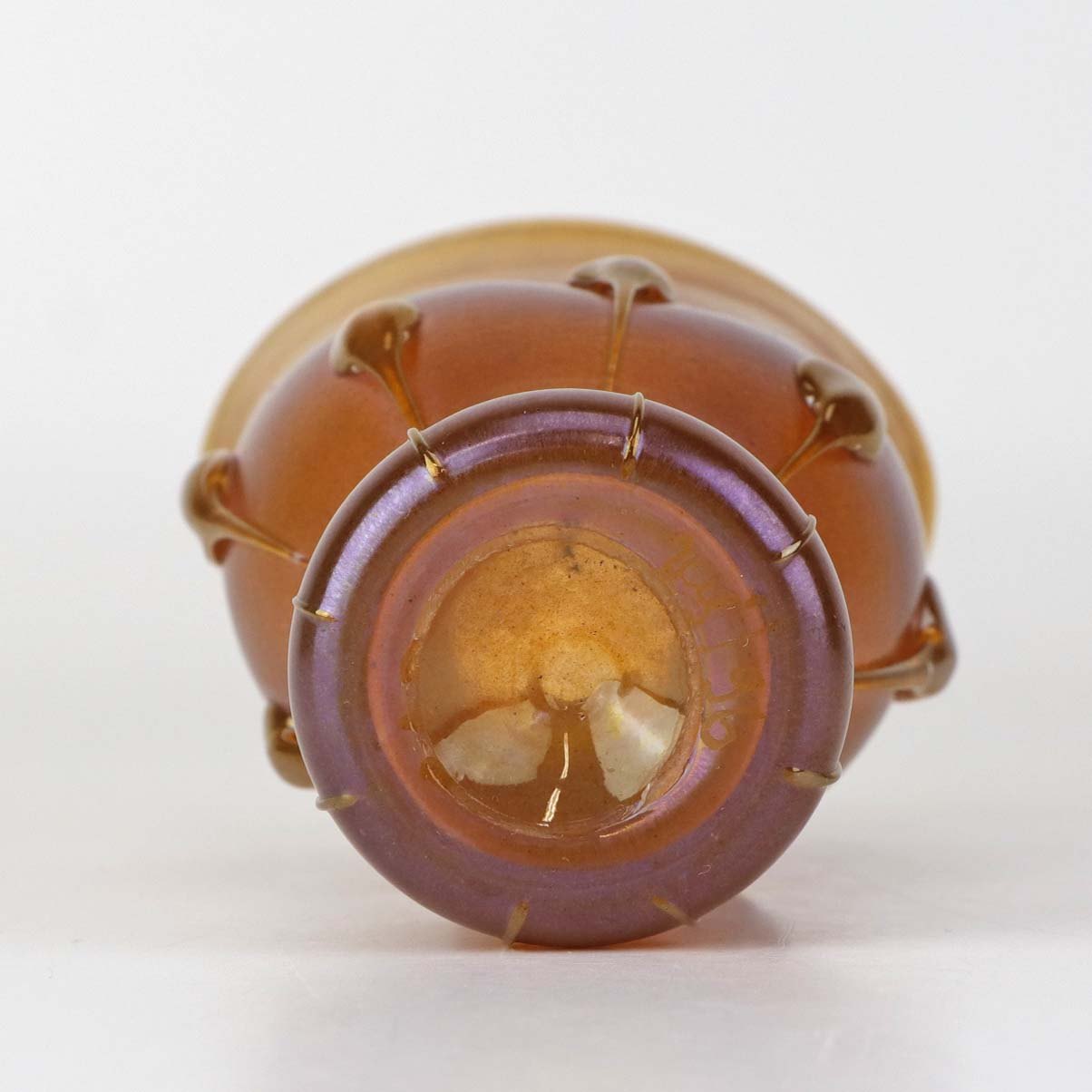 Beskrivelse: Kunstglas vase i Tiffany favrile glas med metallisk orange skær og haletudse dekoration. Model Tadpole.