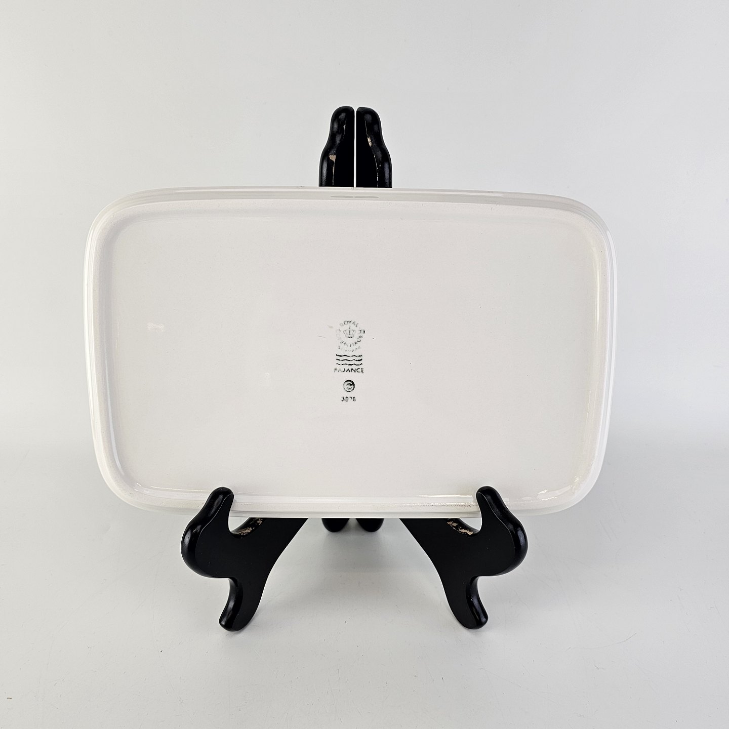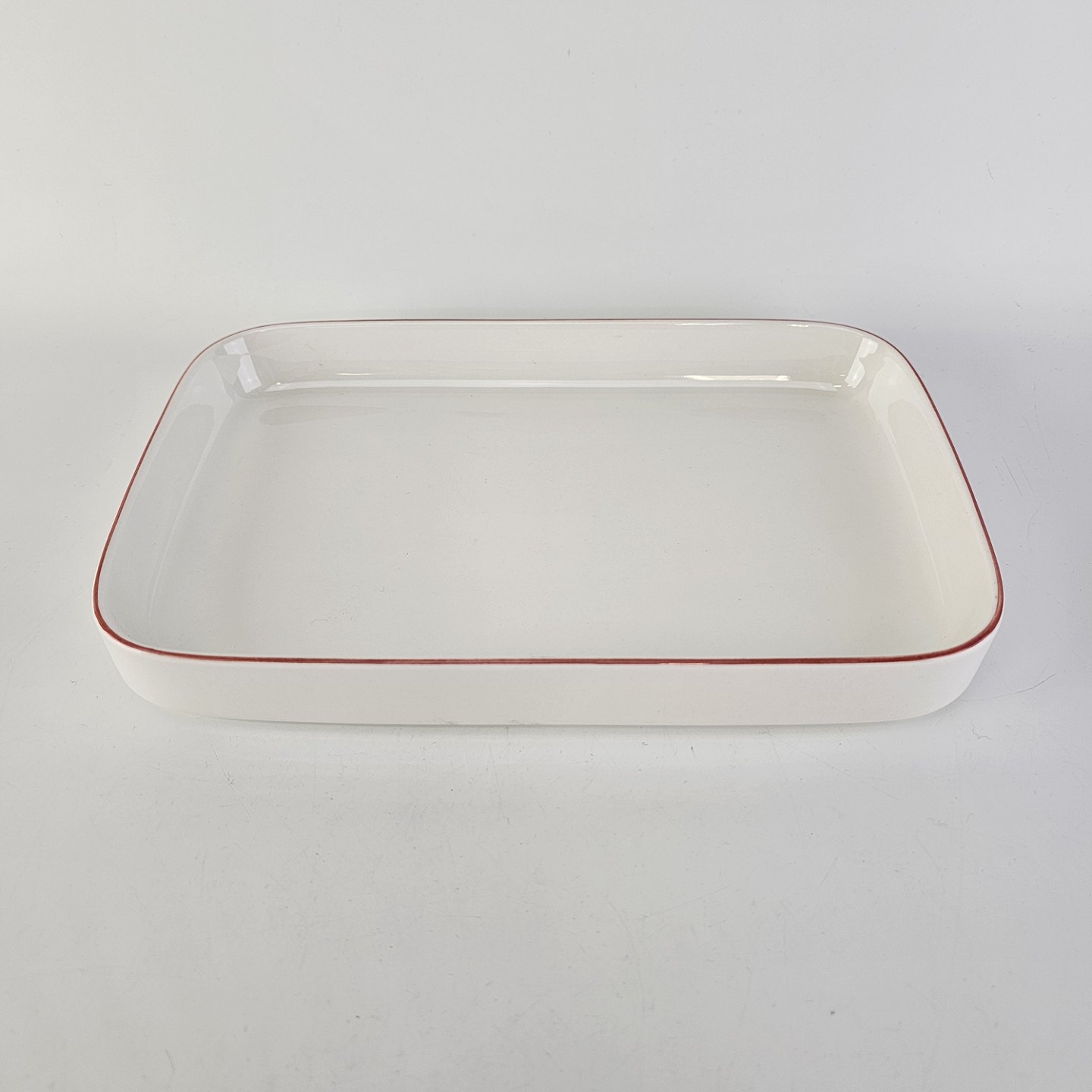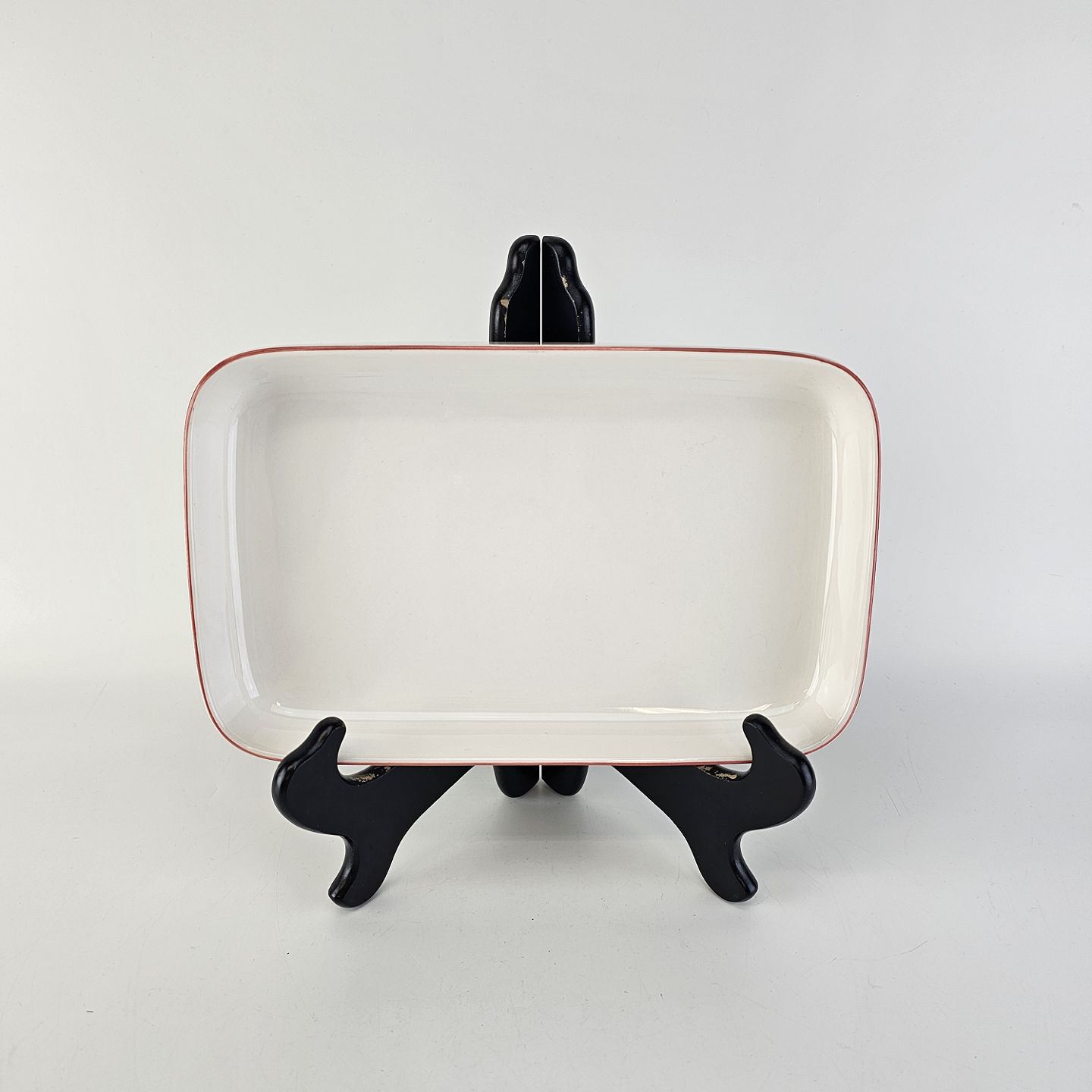 Beskrivelse: Aflangt fad i fajance fra stellet 4 All Seasons med rød kant