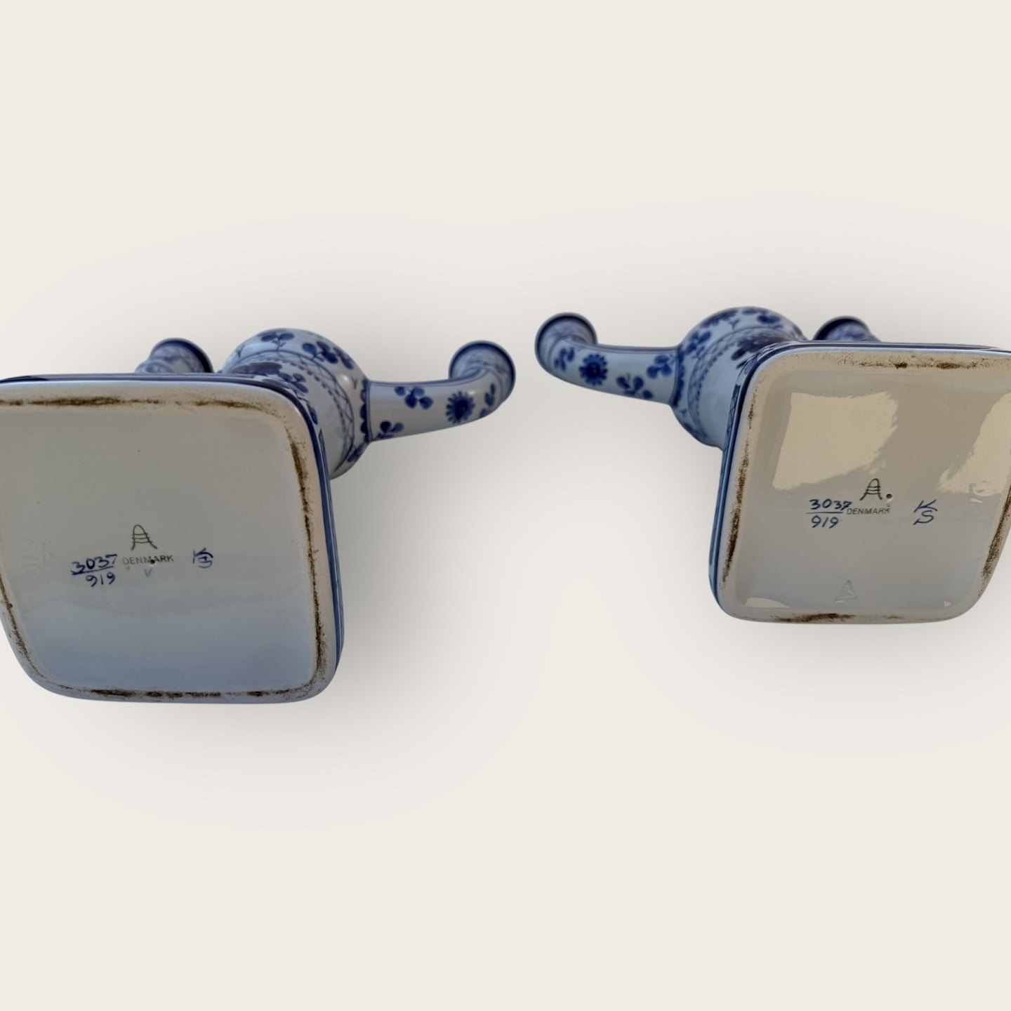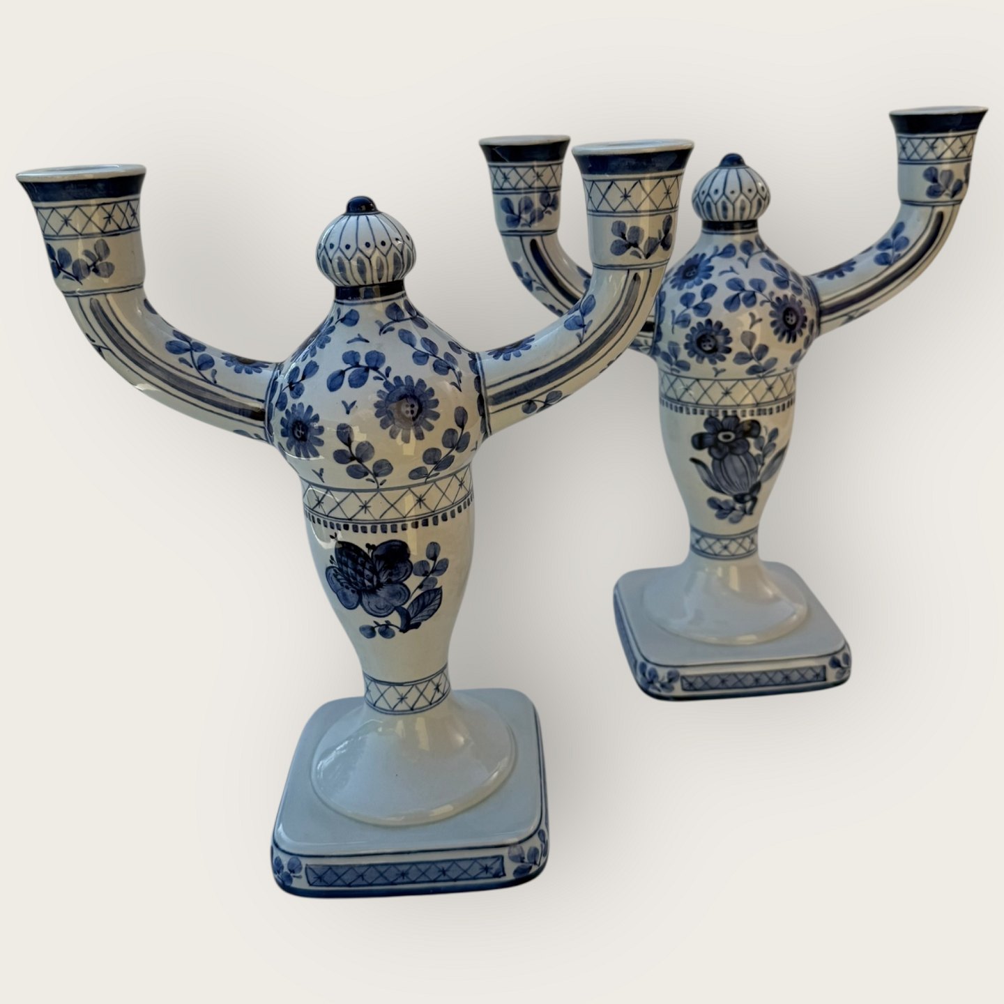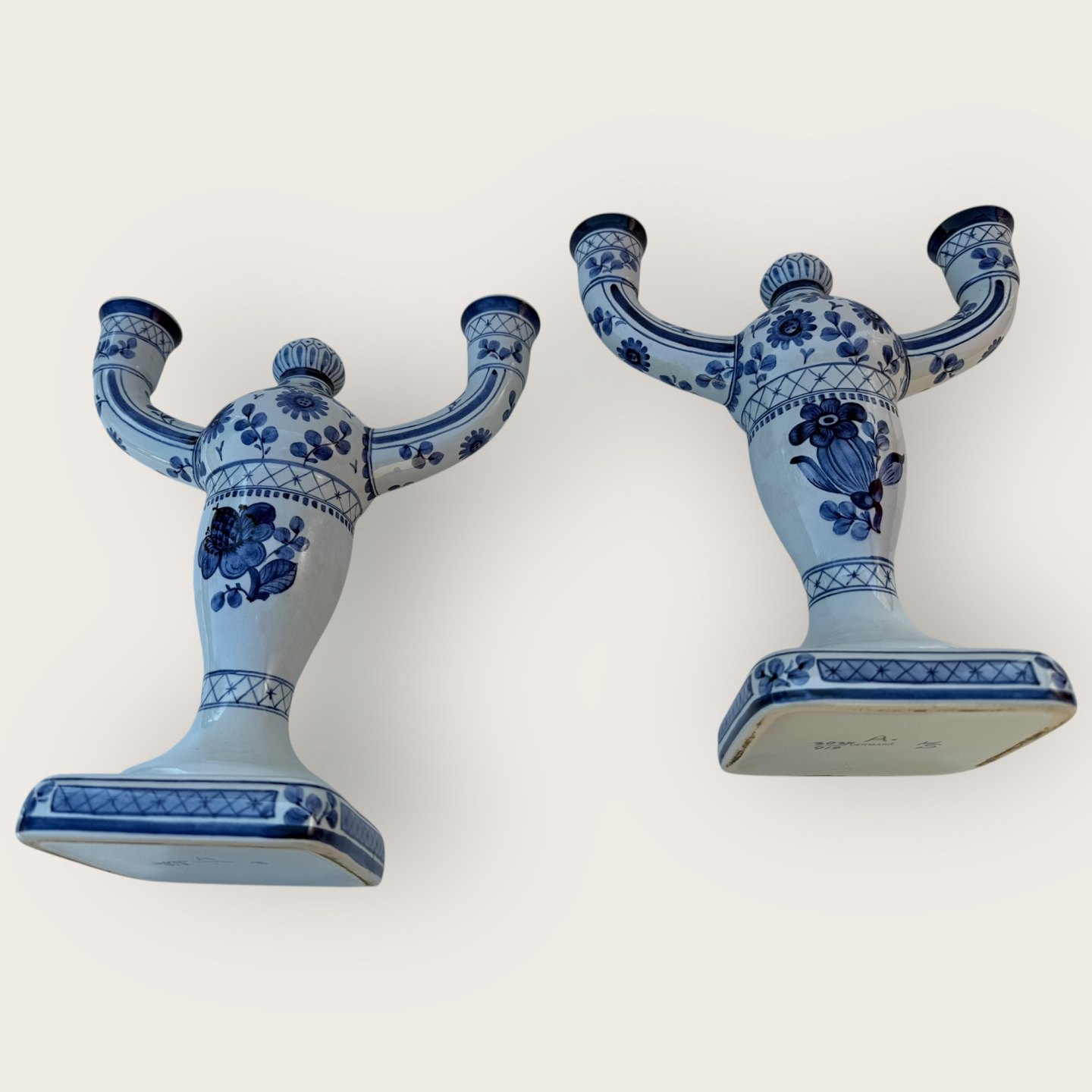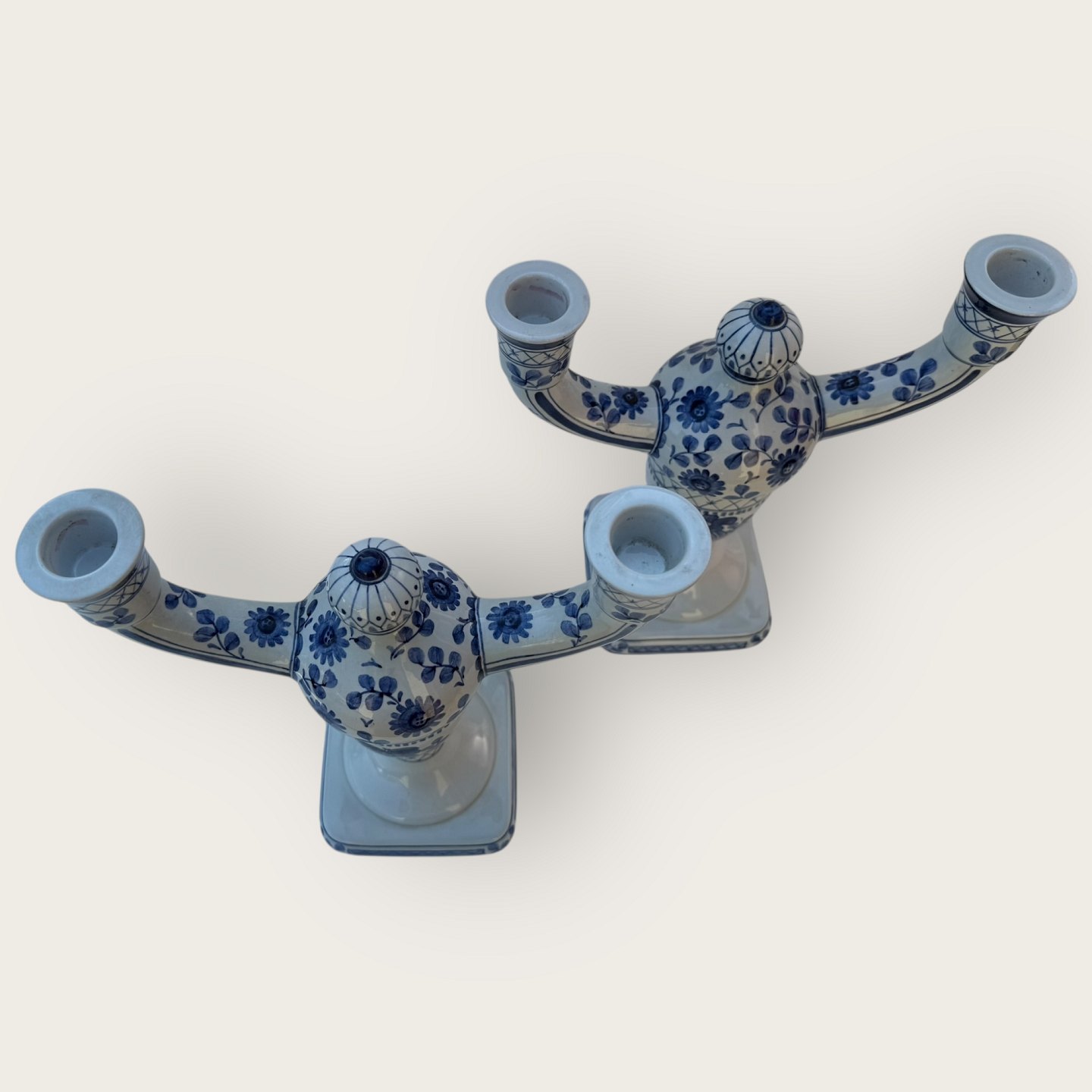 Beskrivelse: Royal Copenhagen, Aluminia, Tranquebar Et sæt 2 armede lyssestager, #3037/919, enkelte små krakeleringer under glasuren ellers rigtig pæn stand, 1.Sortering, design Christian Joachim, Mål for en stage: Højde 25,5cm, bredde 22cm, sælges samlet.