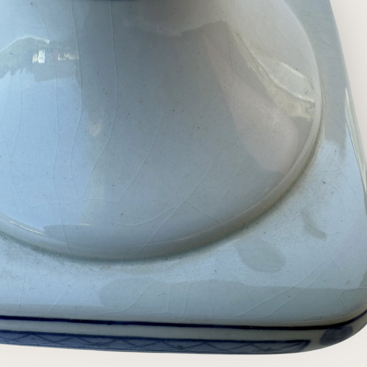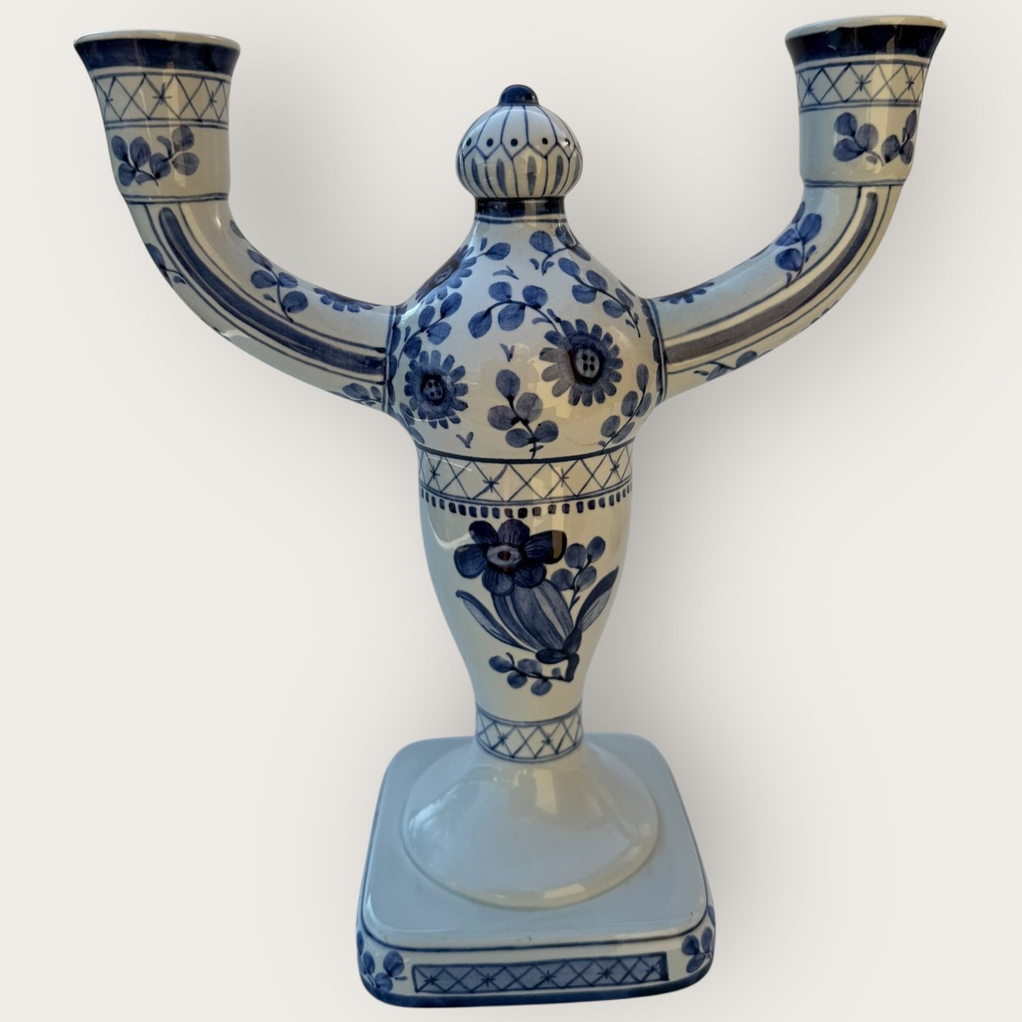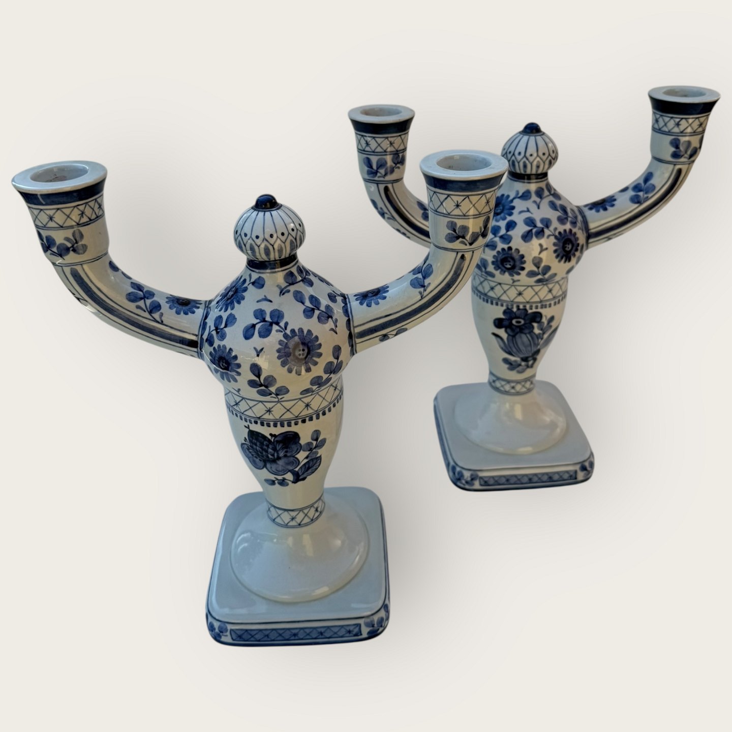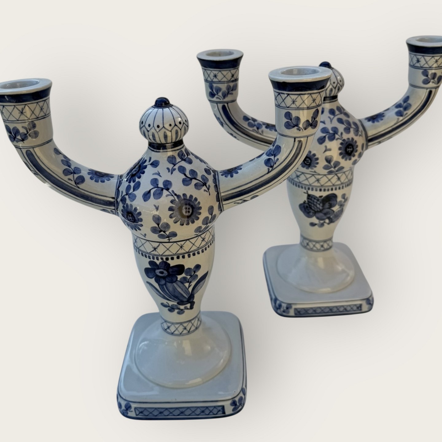 Beskrivelse: Royal Copenhagen, Aluminia, Tranquebar Et sæt 2 armede lyssestager, #3037/919, enkelte små krakeleringer under glasuren ellers rigtig pæn stand, 1.Sortering, design Christian Joachim, Mål for en stage: Højde 25,5cm, bredde 22cm, sælges samlet.