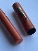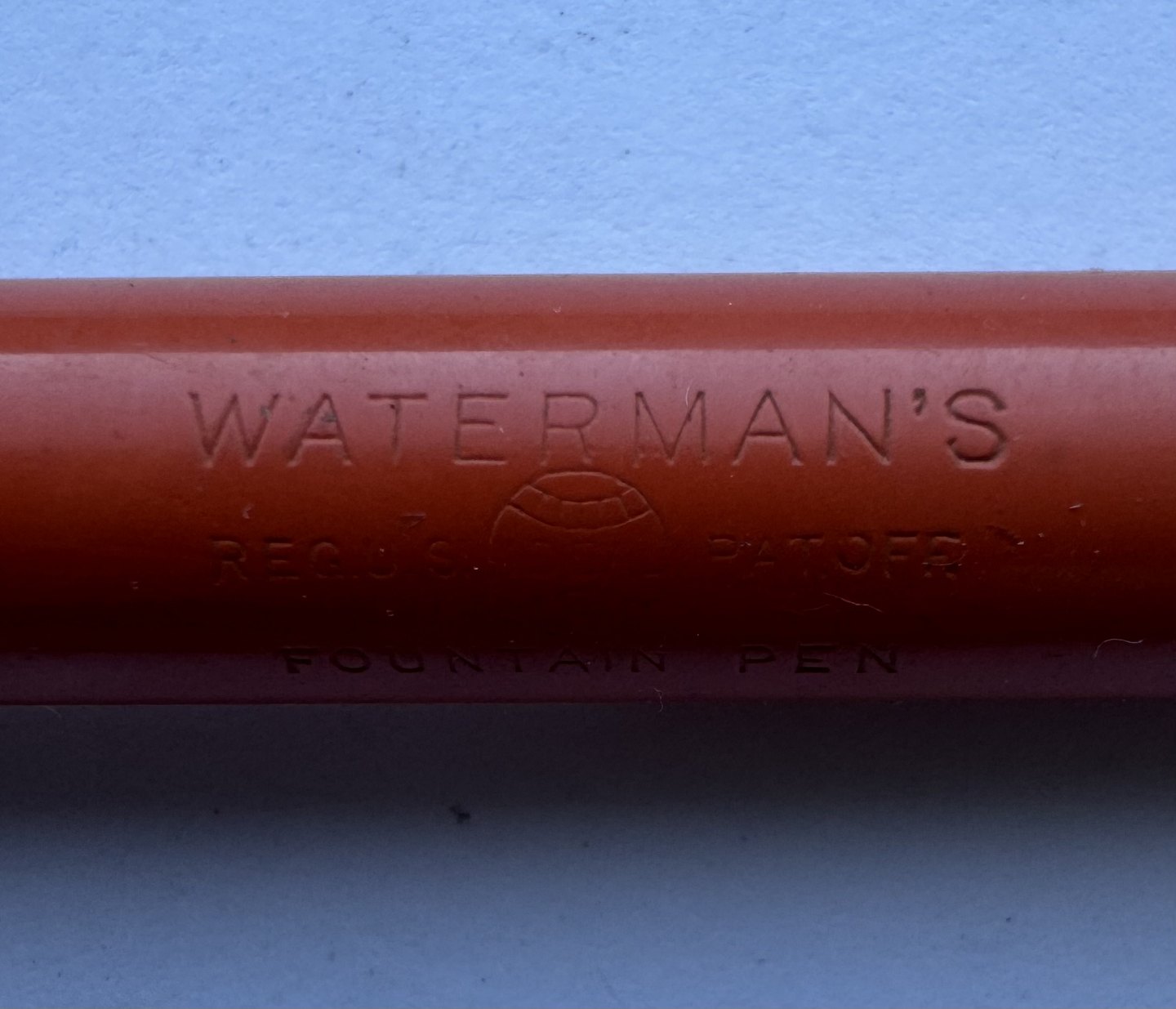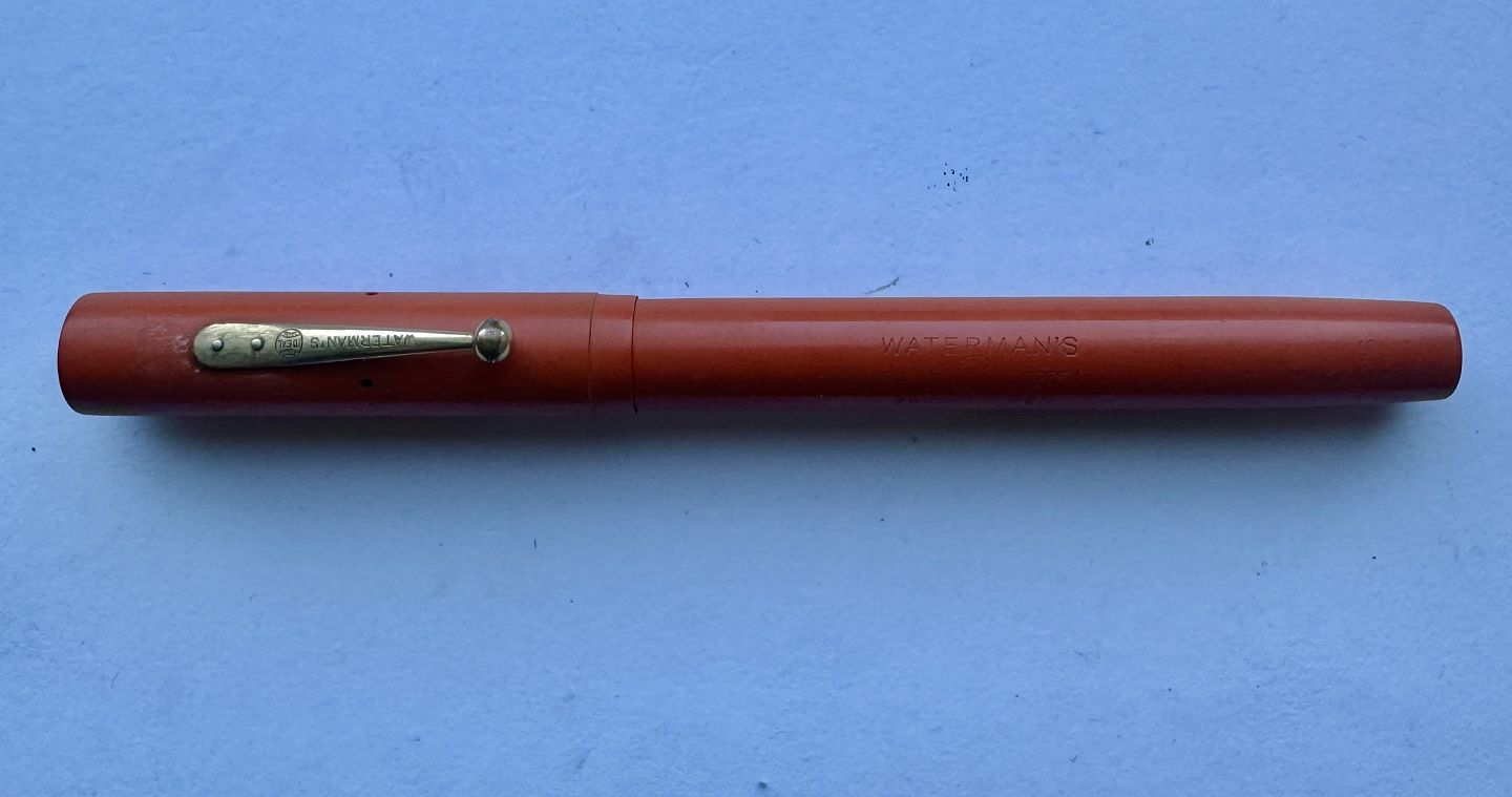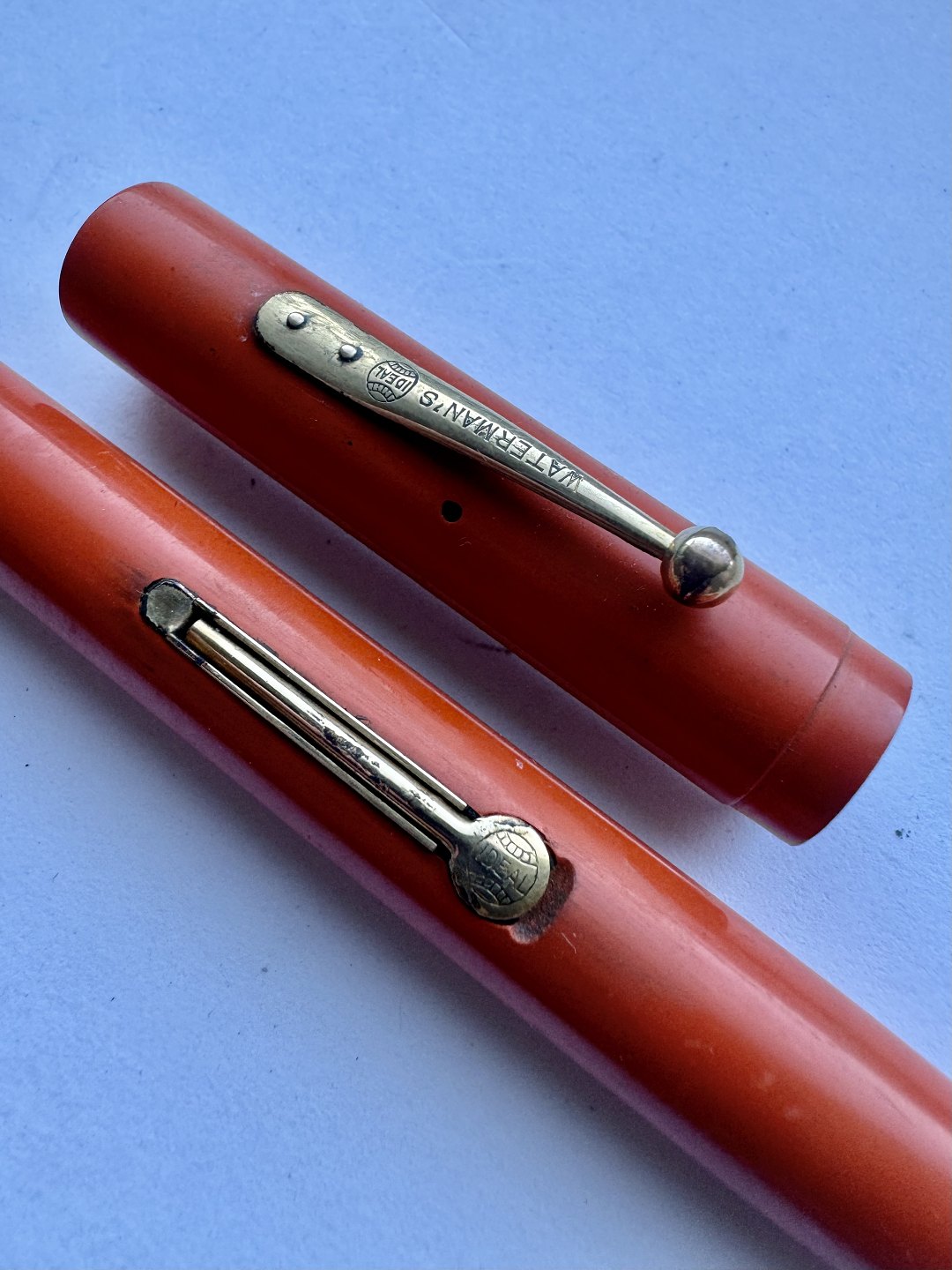 Beskrivelse: Koralrød Waterman nr. 52 fyldepen med leverfiller. FEJL: Mavebælte på hætten mangler og der er en revne henover “tråden” på pennens krop (se foto med den grå pil). Mål: 13,5 cm lang.