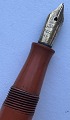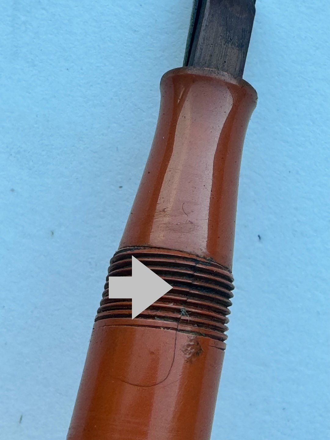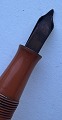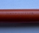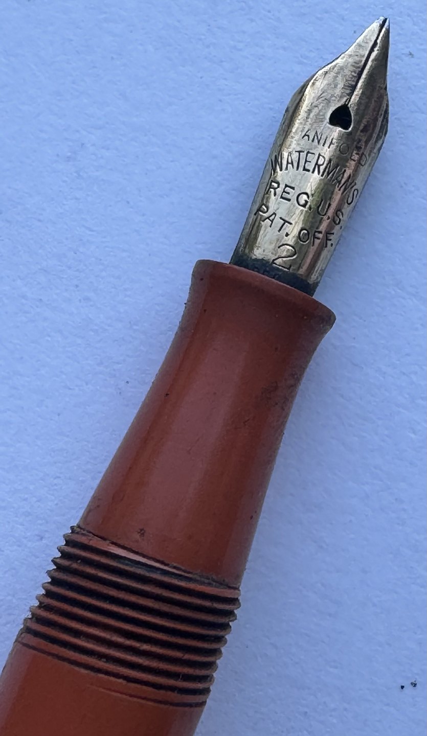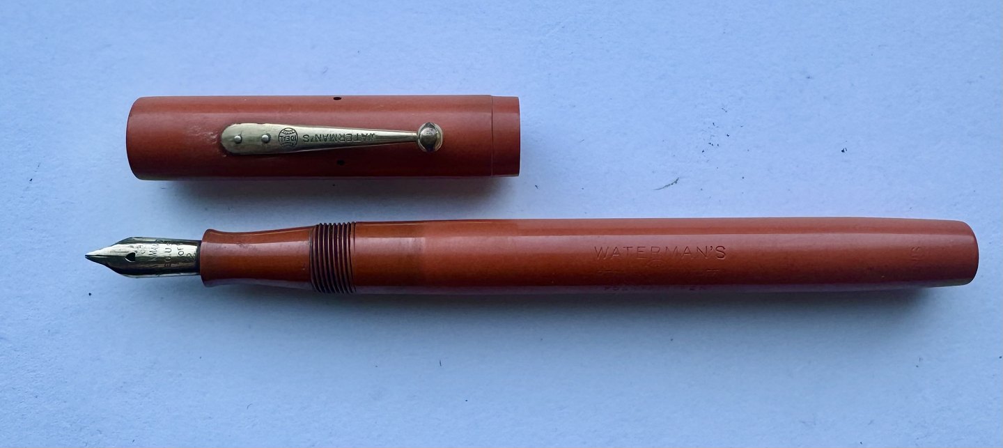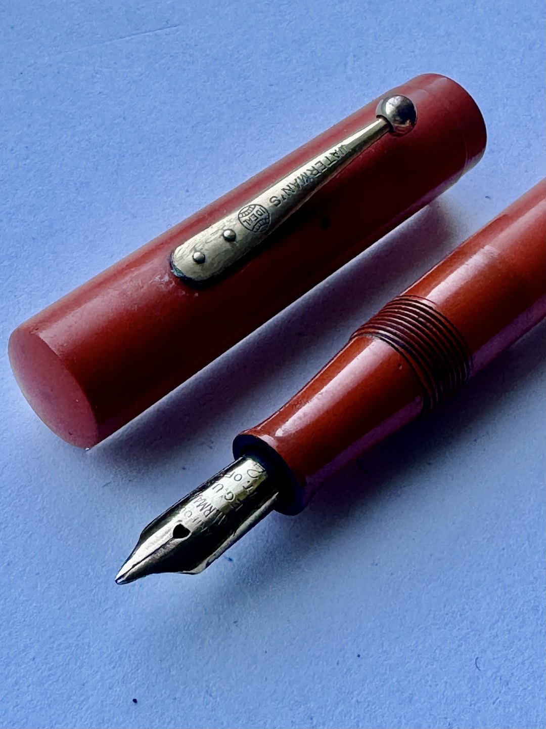 Beskrivelse: Koralrød Waterman nr. 52 fyldepen med leverfiller. FEJL: Mavebælte på hætten mangler og der er en revne henover “tråden” på pennens krop (se foto med den grå pil). Mål: 13,5 cm lang.
