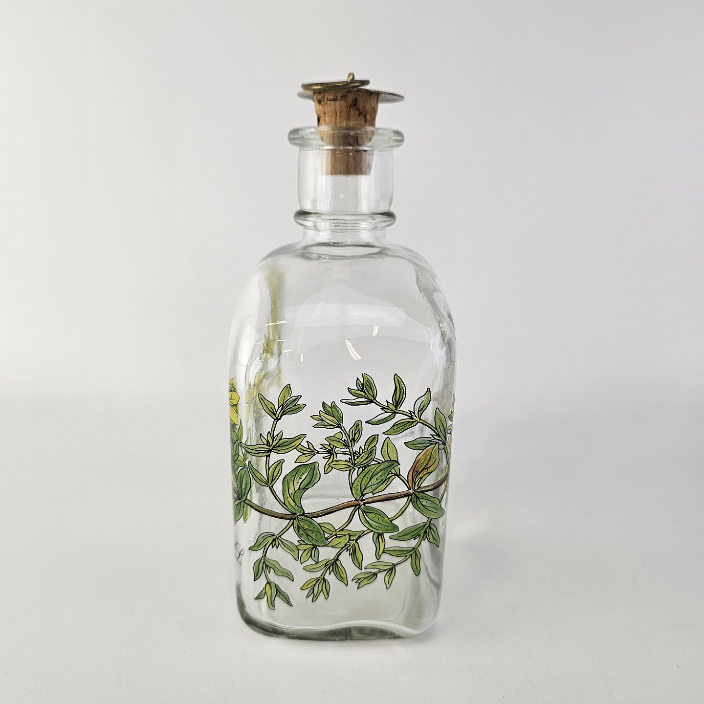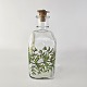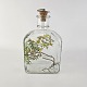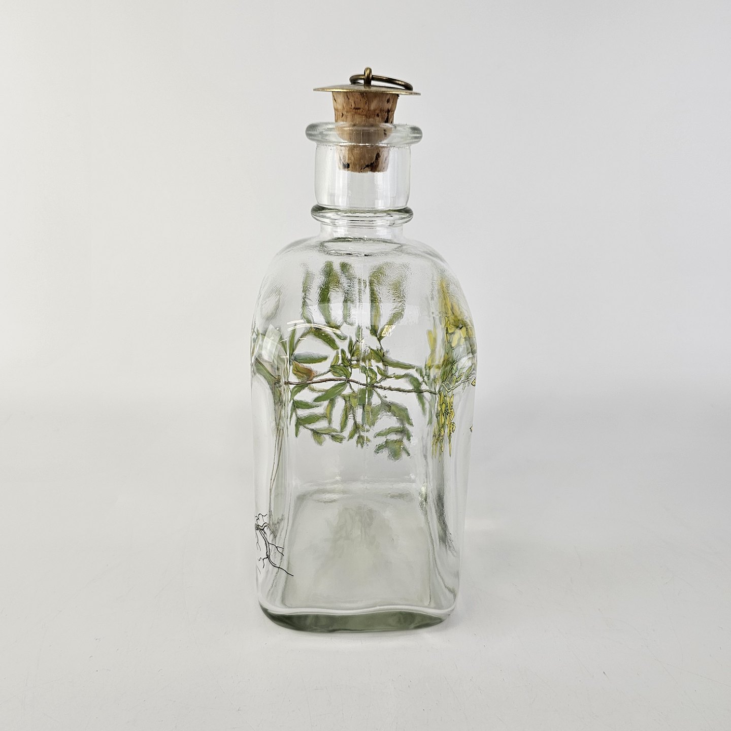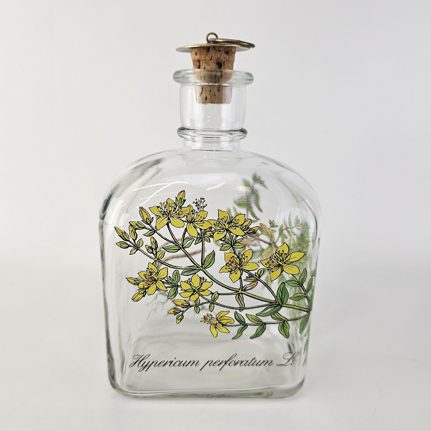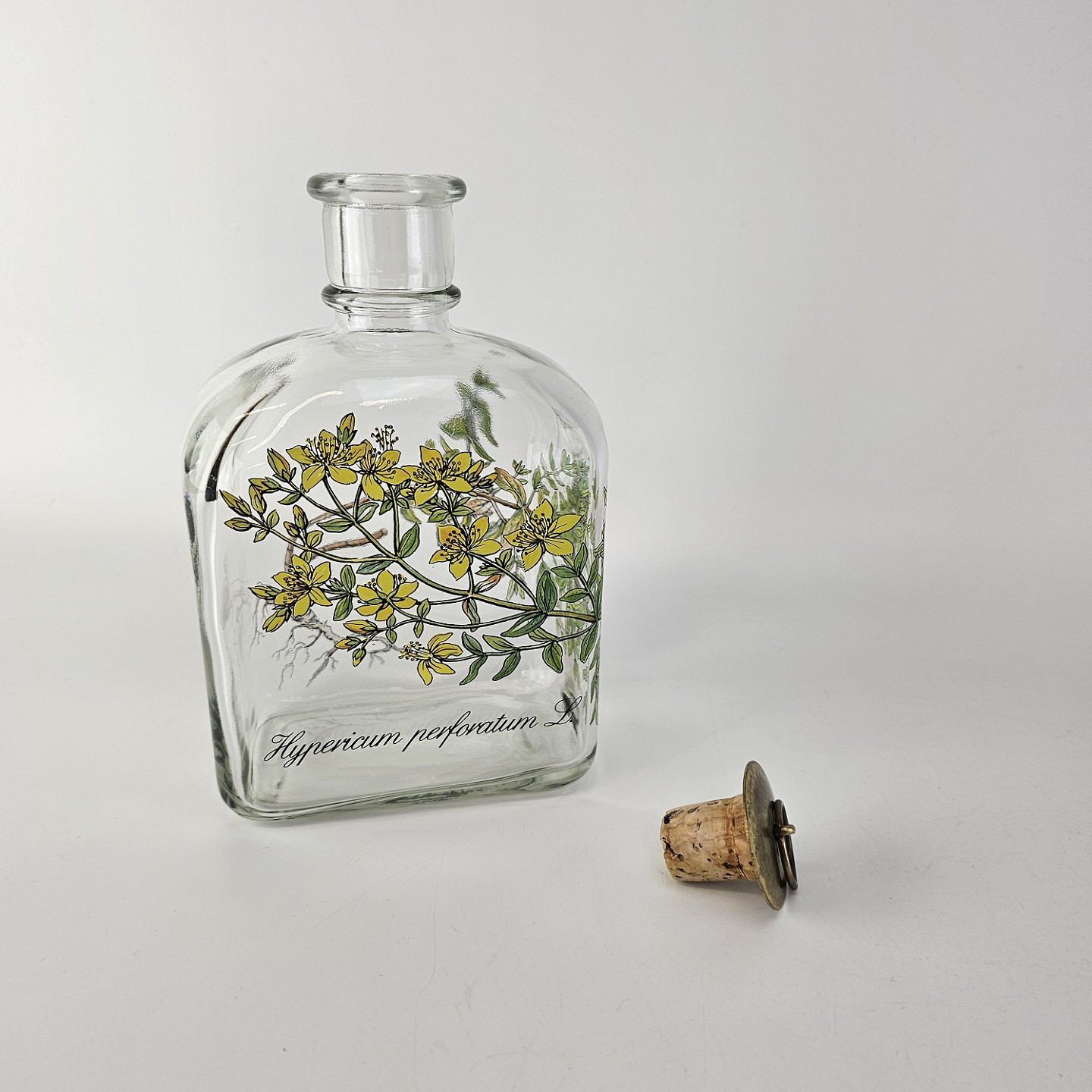 Beskrivelse: Karaffel i klart glas med korkprop fra serien Brændevins Amatøren, dekoreret med en gren af prikbladet perikum blomster og teksten Hypericum Perforatum L.