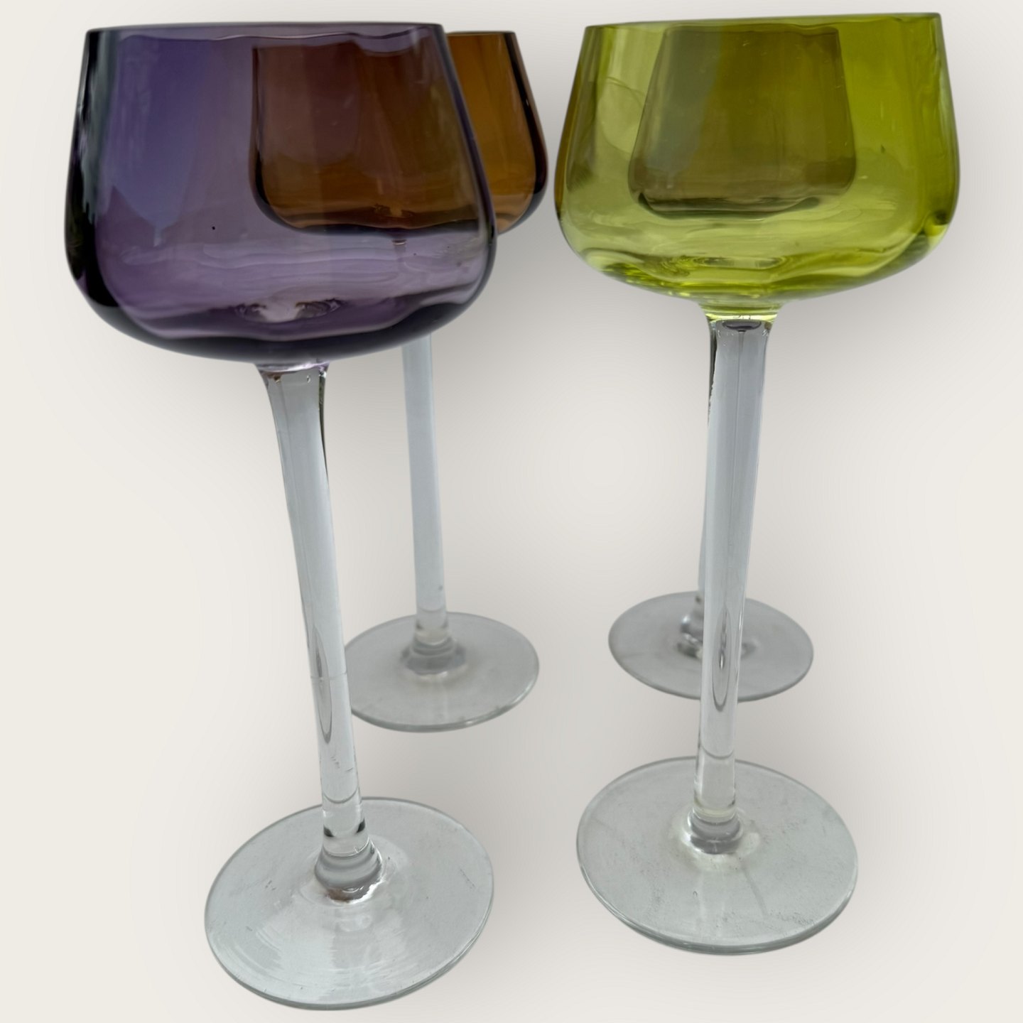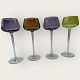 4 højstilkede farvede vinglas.