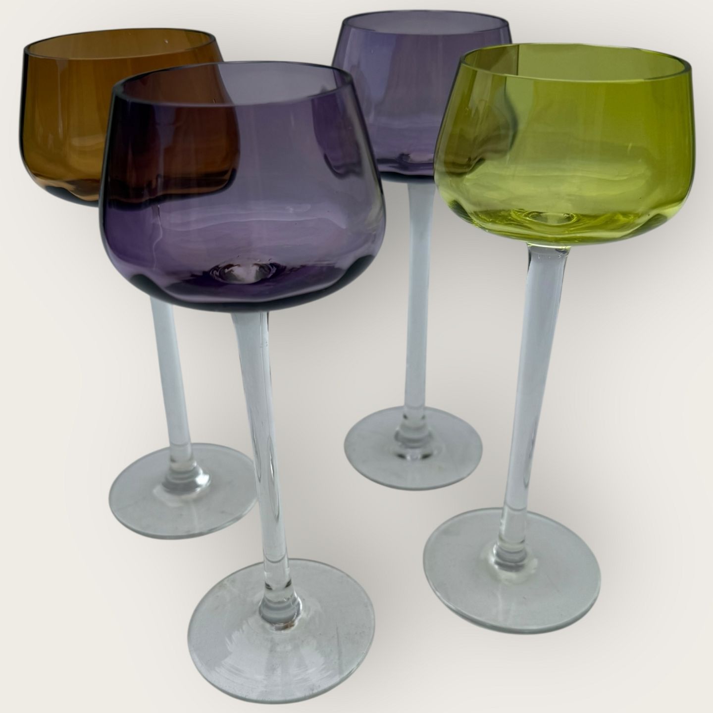: 4 farvede vinglas med høj stilk, højde 19cm, fin stand, sælges samlet.