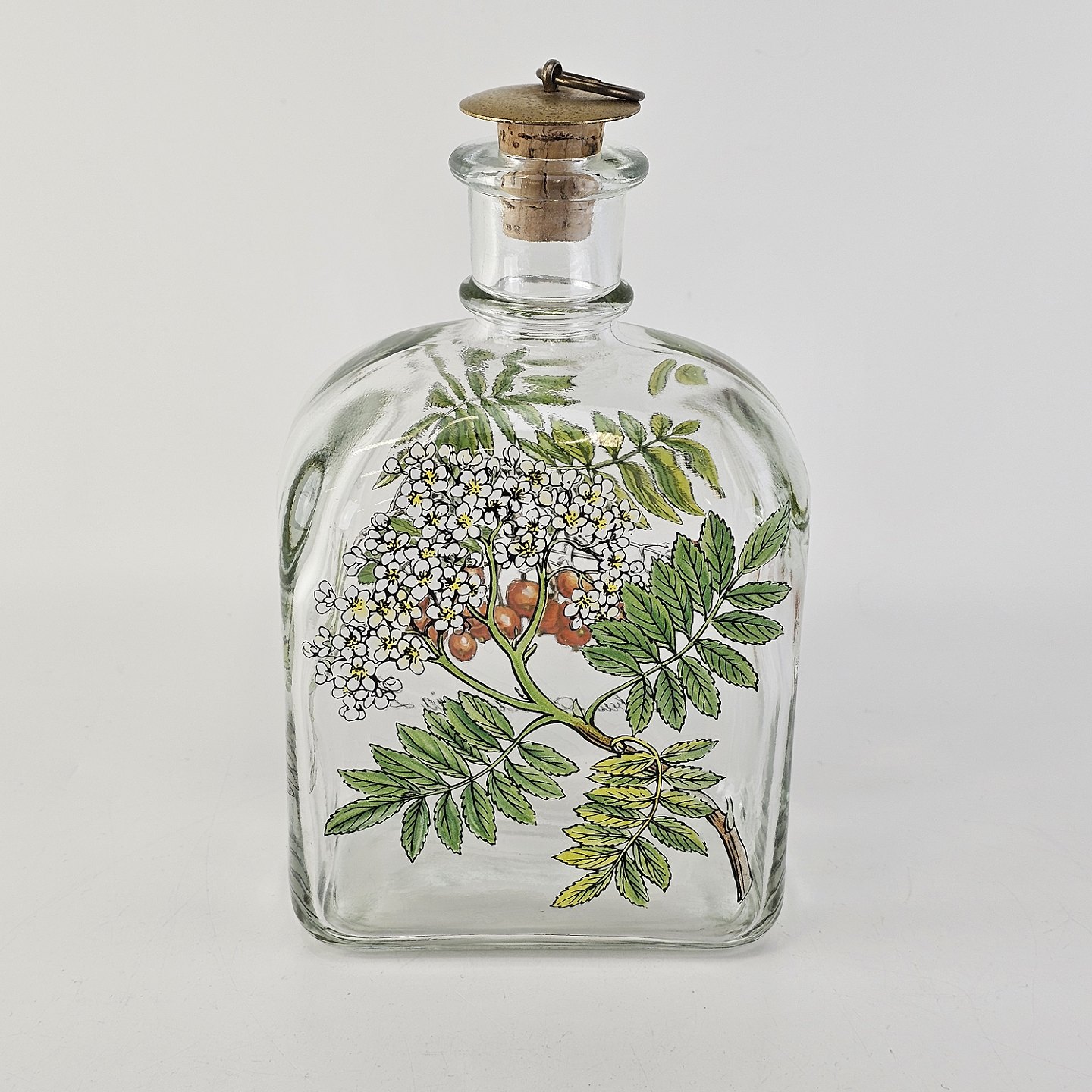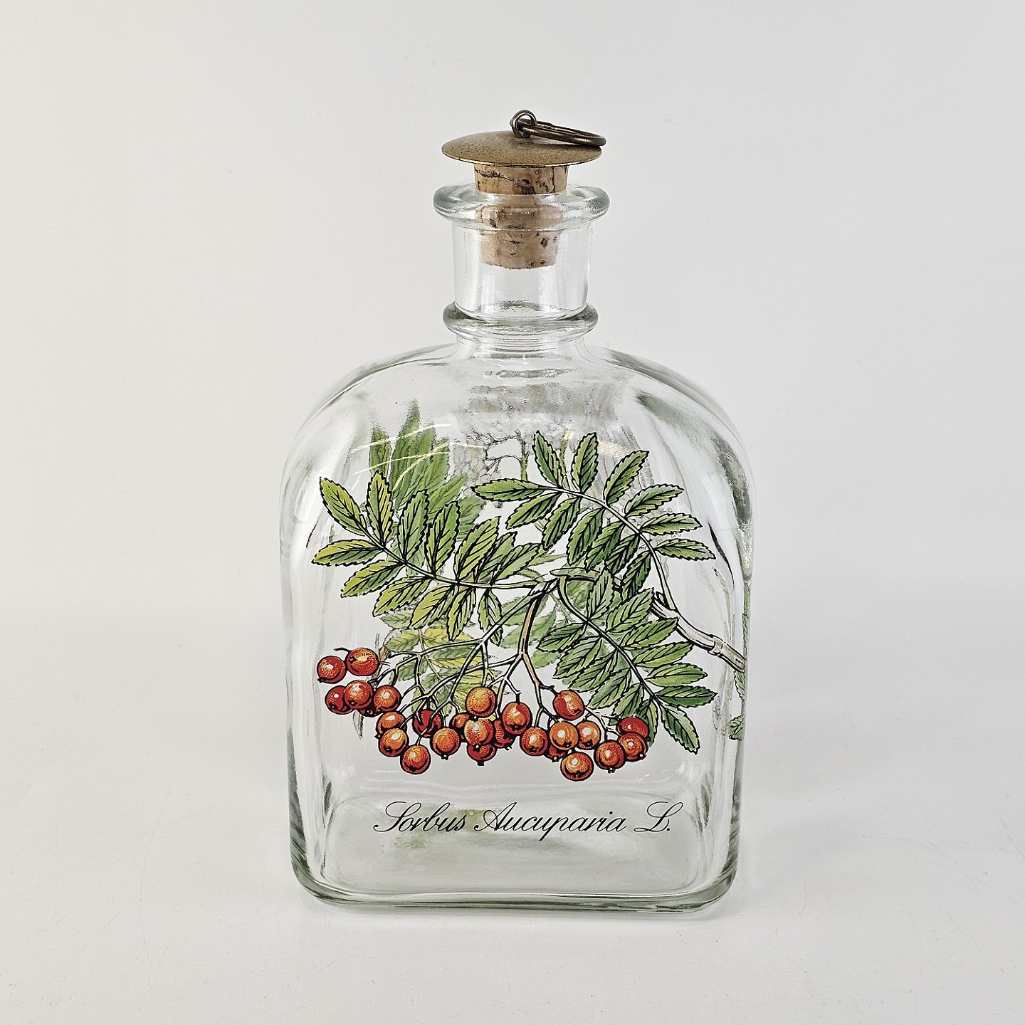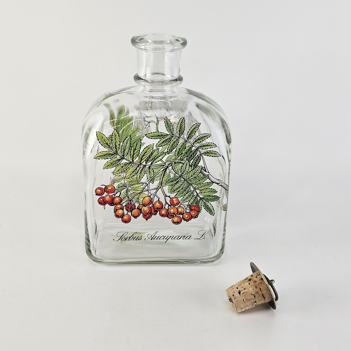 Beskrivelse: Karaffel i klart glas med korkprop fra serien Brændevins Amatøren, dekoreret med en gren af rønnebær og teksten Sorbus Aucuparia L.