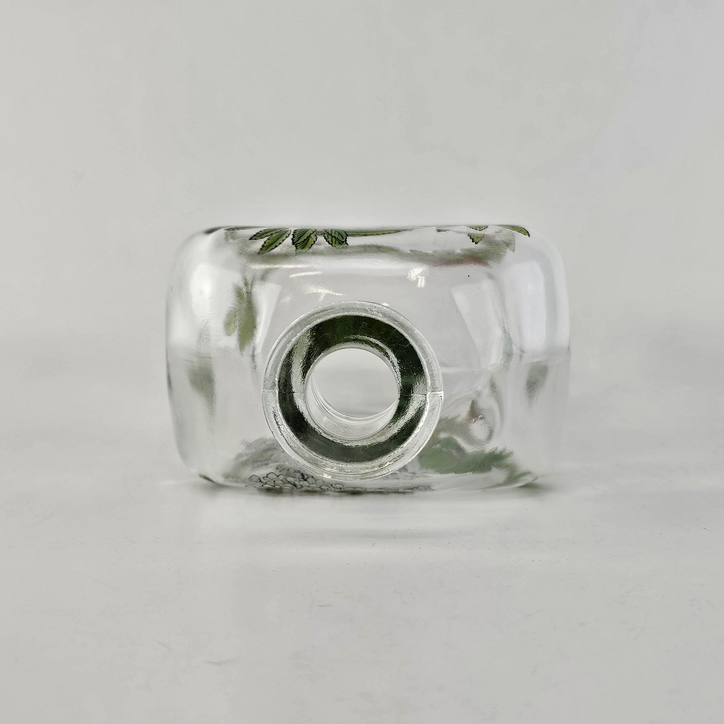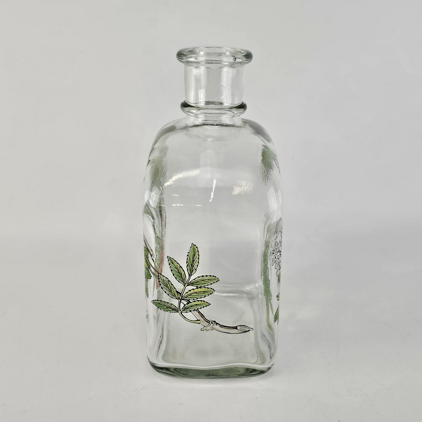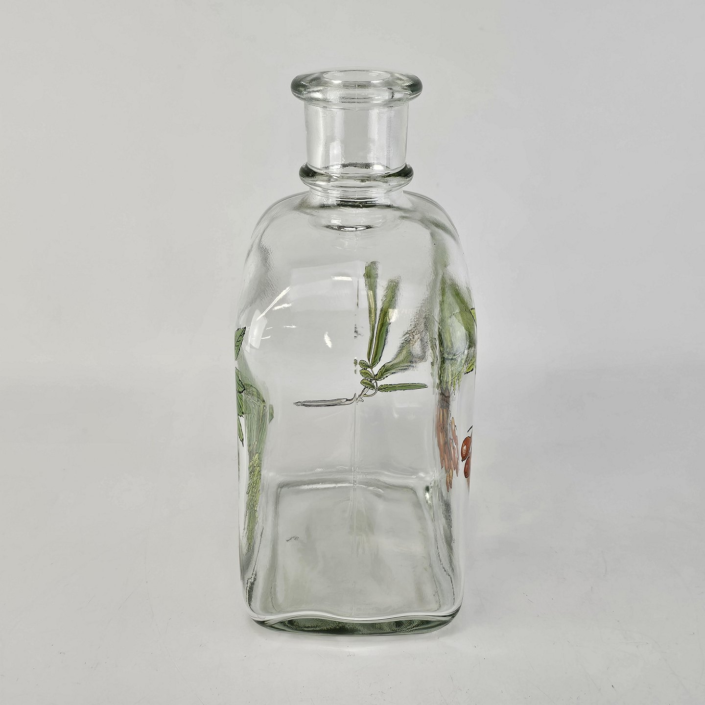 Beskrivelse: Karaffel i klart glas med korkprop fra serien Brændevins Amatøren, dekoreret med en gren af rønnebær og teksten Sorbus Aucuparia L.