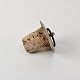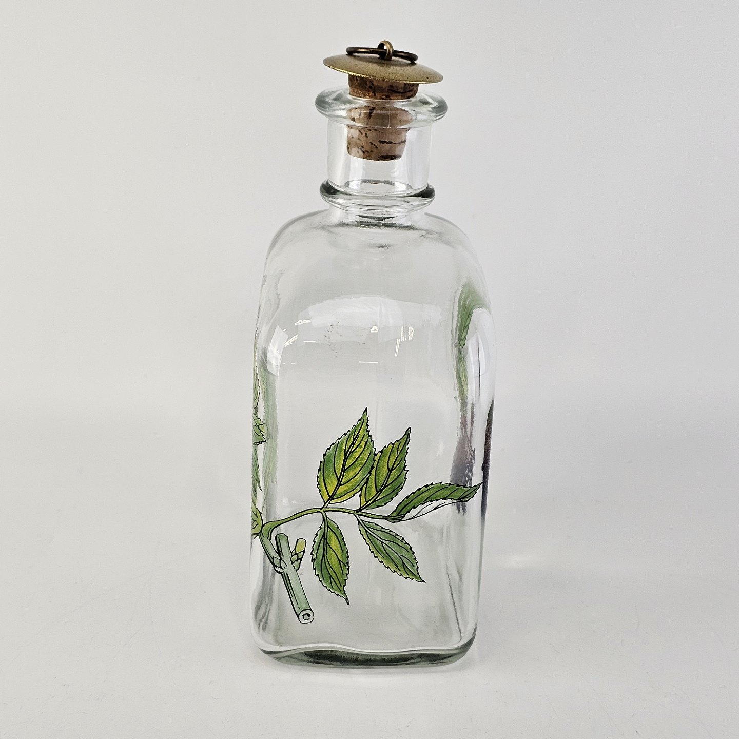 Beskrivelse: Karaffel i klart glas med korkprop fra serien Brændevins Amatøren, dekoreret med en gren af hyldeblomst og teksten Sambucus Nigra L.