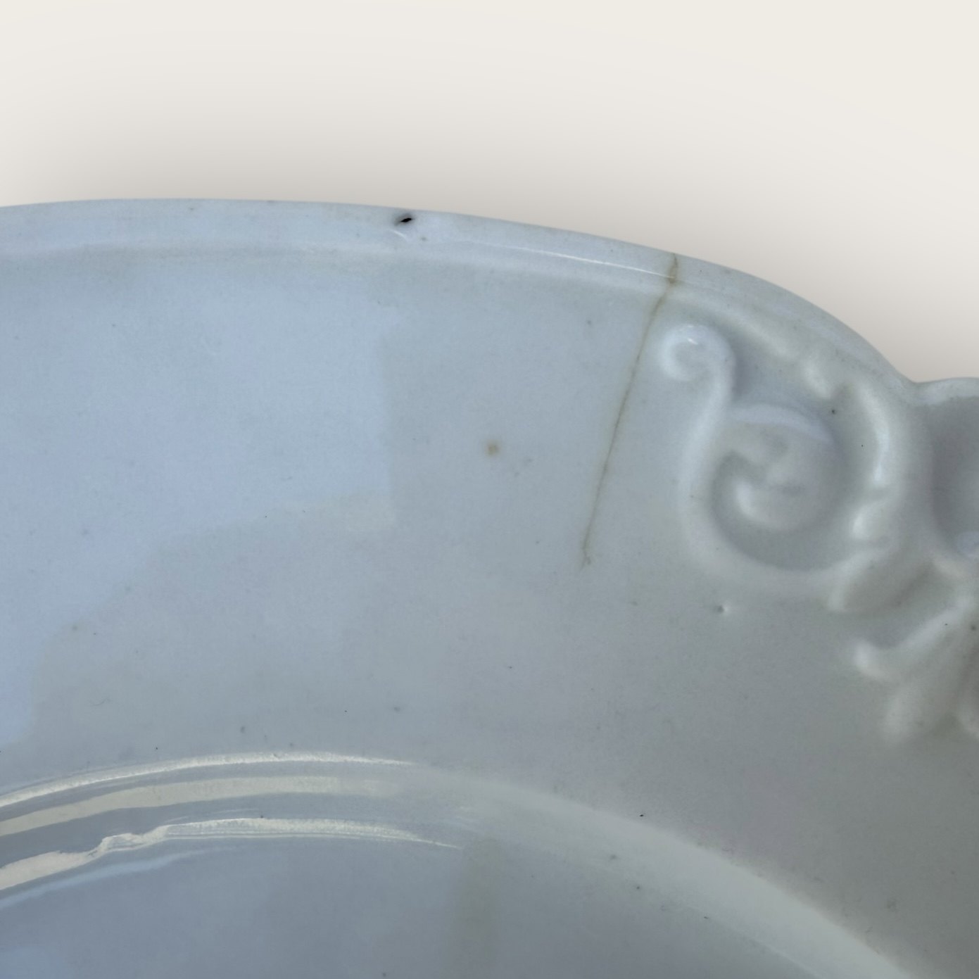 Description: Royal Copenhagen, Rococo white, flat plate, 26 cm in diameter, has a small hairline crack (see photo)