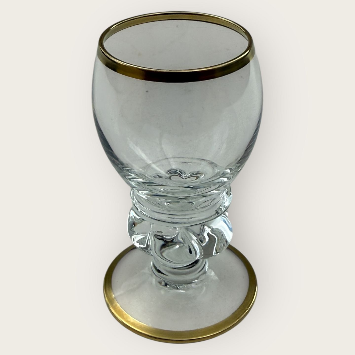 Beskrivelse: Holmegaard, Gisselfeld, lille Snapseglas med guldkant, 7,3cm høj, 3,4cm i diameter, Design Jacob E. Bang *Pæn stand*