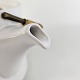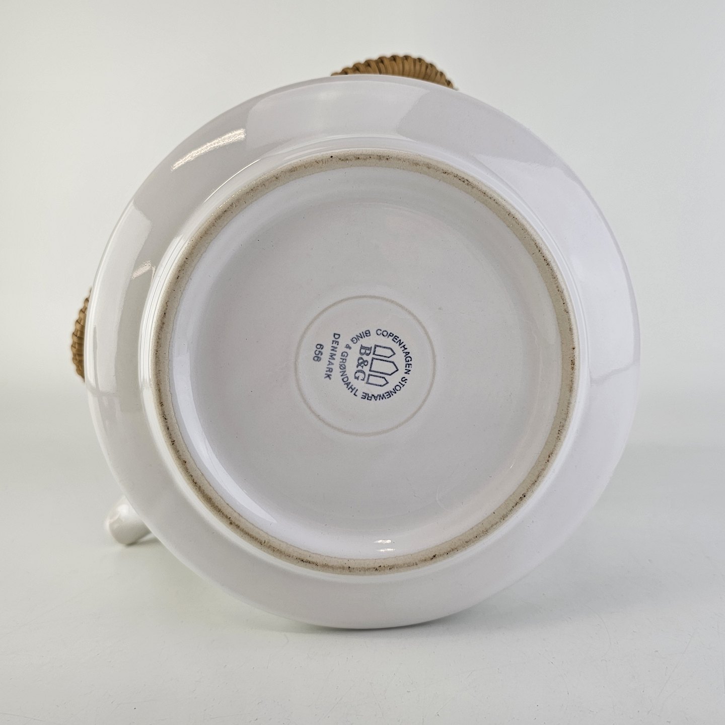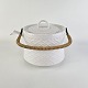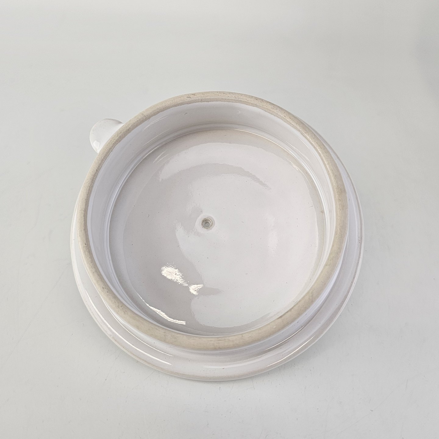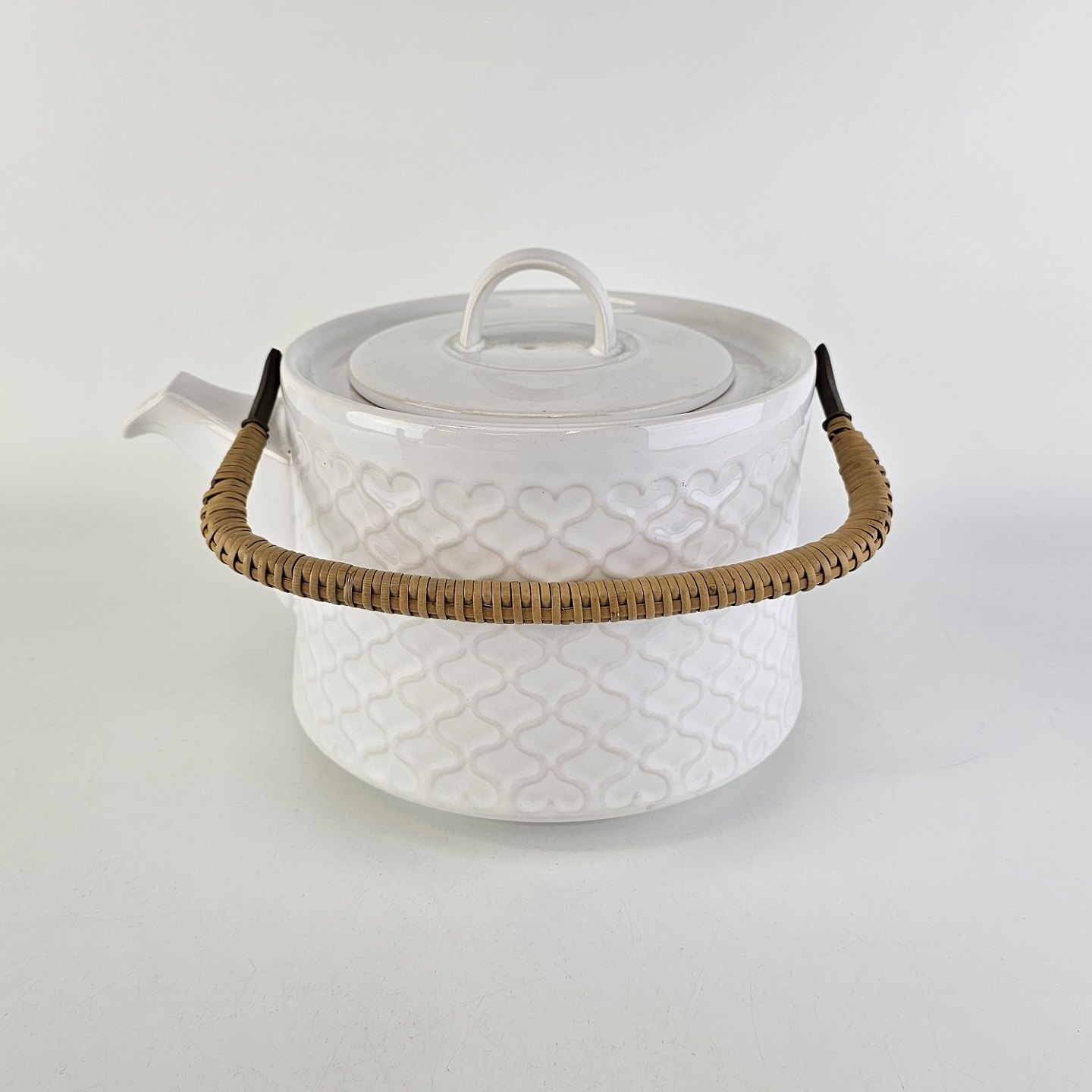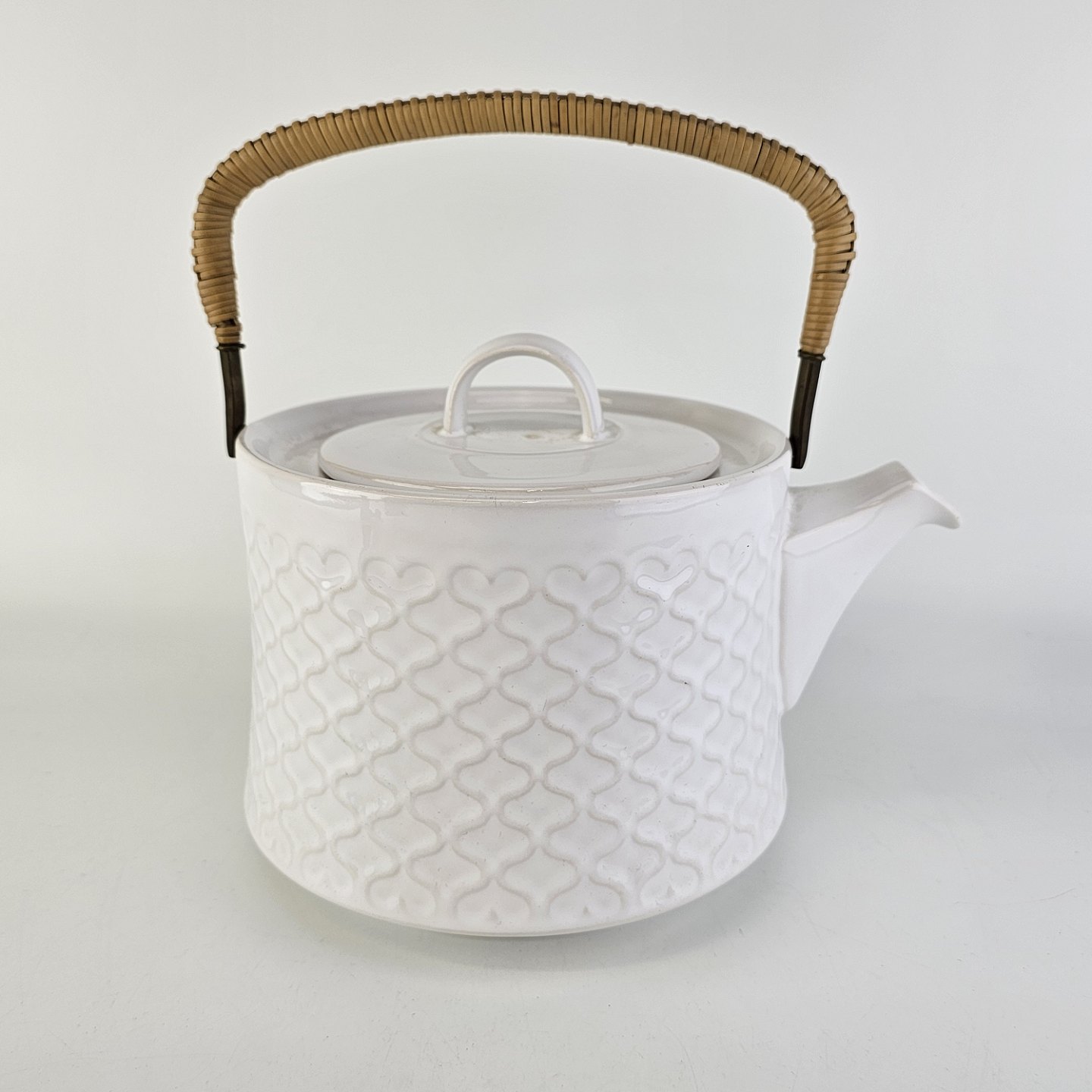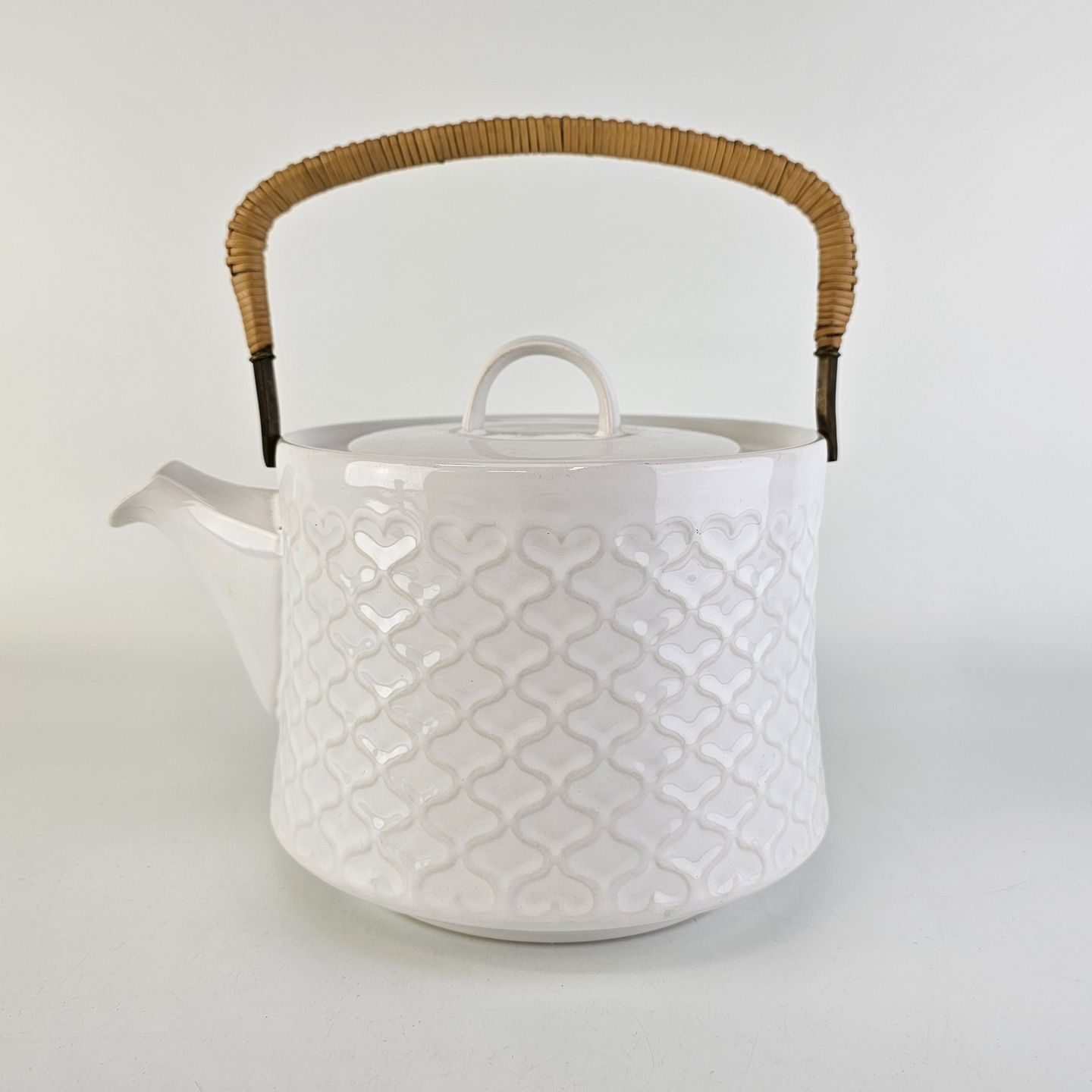 Beskrivelse: Tekande i stentøj med hank i messing omgivet af naturflet fra stellet Cordial Hvid Palet
