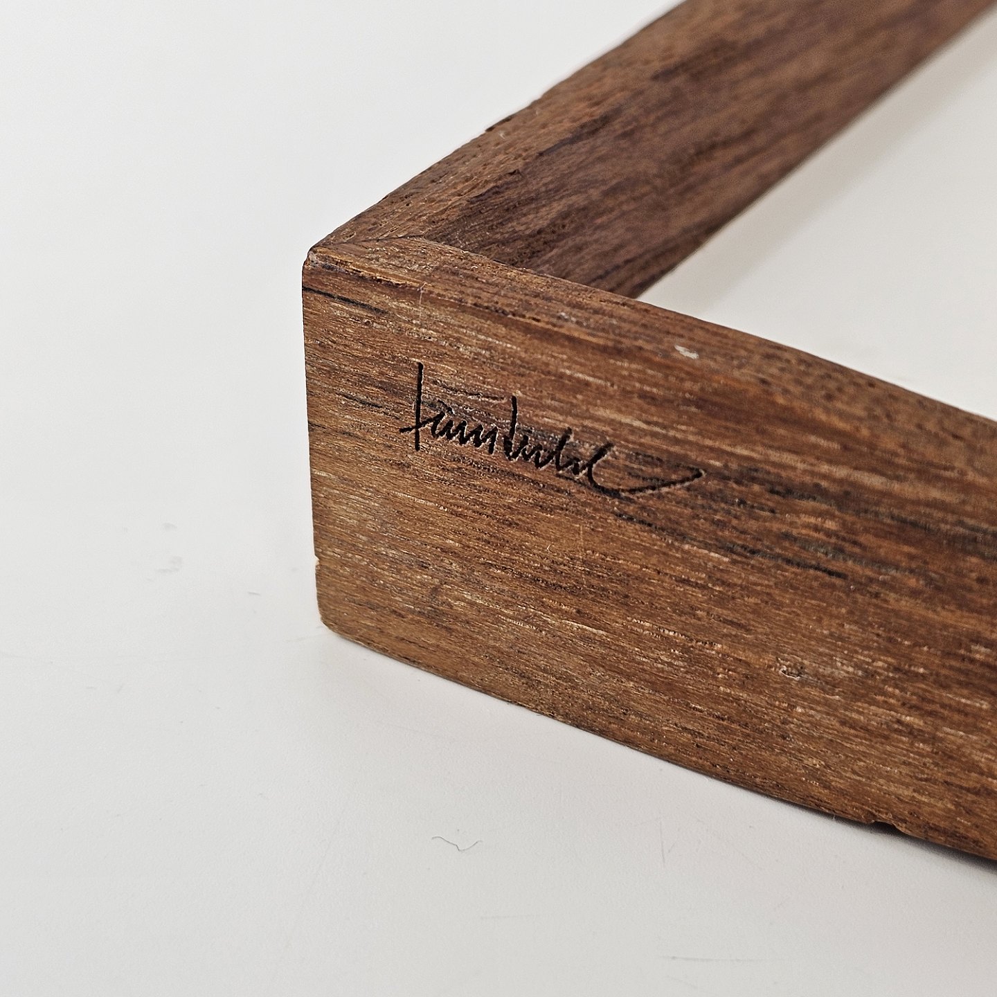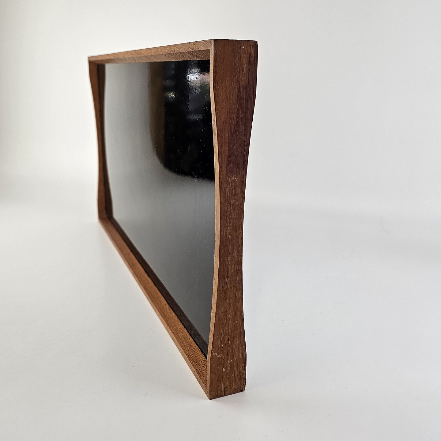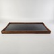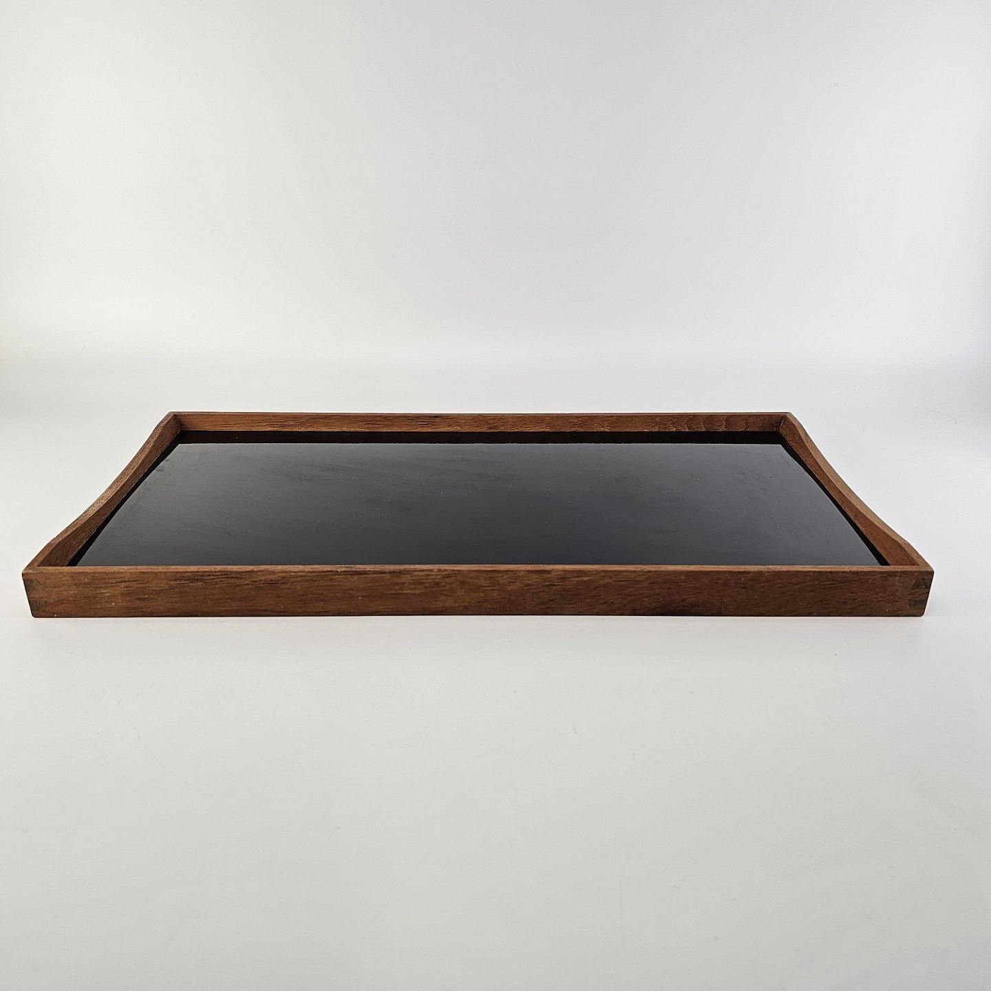 Beskrivelse: Vendbar bakke i teak tre og højglans laminat, sort på den ene side og hvid på den anden