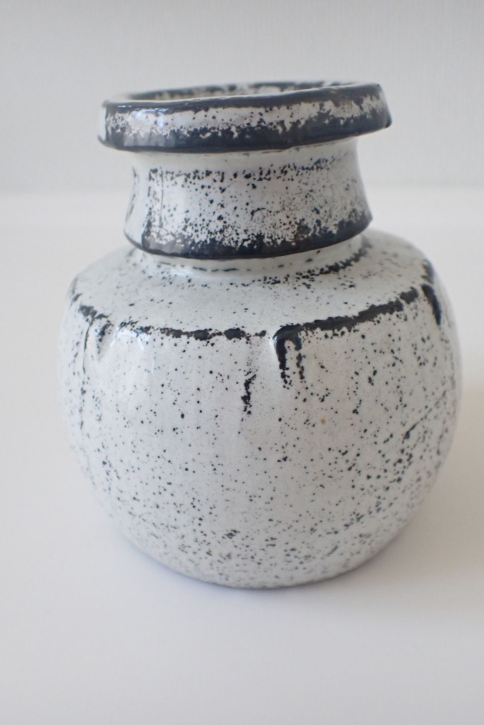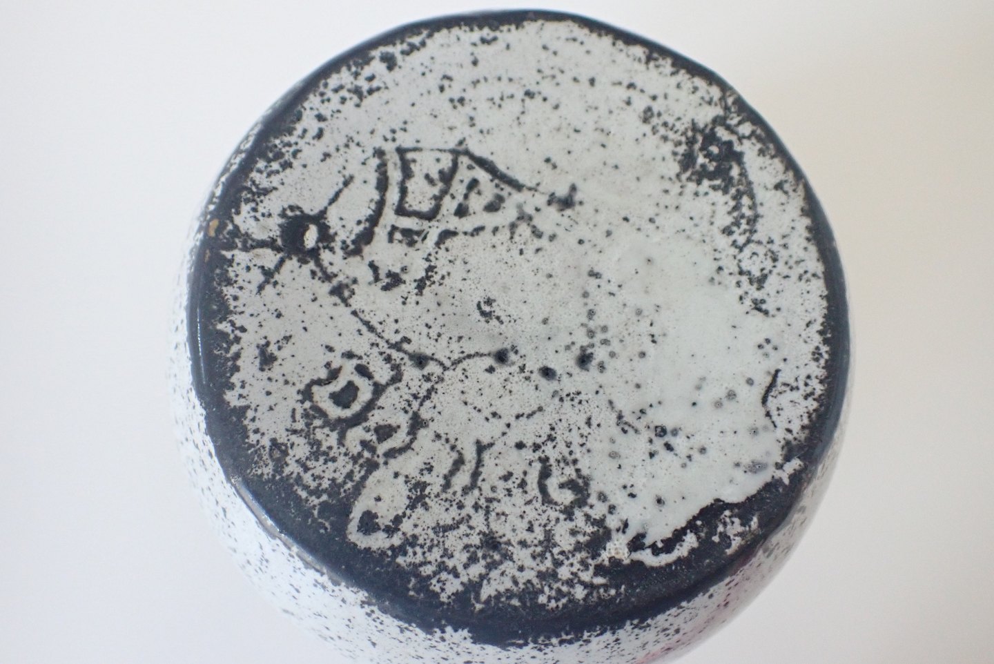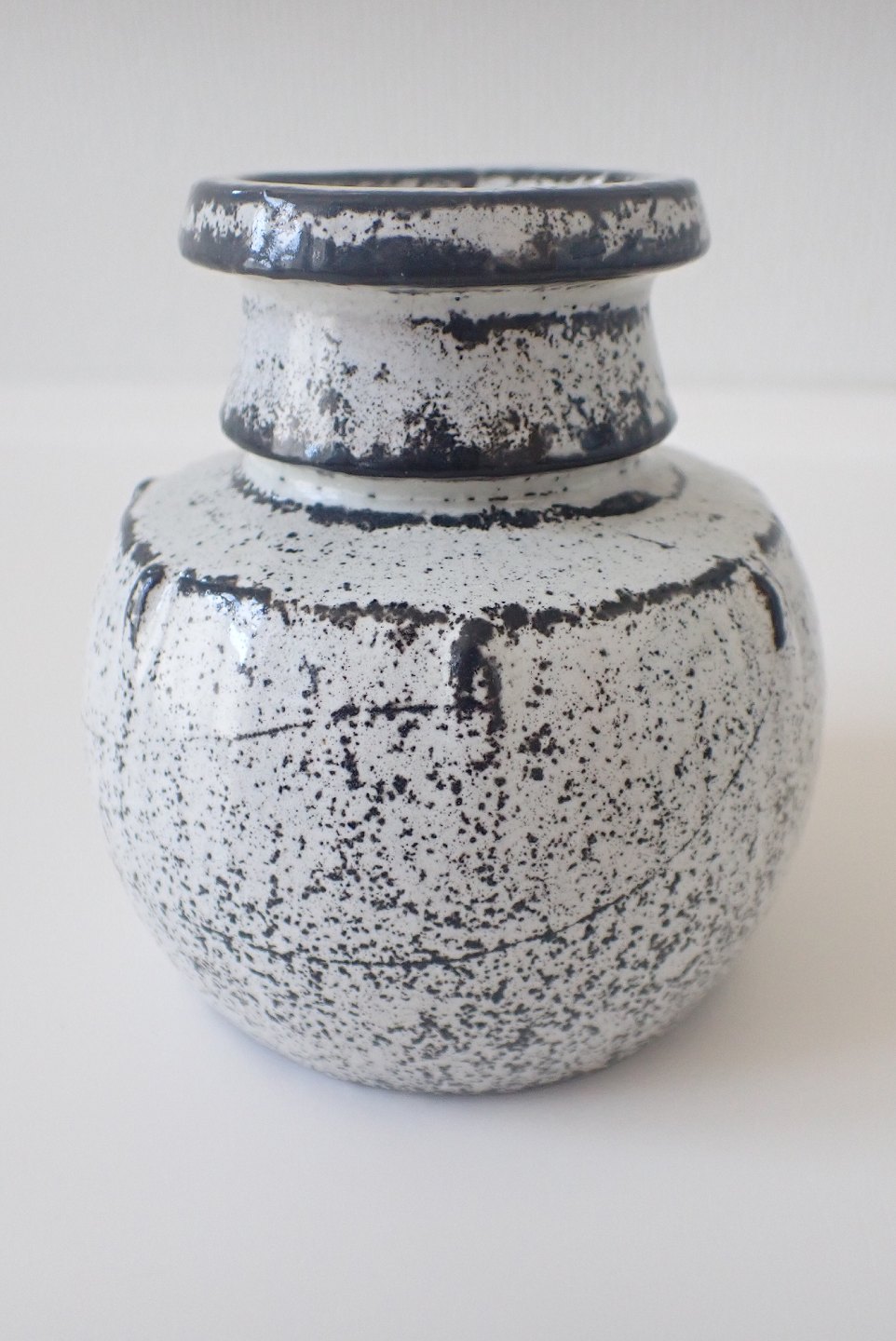 Beskrivelse: Svend Hammershøj (1873 - 1948) for Kähler. Buttet keramikvase i sort/hvid dobbeltglasur(askeglasur).Med smallere kantet hals og små dekorative "ører". Stemplet HAK, Denmark. Højde: 19,5 cm. I fin stand.