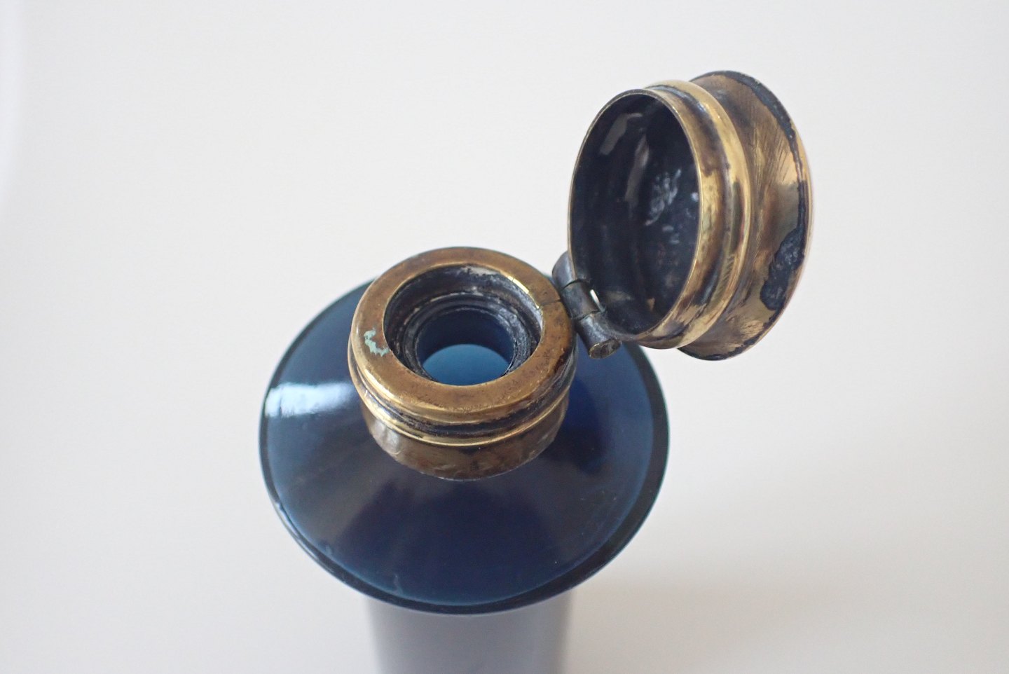 Beskrivelse: Parfumeflaske i blåt glas med messinglåg, engelsk ca. 1900. Højde:11,5 cm. I fin stand men mangler indre glasprop.