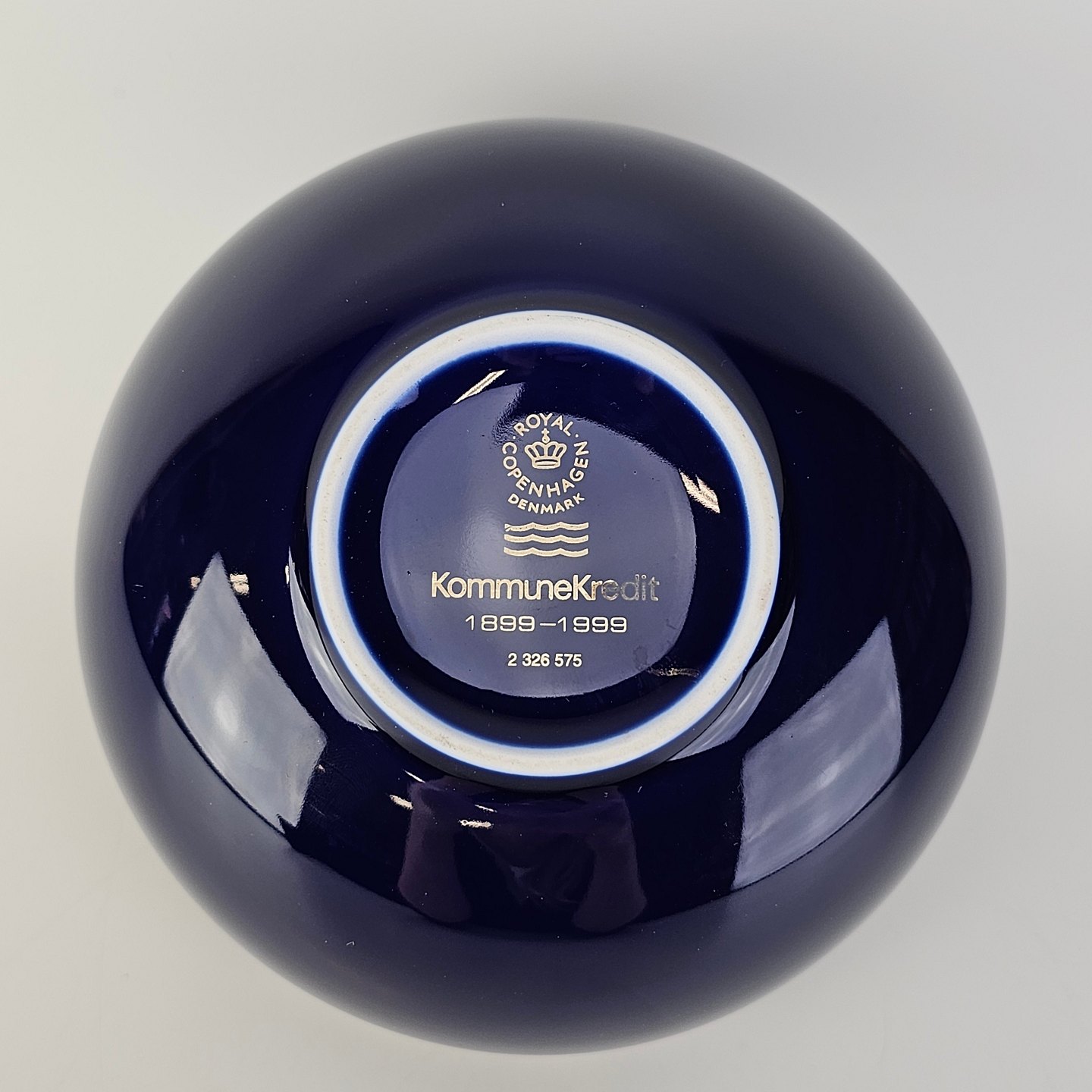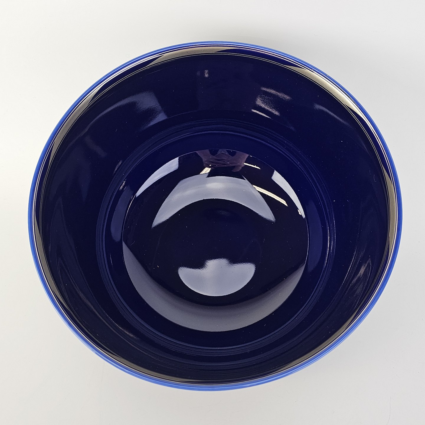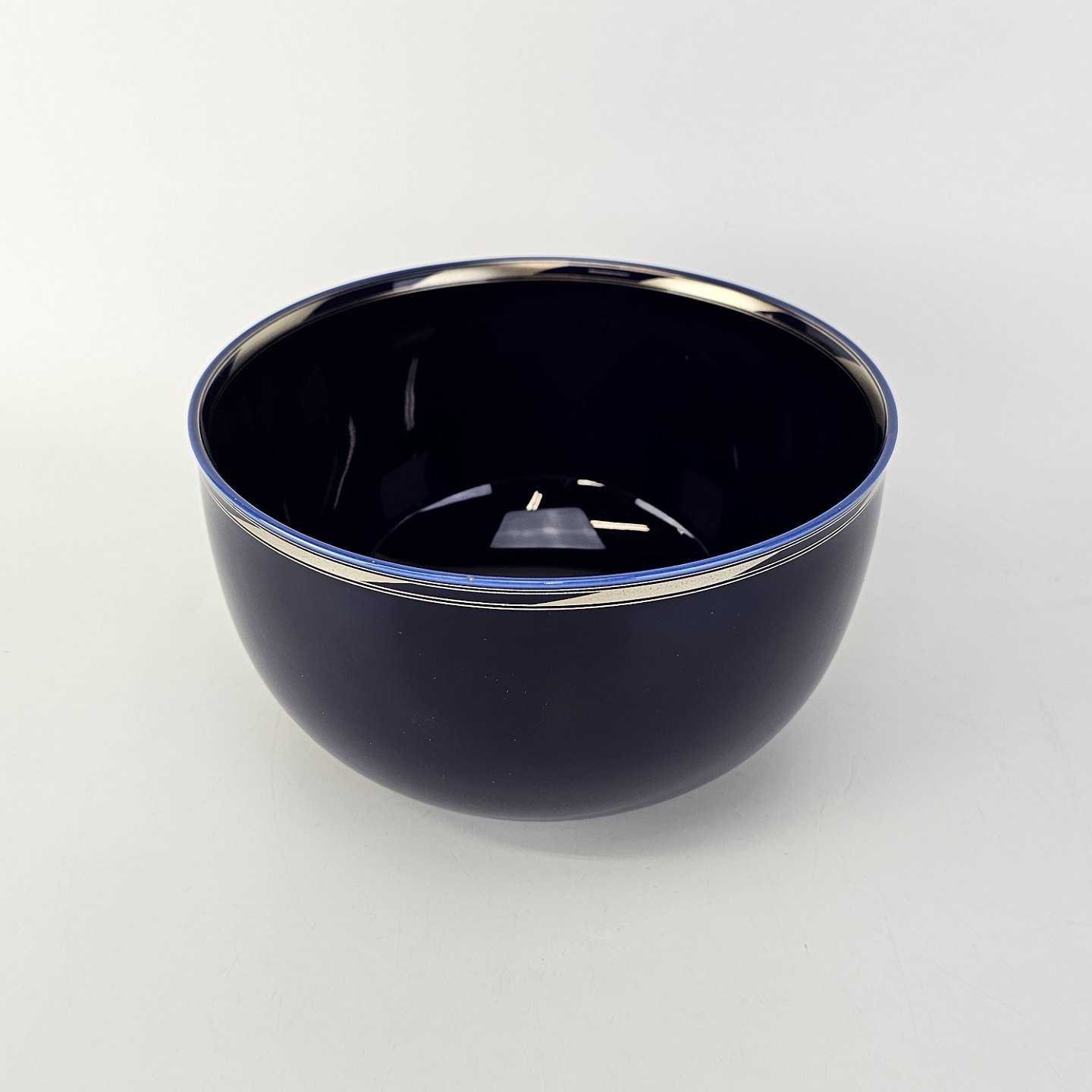 Beskrivelse: Blå skål i porcelæn med sølvkant