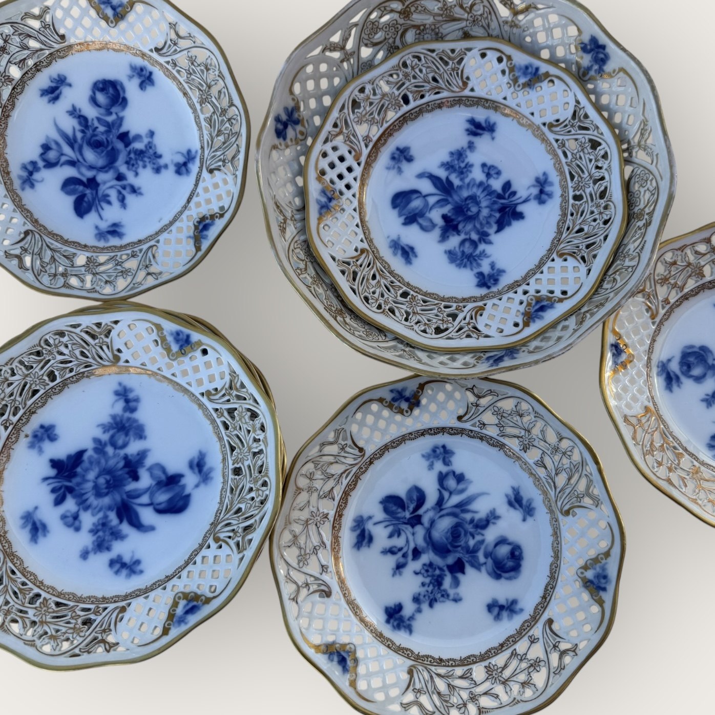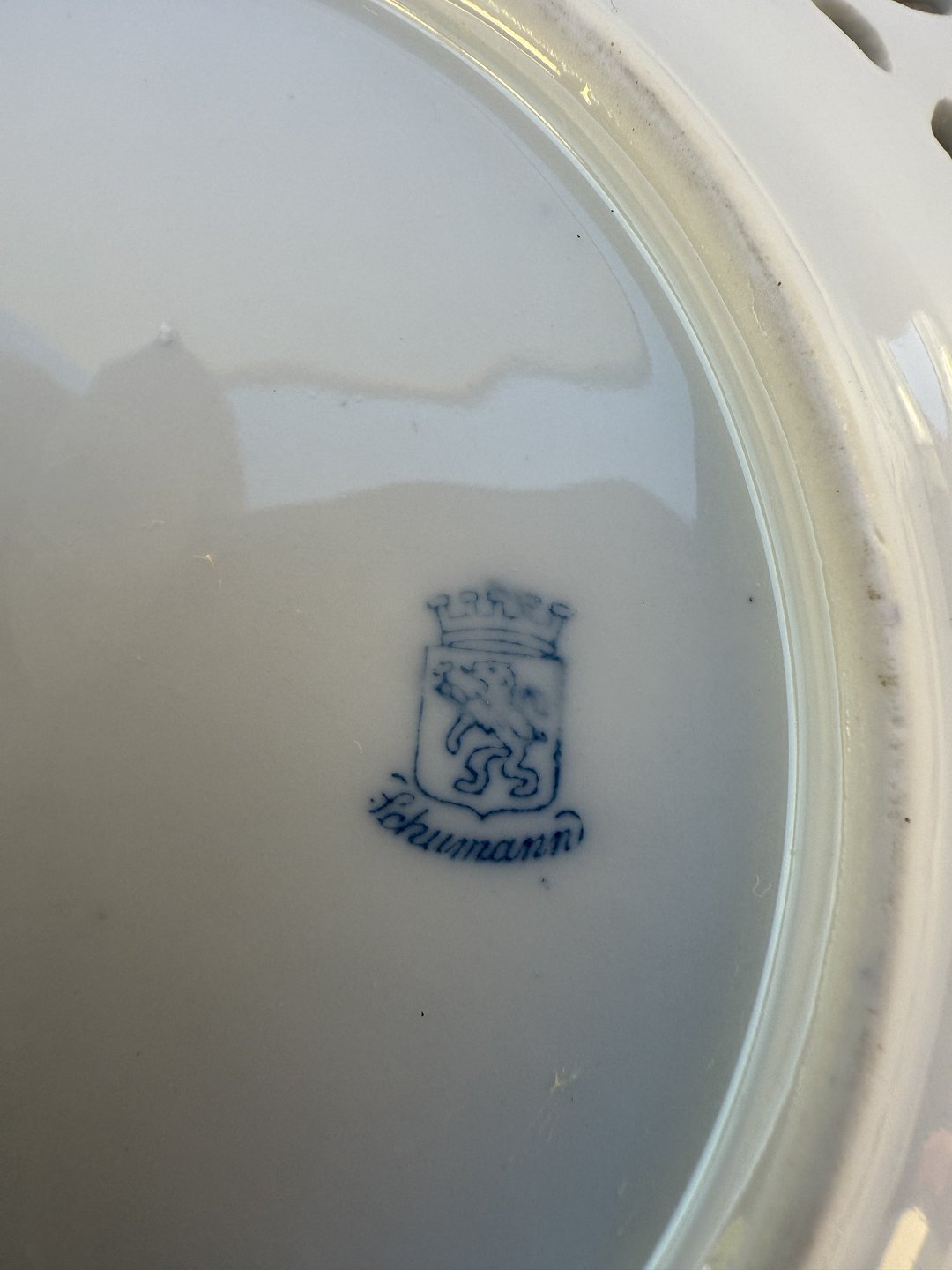 Beskrivelse: Schumann, Tyskland, Skål og 8 tallerkner med gennembrudt kant, lidt slid på skålens guldkant ellers pæn stand, Tallerken diameter 19cm, Skål diameter 23cm.