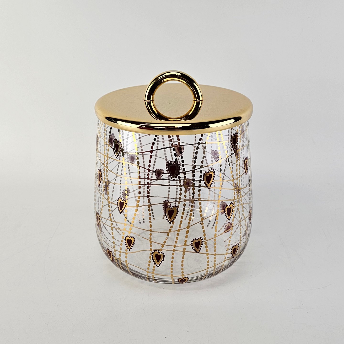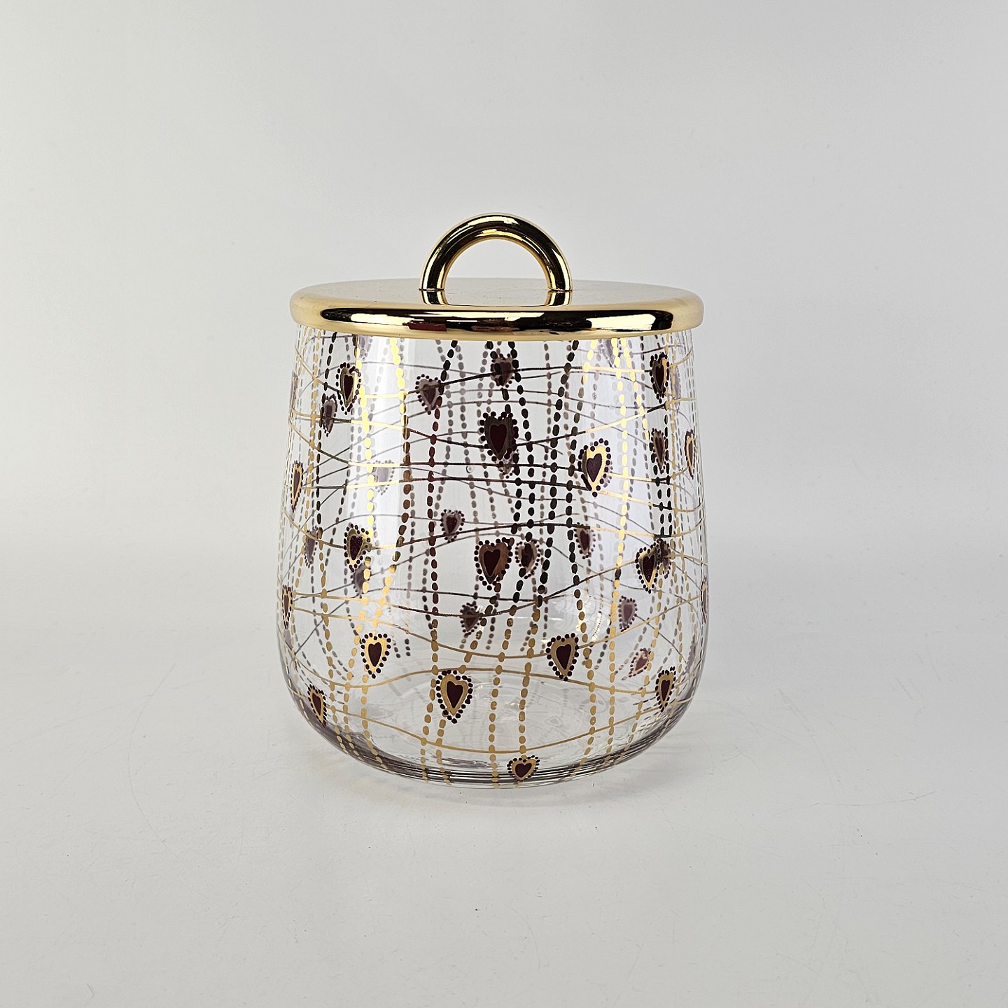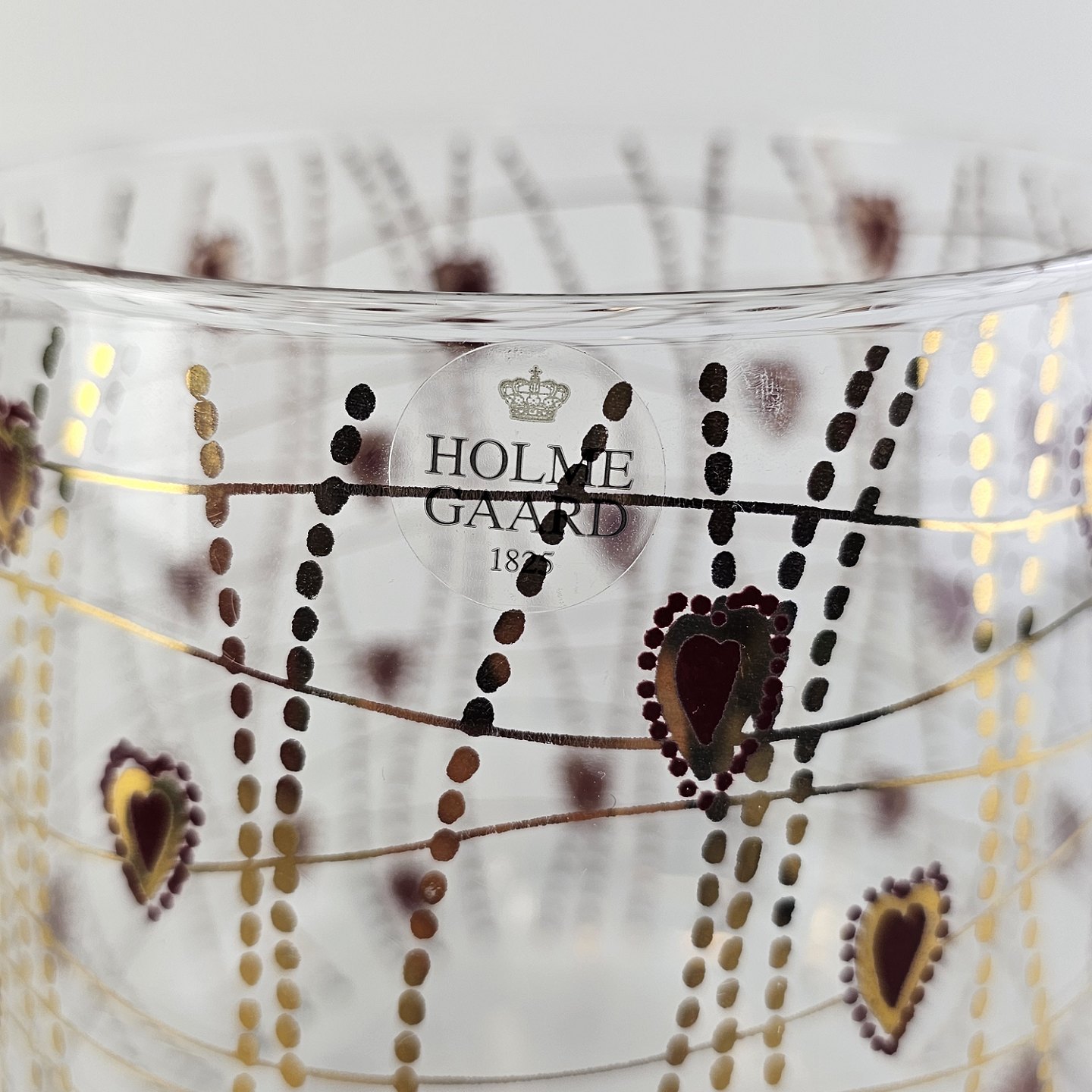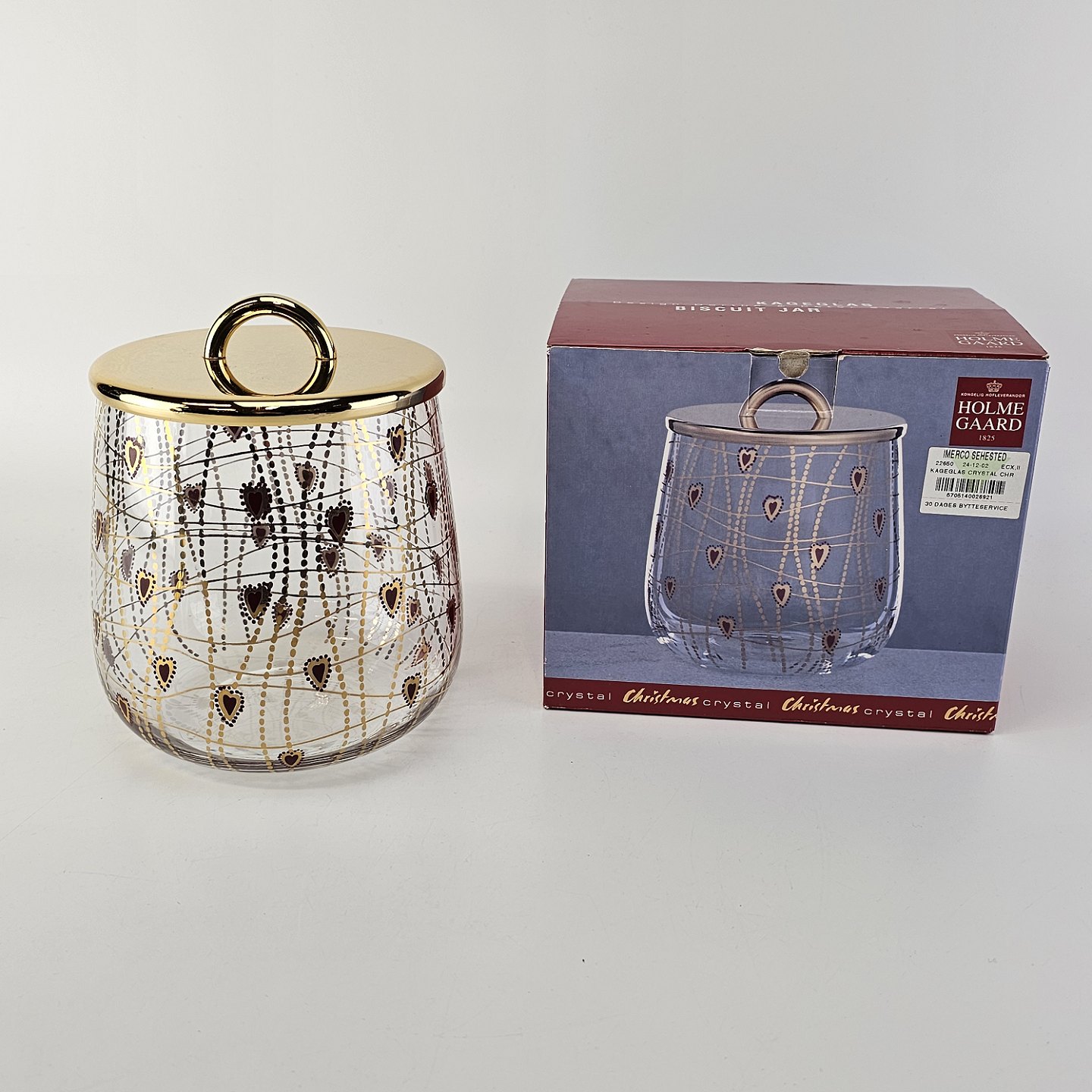 Beskrivelse: Kagedåse af glas med mønster af røde hjerter og guldstreger, og gyldent låg