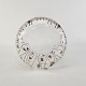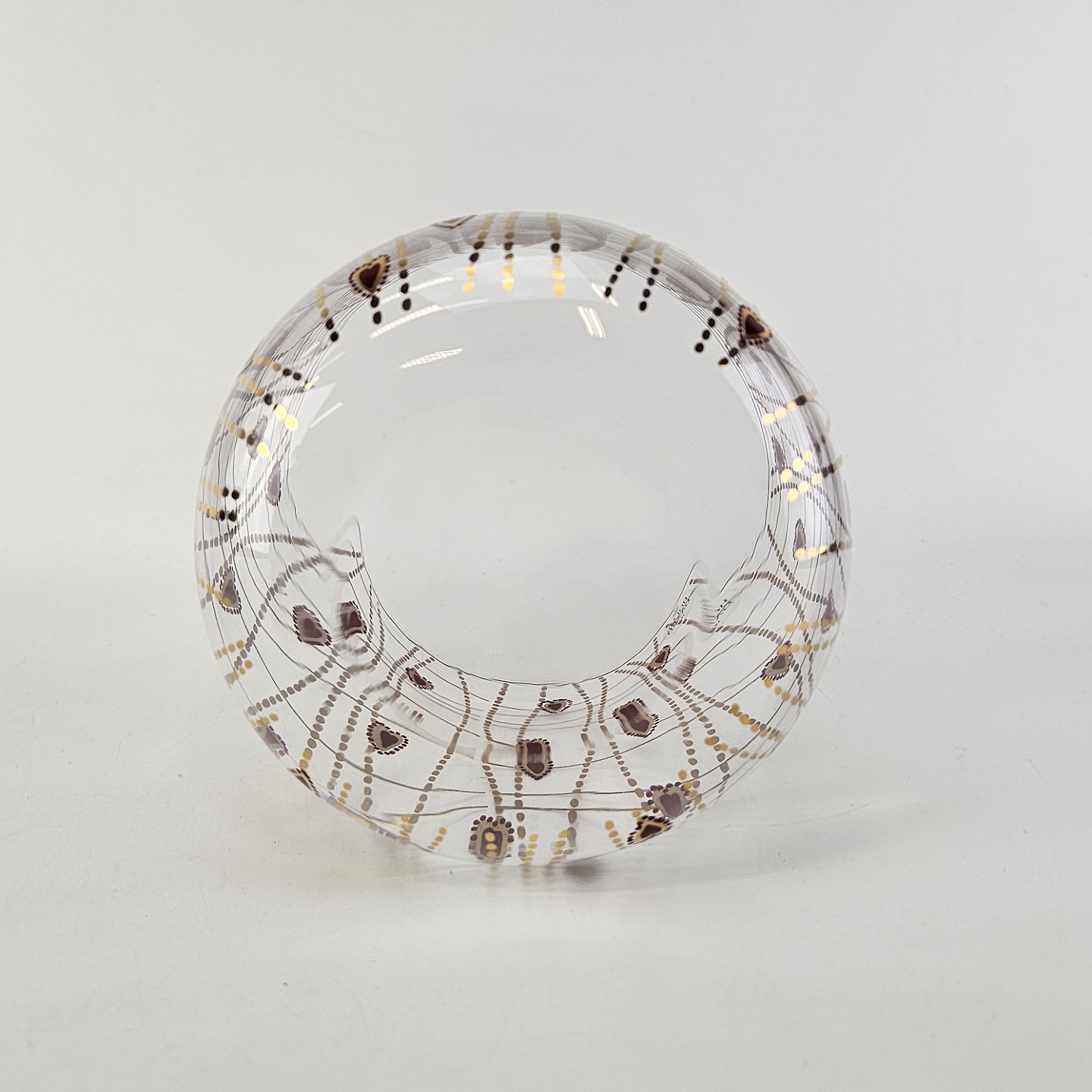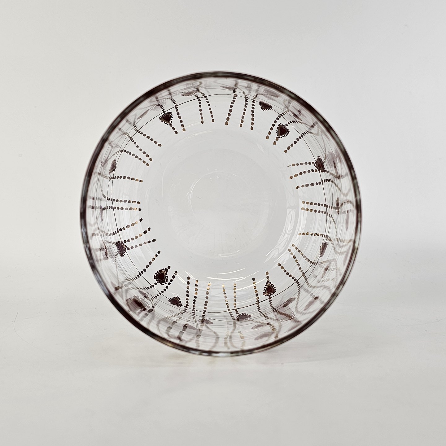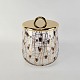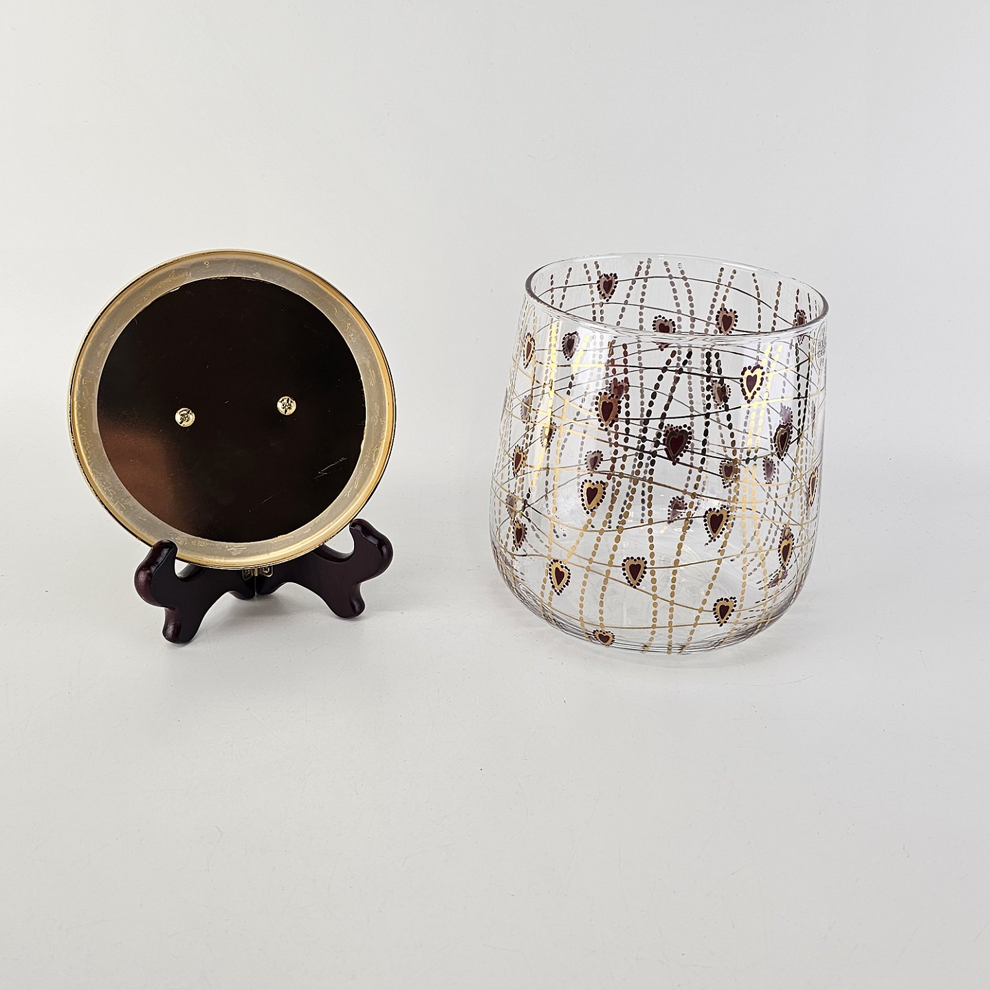 Beskrivelse: Kagedåse af glas med mønster af røde hjerter og guldstreger, og gyldent låg