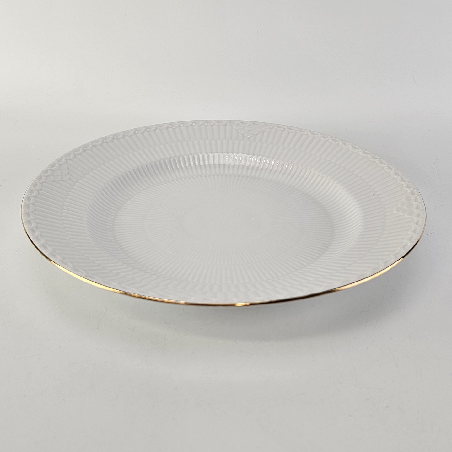 Beskrivelse: Middagstallerken i porcelæn fra stellet Hvid Halvblonde