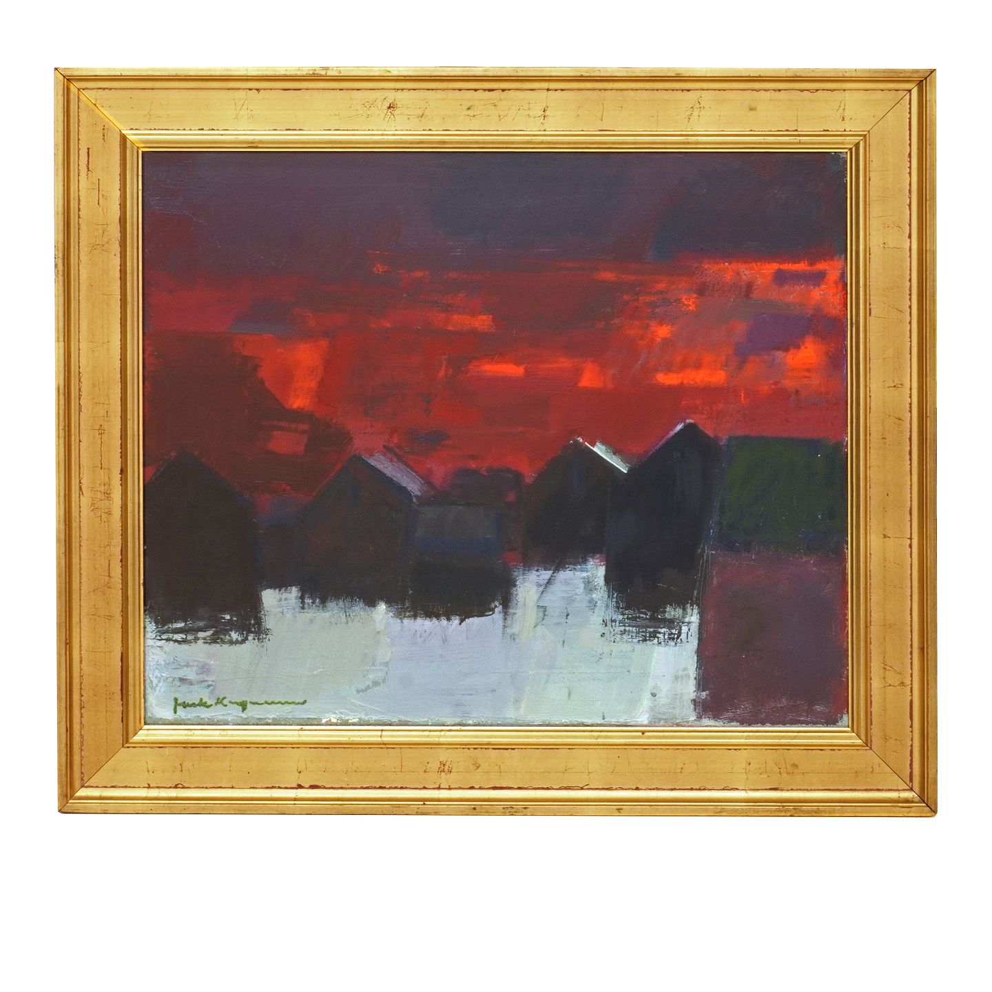 Jack Kampmann, 1914-89, maleri med motiv i form af solnedgang over bygd på Færøerne.