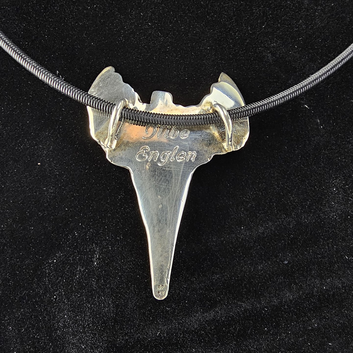 Beskrivelse: Halssmykke i sterling sølv med motiv af en abstrakt engel og læderrem, smykket er kaldet Nibe Englen