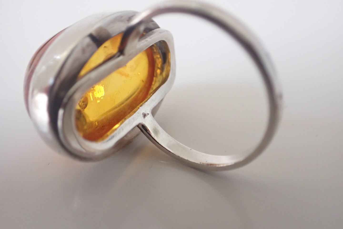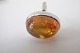 Beskrivelse: Sterling sølvring med cabochonsleben klart gult rav med indlejrede instekt/smådyr. Ravhuset. 1990.Utydeligt stempel. Str.: 56. Bredde på rav: 1,8 cm. Længde: 2,9 cm. Bredde ringskinne: 0,3 cm.