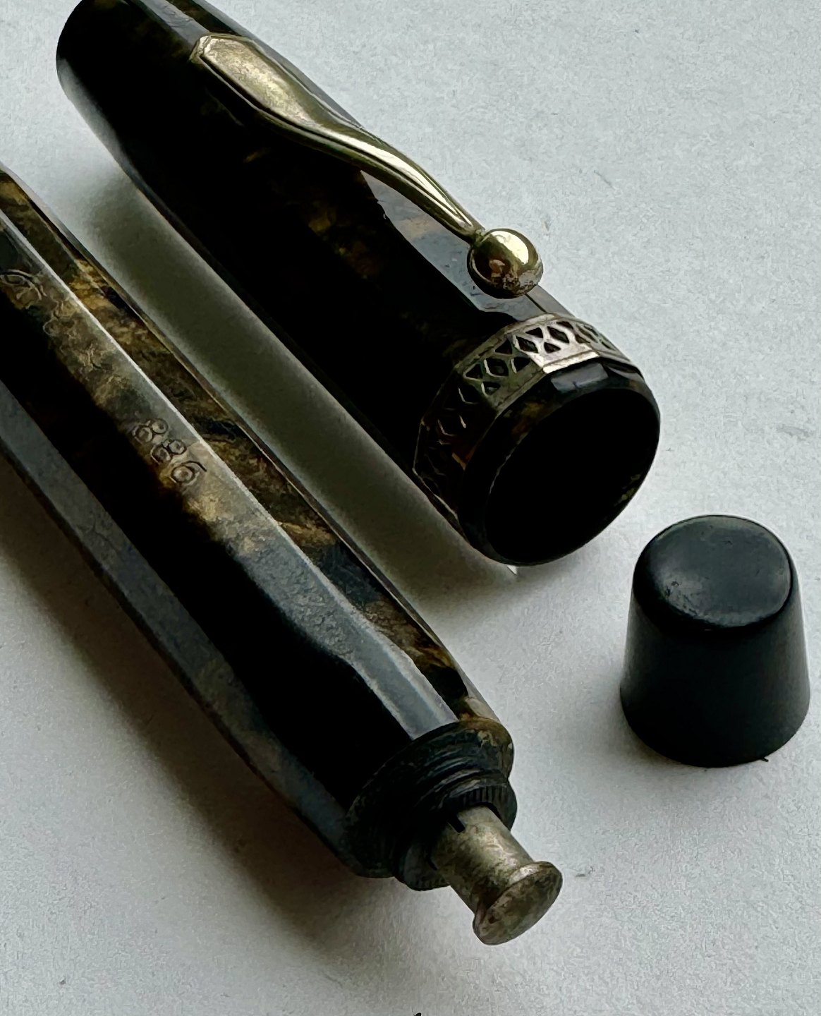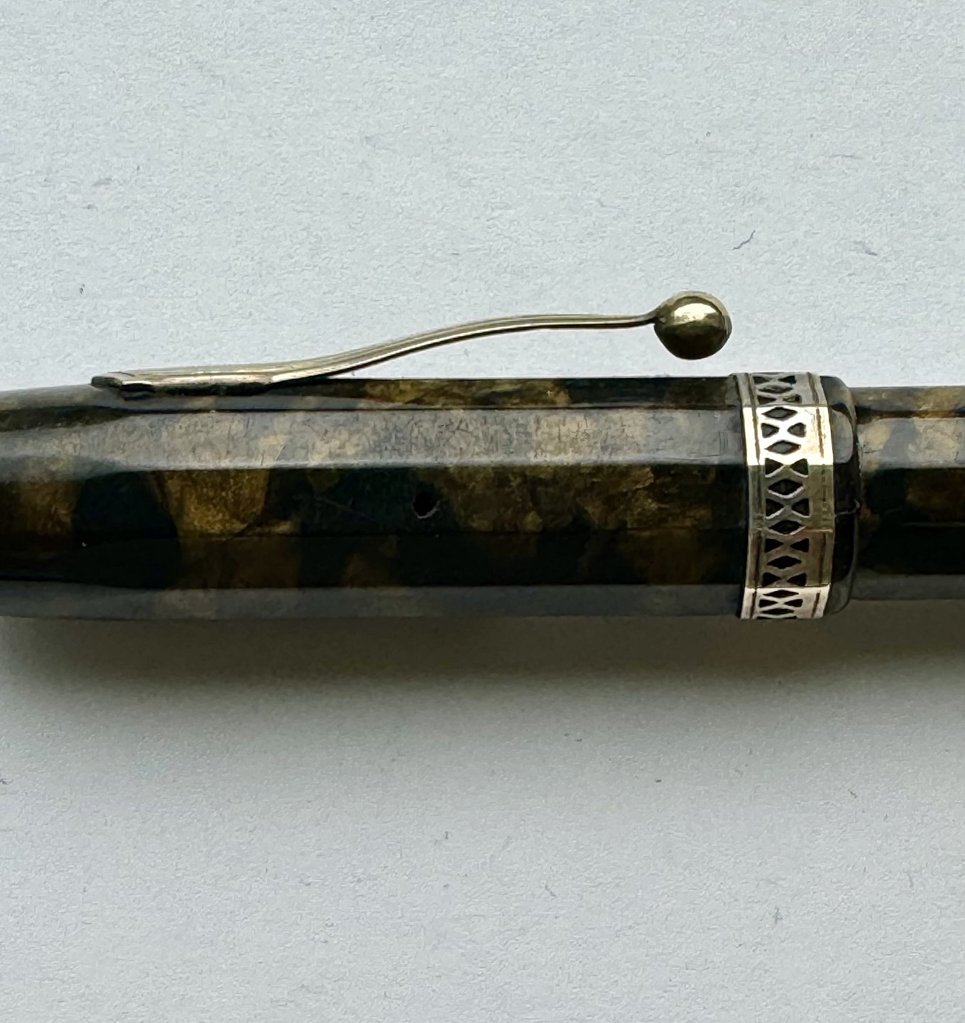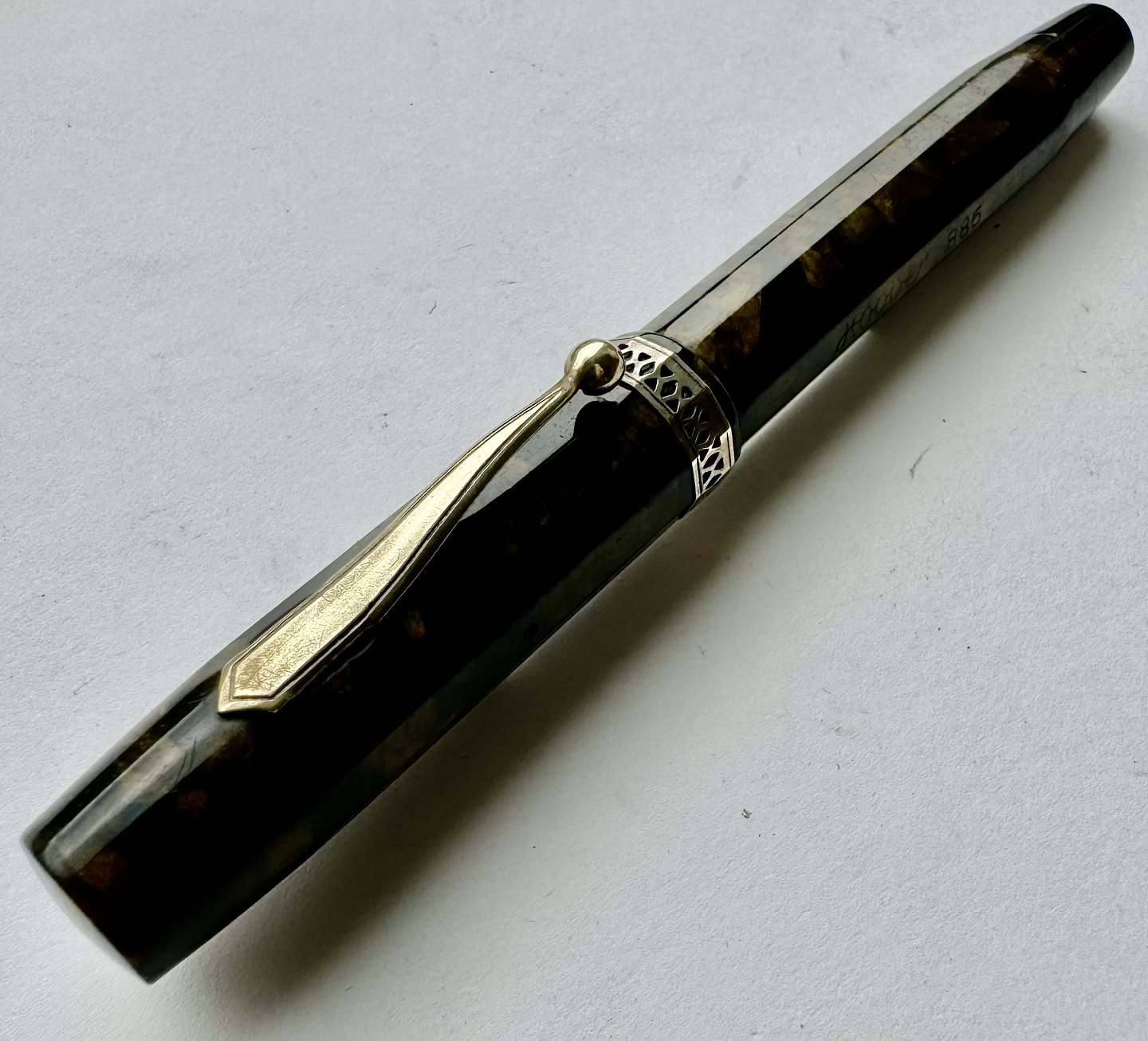 Beskrivelse: ART DECO STIL: 12-kantet brun/sort marmoreret Hoover 886 fyldepen fra 1930’erne. Fremstår i god stand uden skader eller reparationer. Alle dele originale PÅ NÆR en 14 karat guldspids fra Miller. Fungerer ikke. Der skal isættes ny gummisæk før end den er funktionsdygtig igen. Ny gummisæk isættes mod en betaling på kr. 250,- Denne fyldepen er 13 cm lang.