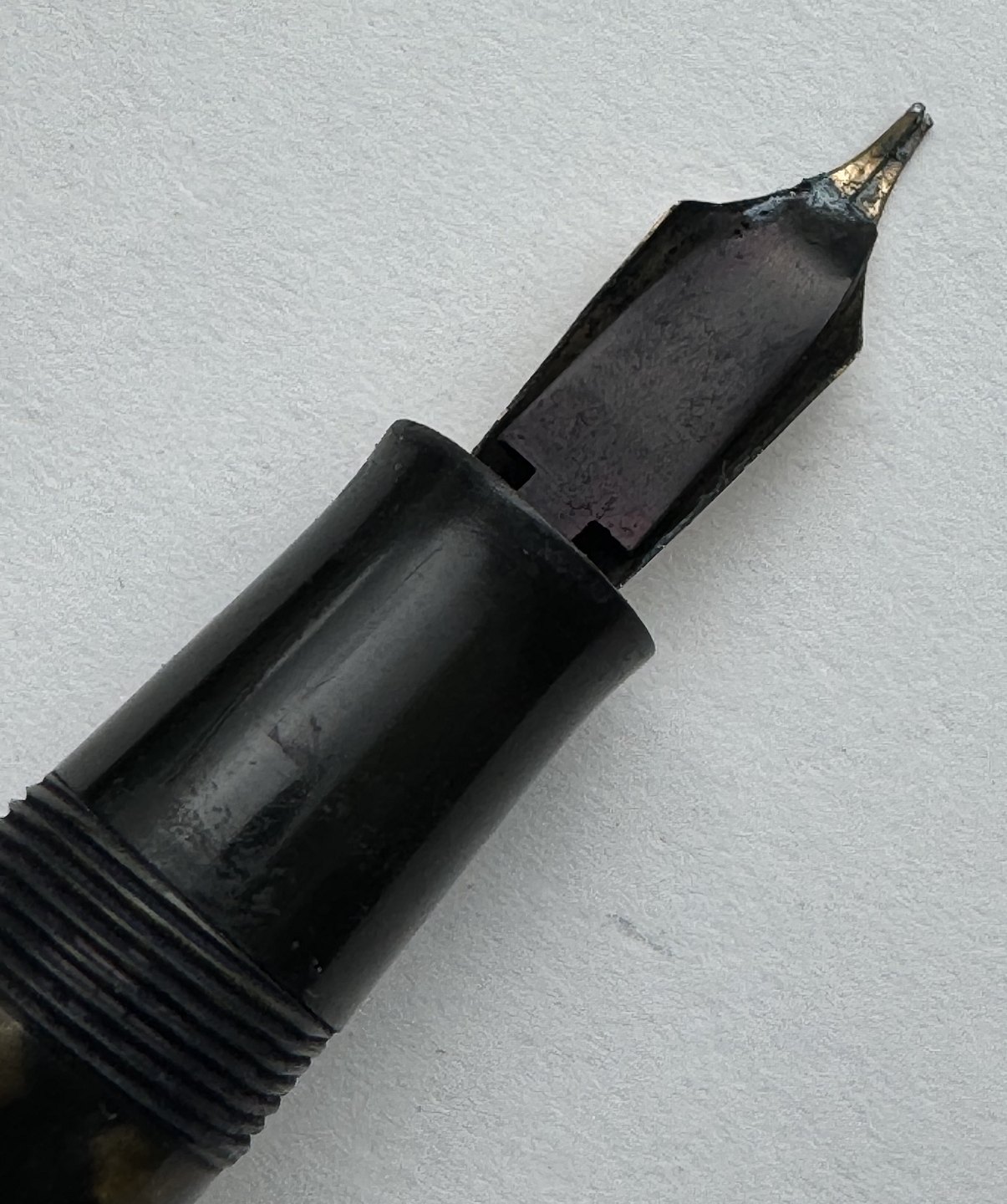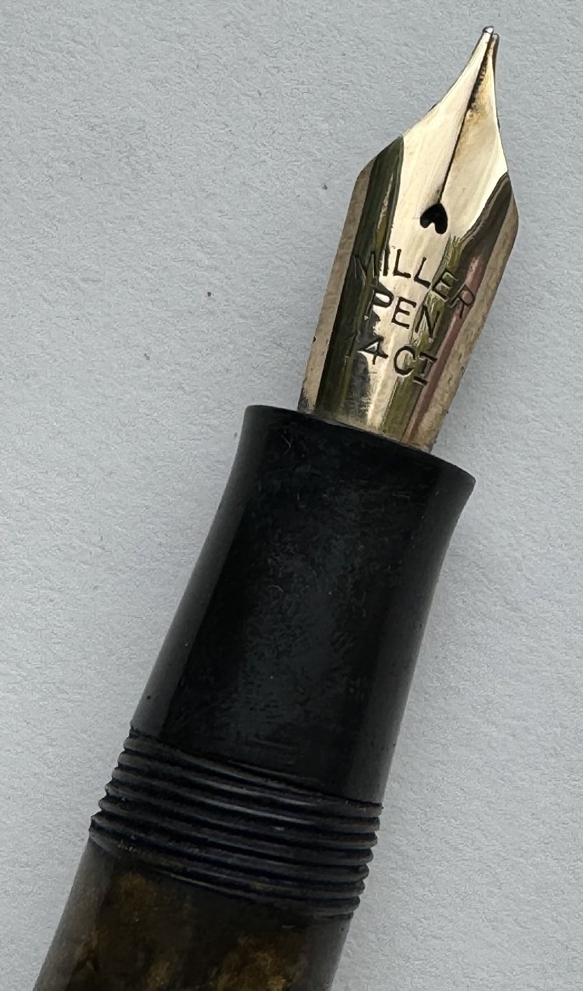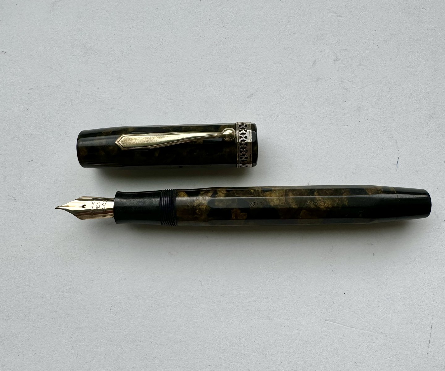 Beskrivelse: ART DECO STIL: 12-kantet brun/sort marmoreret Hoover 886 fyldepen fra 1930’erne. Fremstår i god stand uden skader eller reparationer. Alle dele originale PÅ NÆR en 14 karat guldspids fra Miller. Fungerer ikke. Der skal isættes ny gummisæk før end den er funktionsdygtig igen. Ny gummisæk isættes mod en betaling på kr. 250,- Denne fyldepen er 13 cm lang.