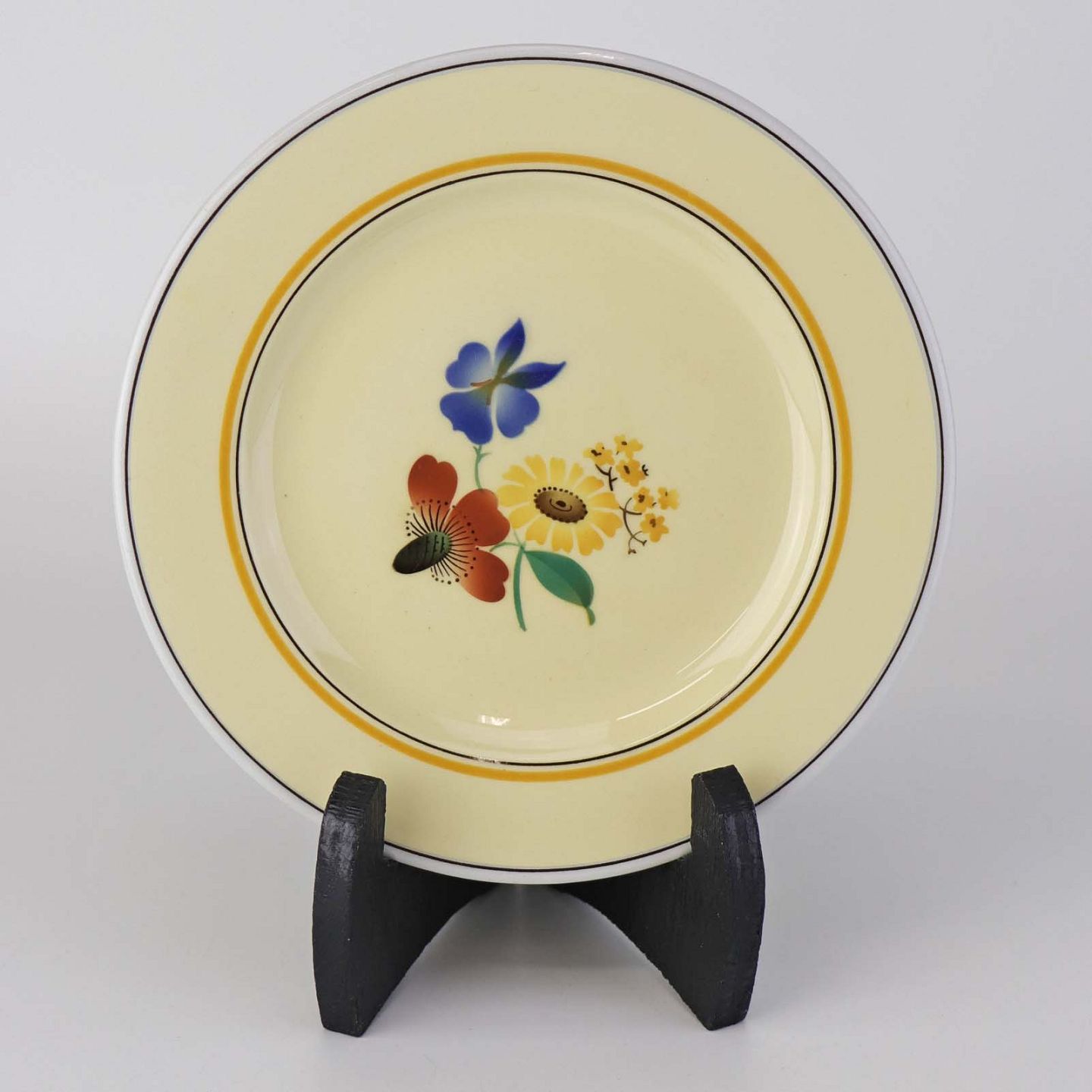 Stel i glat gul fajance med dekoration af farverige og forskelligartede blomster samt med gul og sort kantstreg.