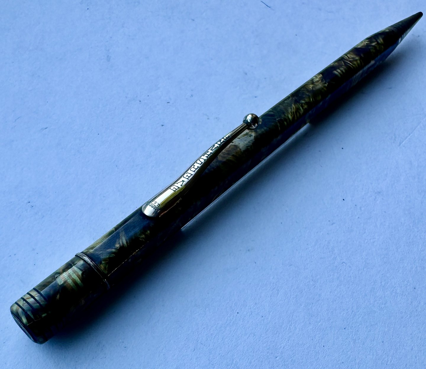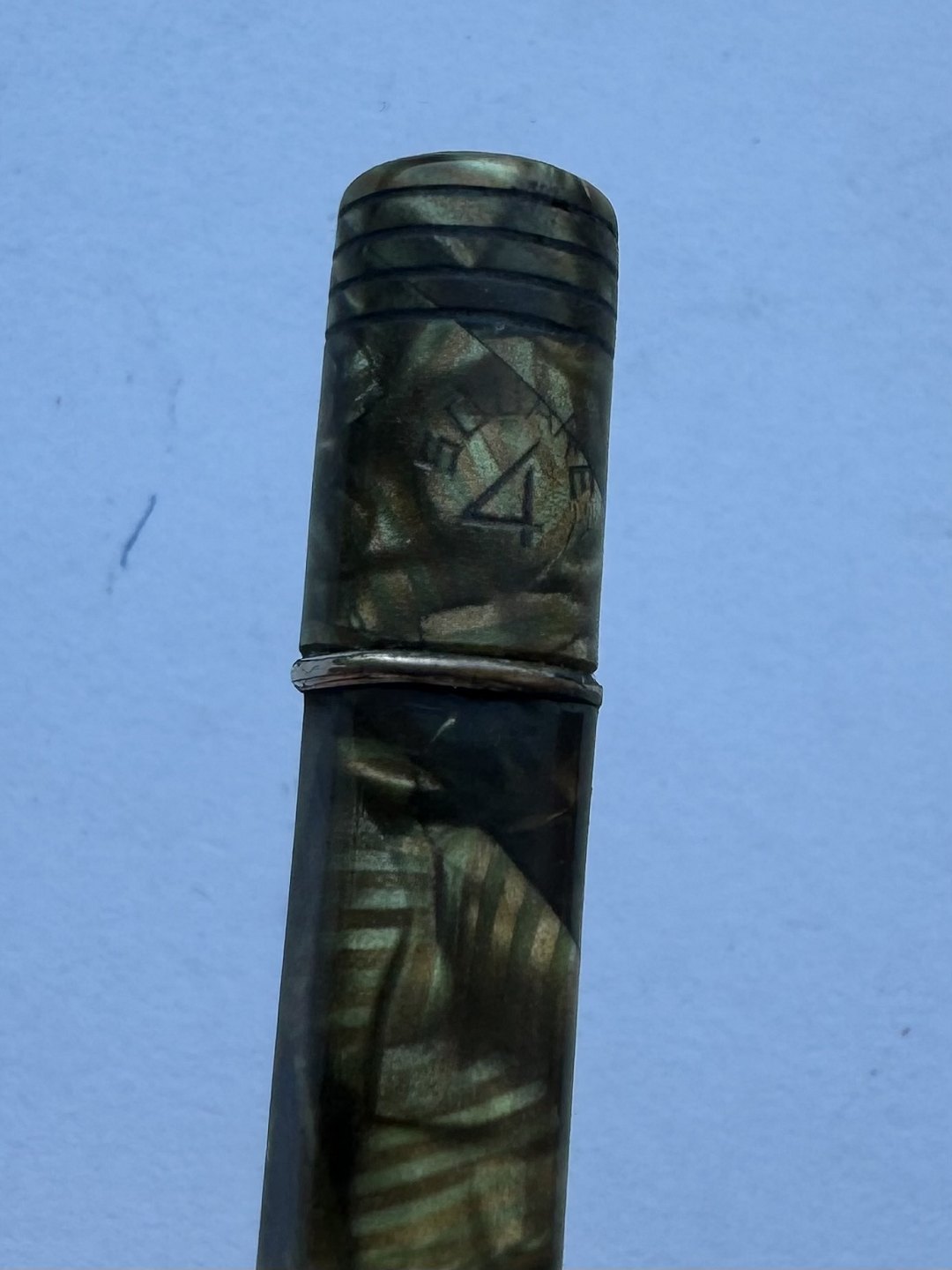 Beskrivelse: Lang slank fire-siddet “4 Square” grøn marmoreret Wahl Eversharp fra 1930’erne. Klar til at blive brugt. Ingen skader eller reparationer. Mål: 15,2 cm lang.