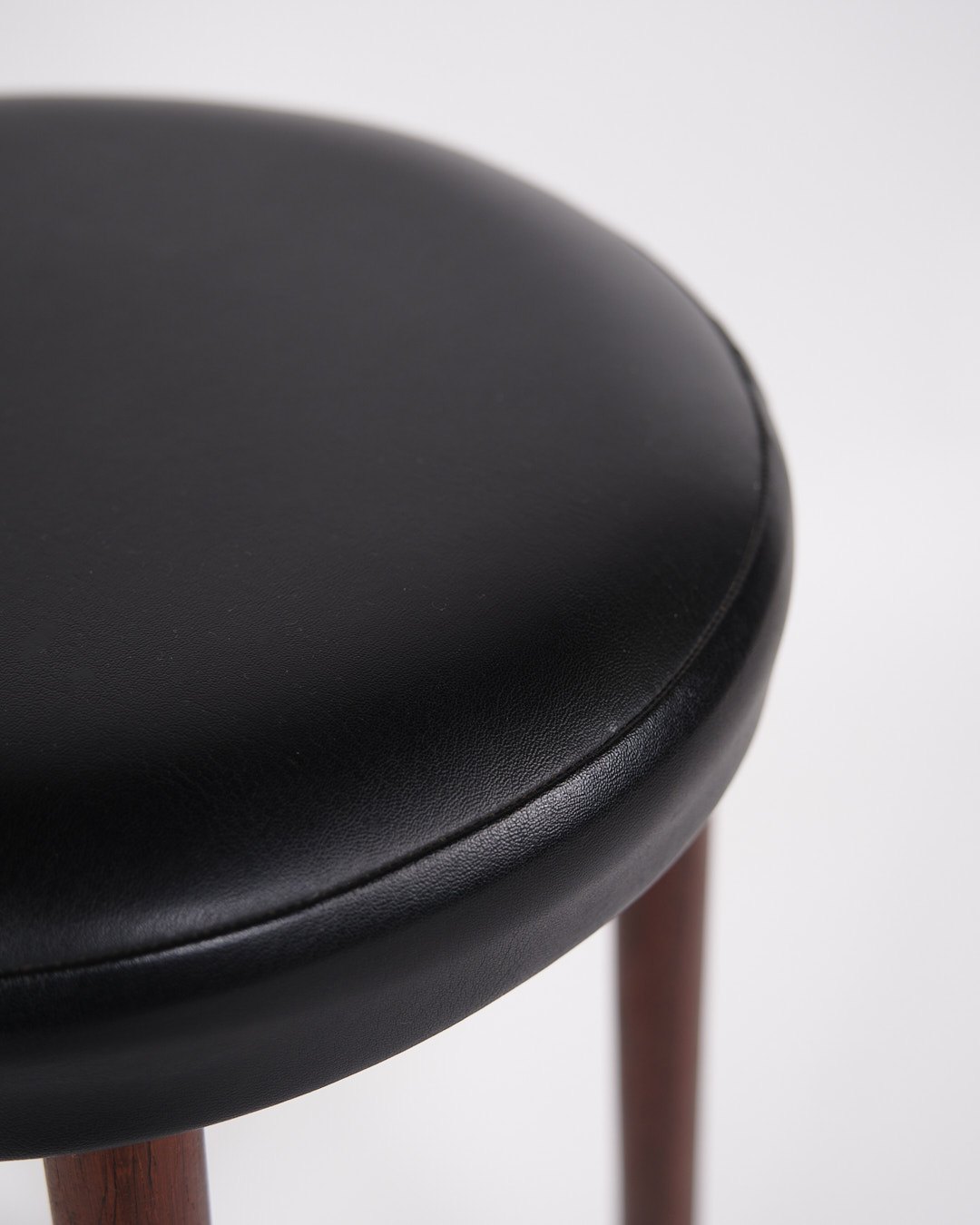 Description: Danish bar stool from the 1970s. Rosewood with black leather seat. Classic Danish Design.