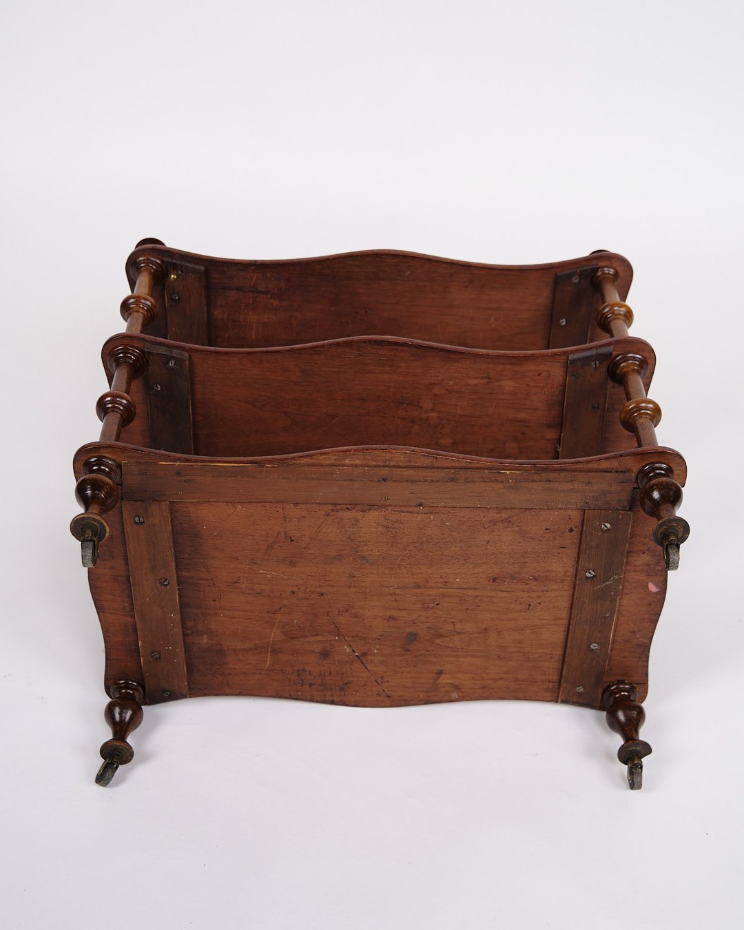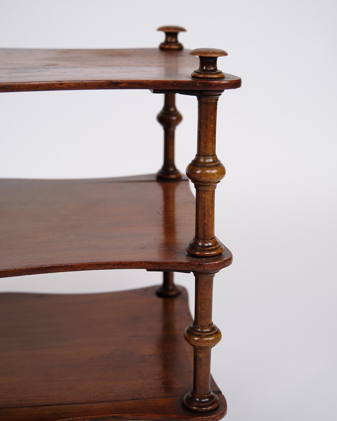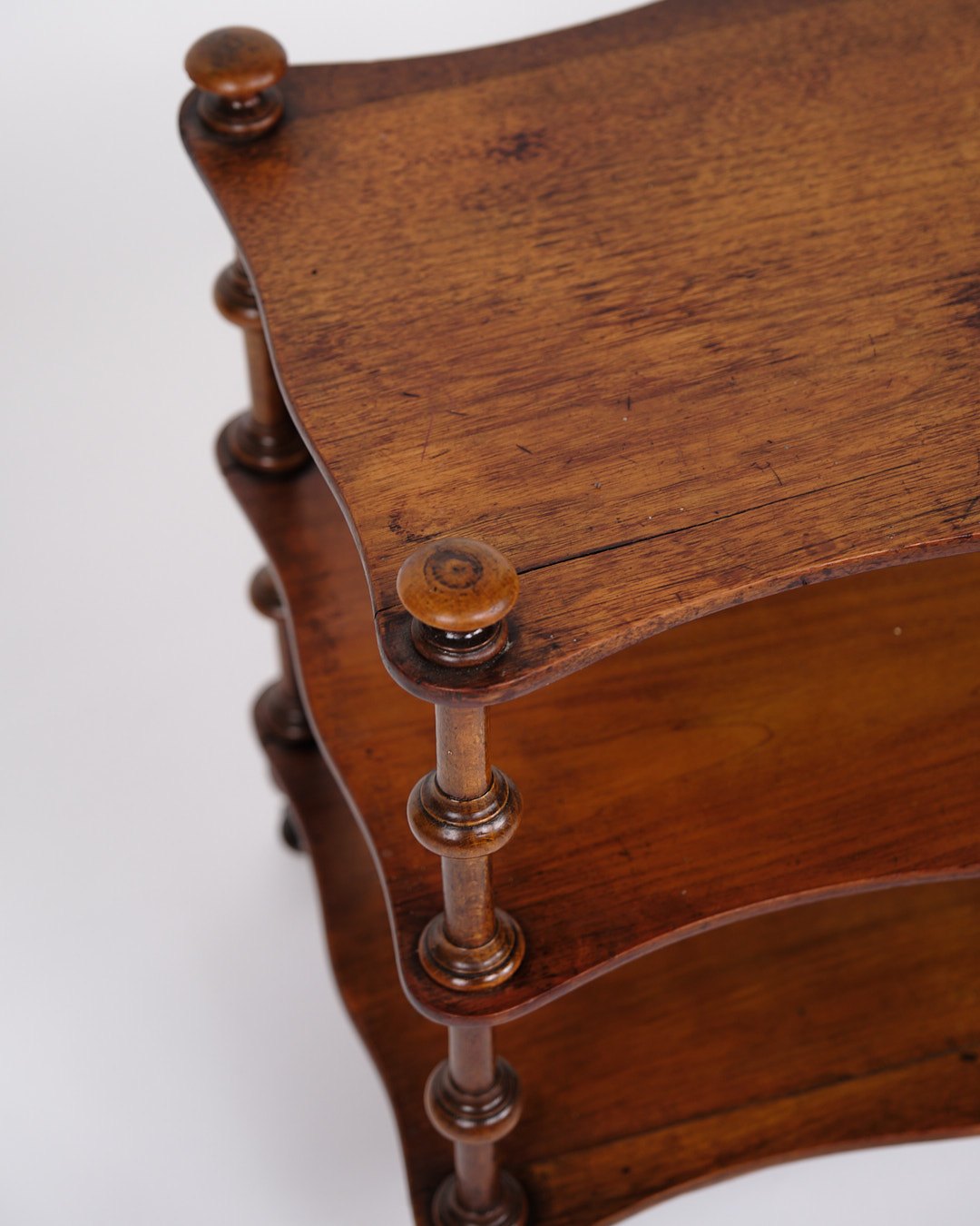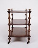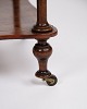 Beskrivelse: etagere/reol fra 1800-tallet, udført i mahogni. Møblet er indrettet med tre hylder og detaljerede drejede søjler. Nederst er det monteret med små hjul, hvilket giver både funktionalitet og mobilitet.