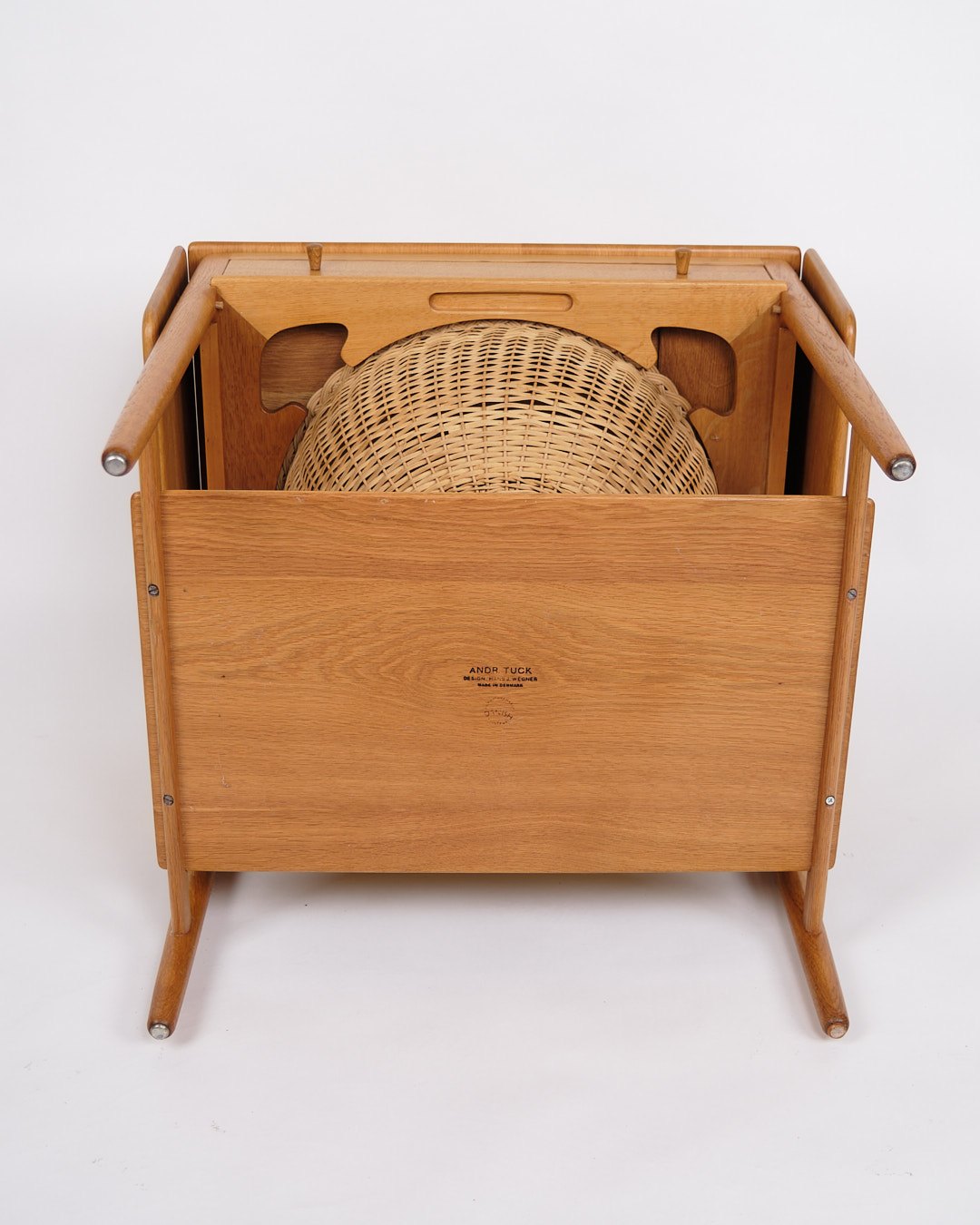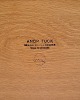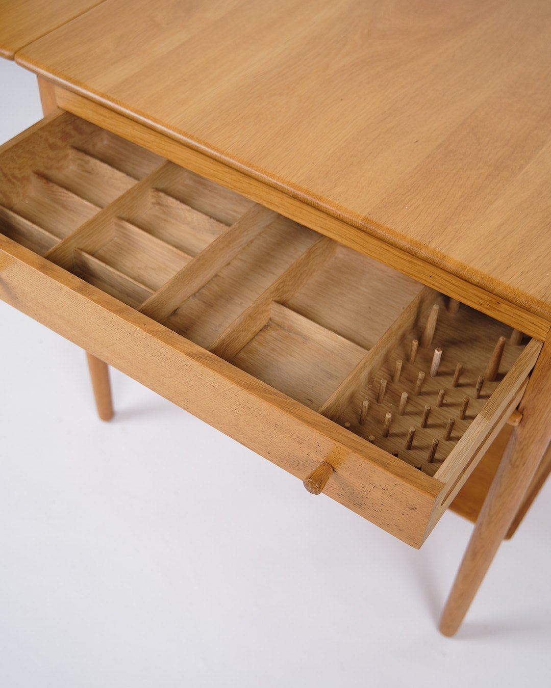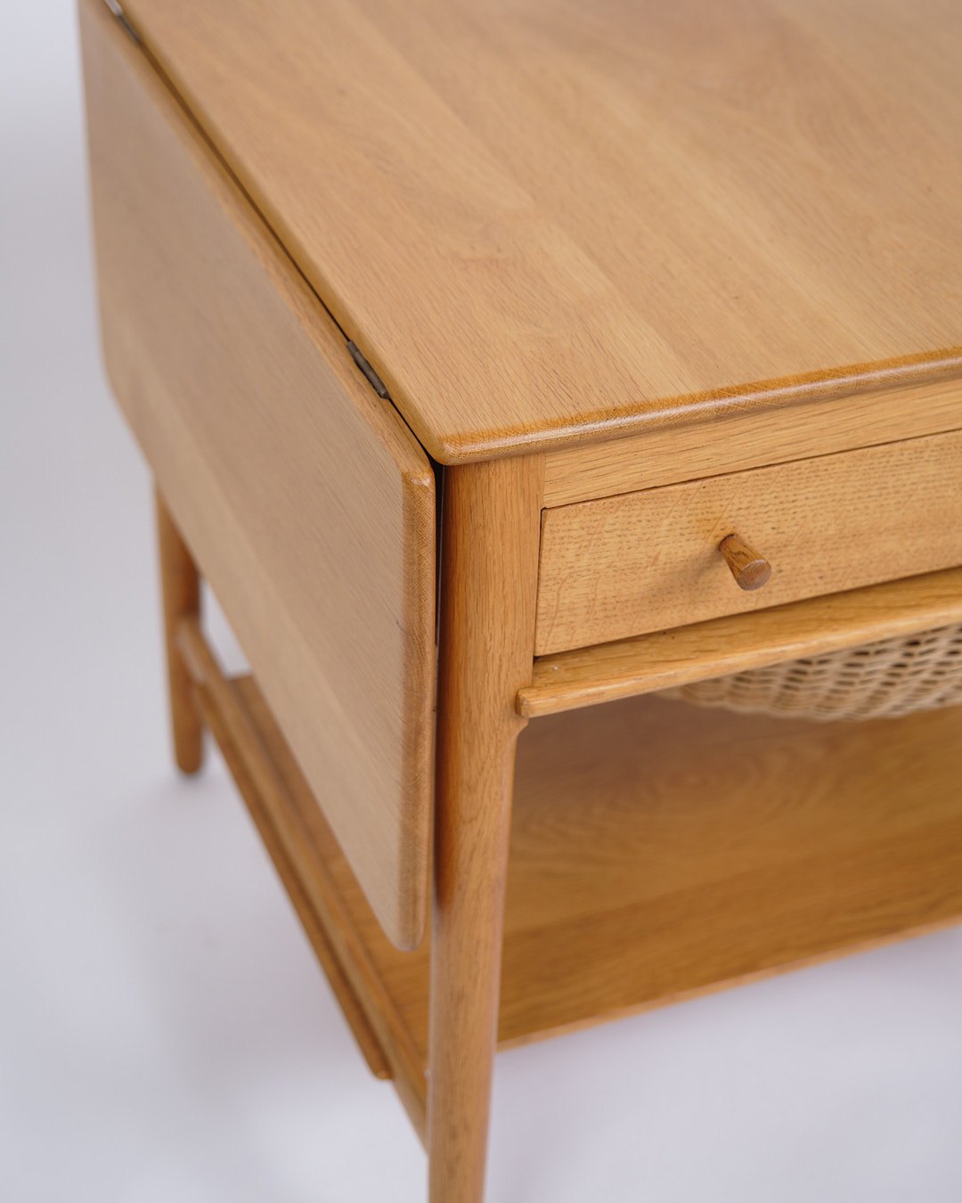 Beskrivelse: Sybord, model AT-33, designet af Hans J. Wegner og produceret af Andreas Tuck i 1950’erne. Bordet er udført i sæbebehandlet egetræ og indrettet med en praktisk hylde. Bordpladen kan udvides fra 64,5 cm til 118,5 cm, hvilket gør det både fleksibelt og funktionelt.