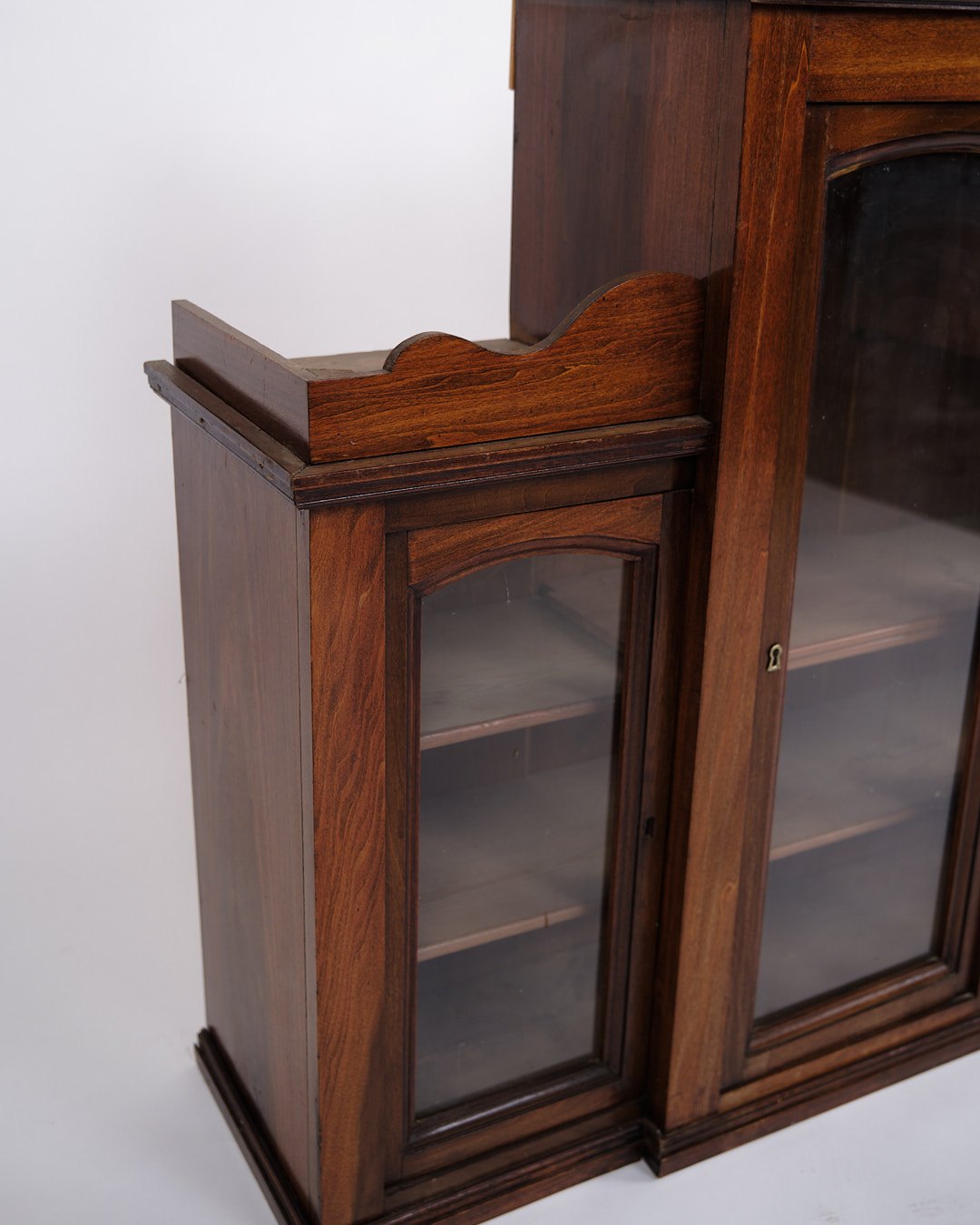 Beskrivelse: væghængt vitrineskab fra 1890’erne, udført i håndpoleret mahogni. Skabet har klassiske proportioner og fremstår med et tidstypisk design fra slutningen af 1800-tallet, hvor funktionalitet og dekorativt udtryk gik hånd i hånd.